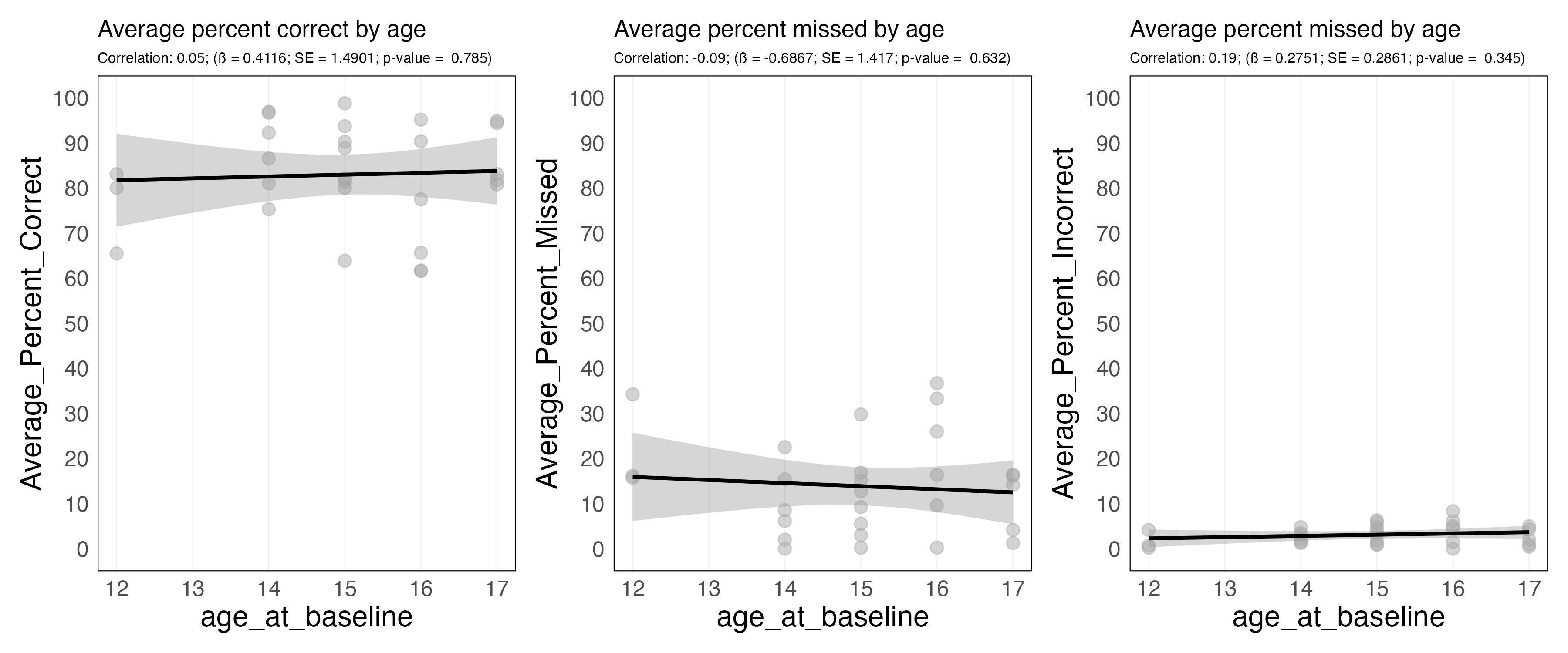 It is important to note that we do not have a uniform distribution of age in the present sample. All the the subjects (with the exception of 3) are between the ages of 14 and 17. We therefor only have a tight age range to examine, which may limit our ability to observe age effects.
