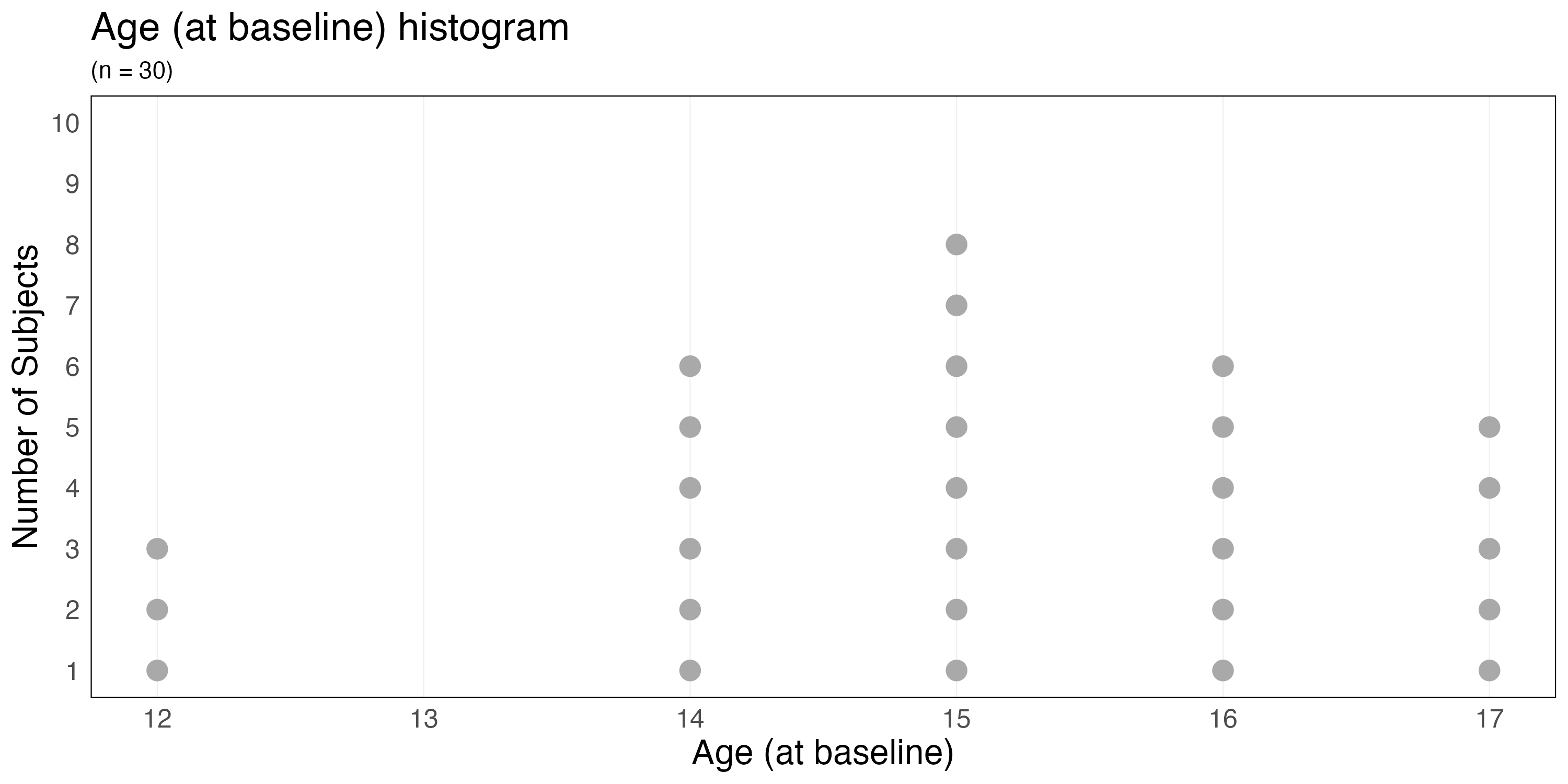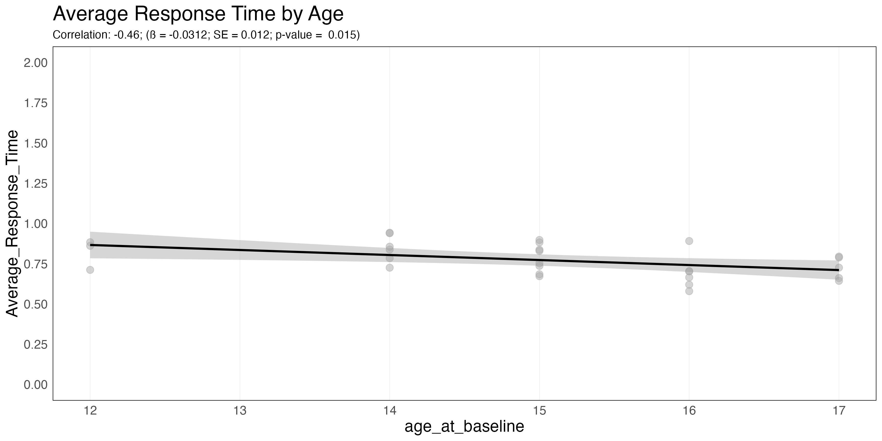 Age at Baseline: The age of subjects when they first initiated the study. Subjects had aged one year once they had completed all 12 sessions of the study. We will not examine within subject age effects in this analysis, as they will likely be conflated with other time-related effects such as learning and habituation.