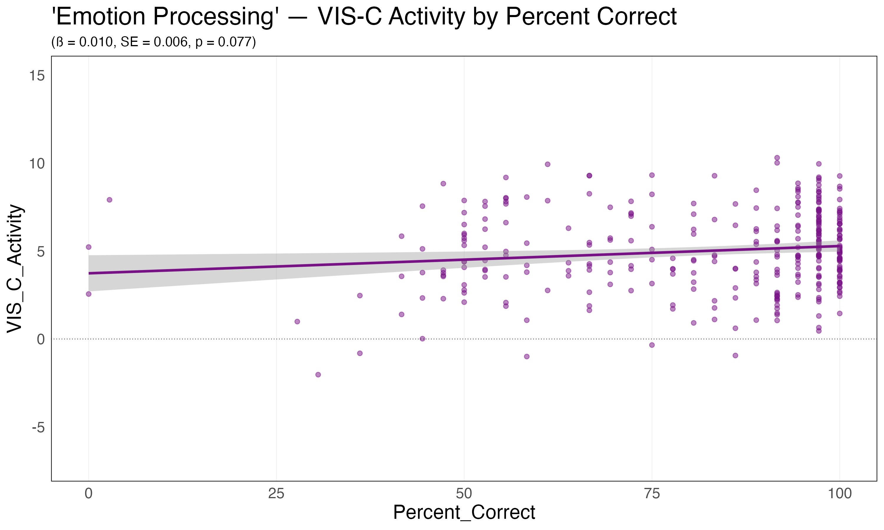 Visual-Central Network (VIS-C). Visual-central network (VIS-C) activity exhibited a slight positive association with task accuracy, but this association was not meaningfully significant (b = 0.010, SE = 0.006, p = 0.077).