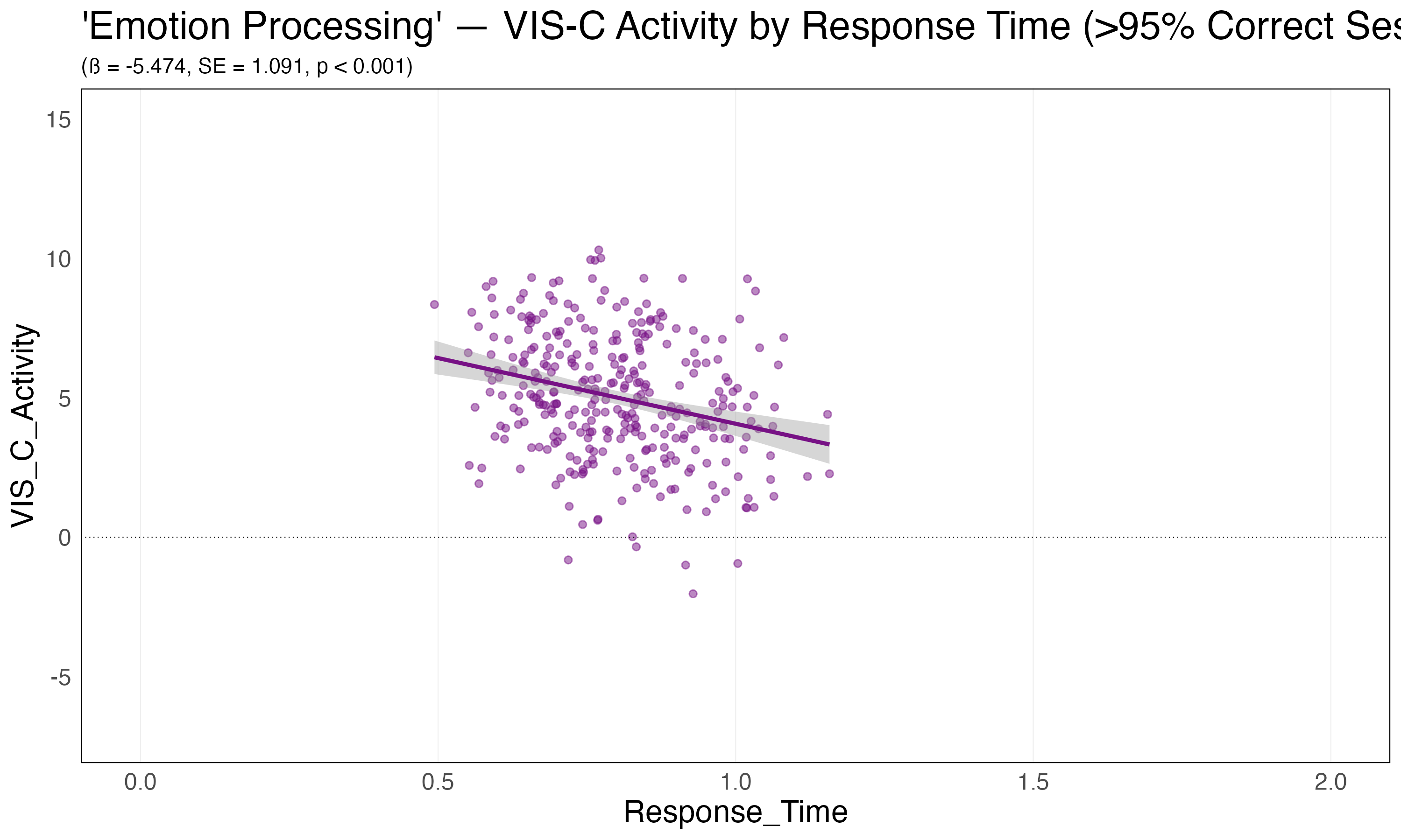 Visual-Central Network (VIS-C). Visual-central network (VIS-C) activity also exhibited significant negative association with response time (b = -5.5, SE = 1.091, p < 0.001).