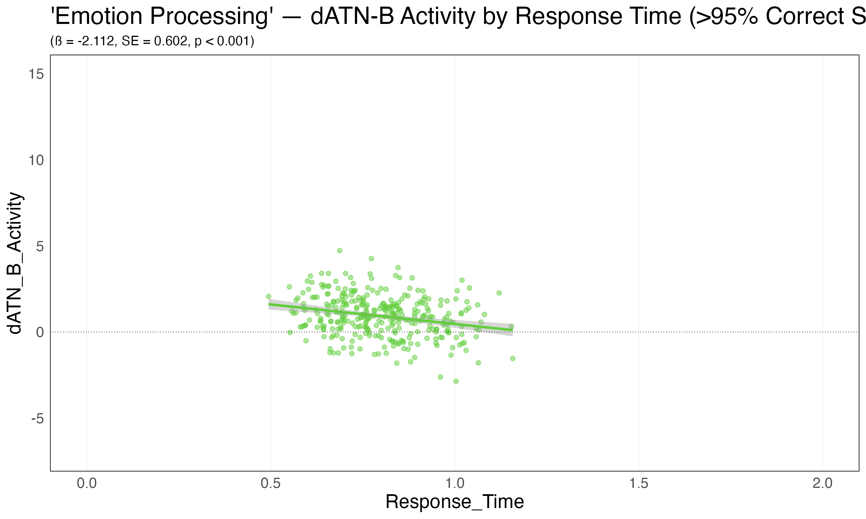 Dorsal Attention Network B (dATN-B). Dorsal attention network B (dATN-B) activity also exhibited significant negative association with response time (b = -2.1, SE = 0.60, p < 0.001).