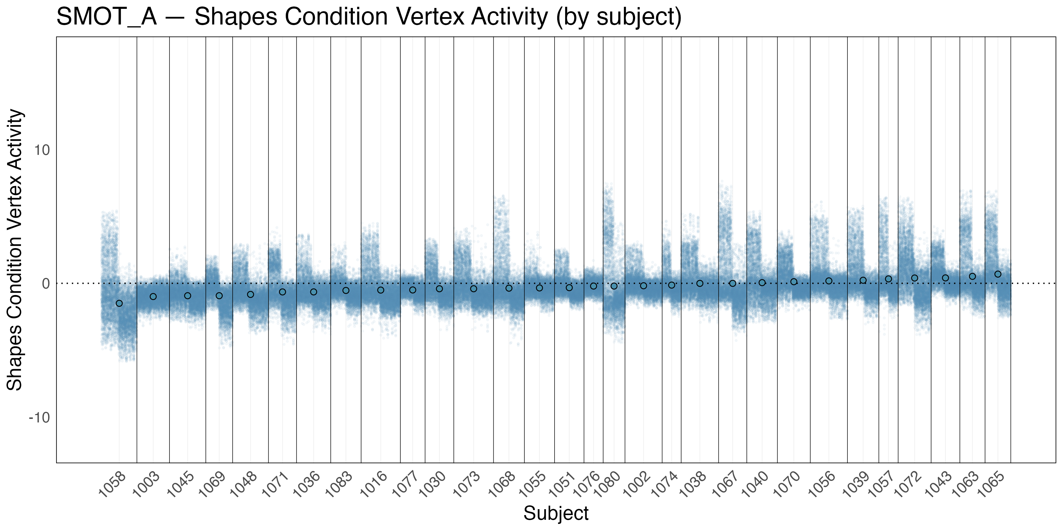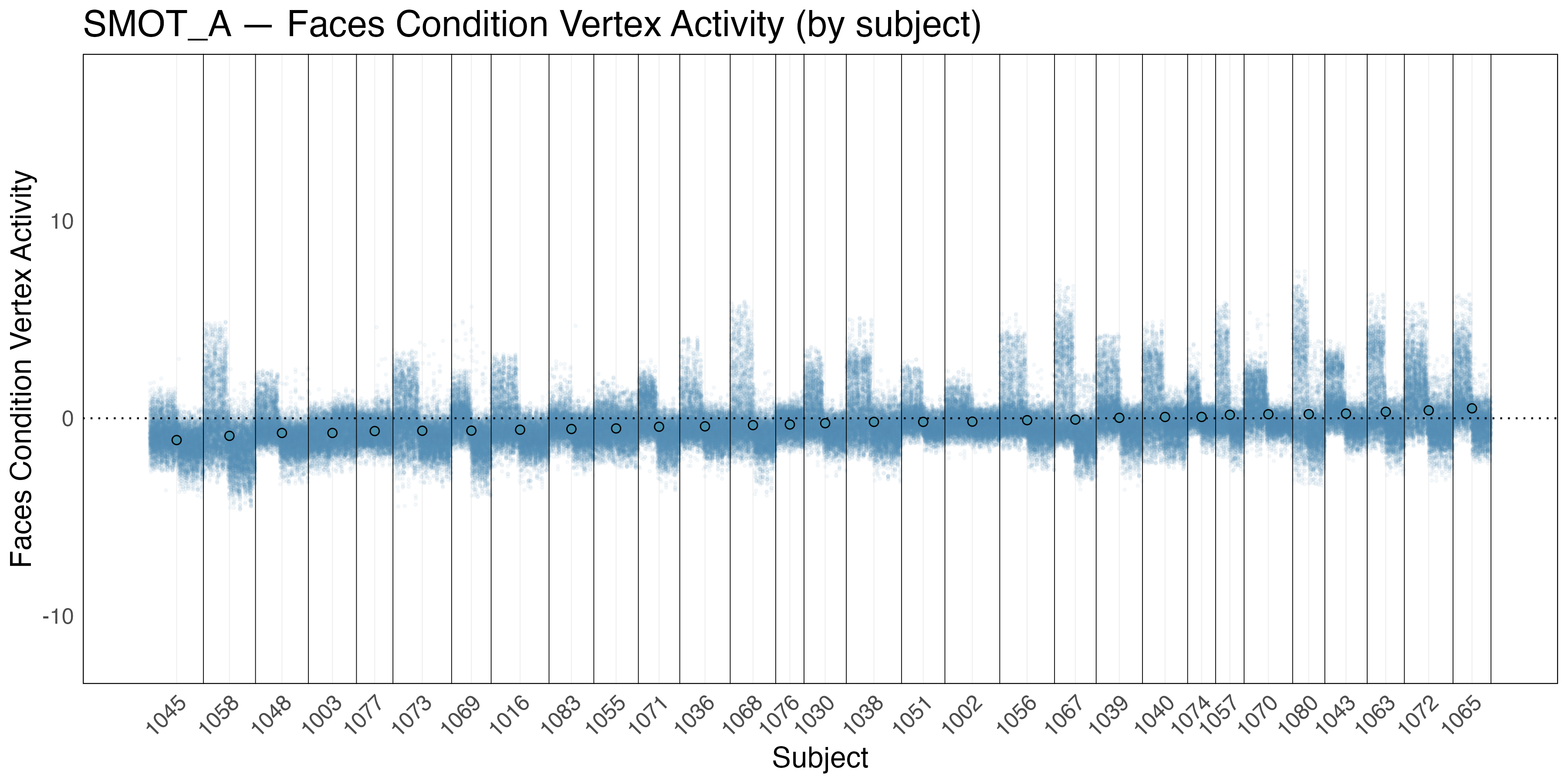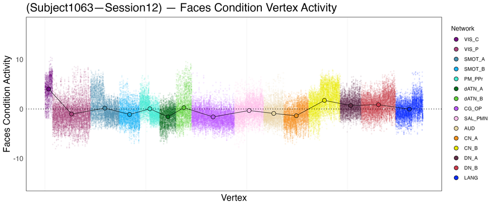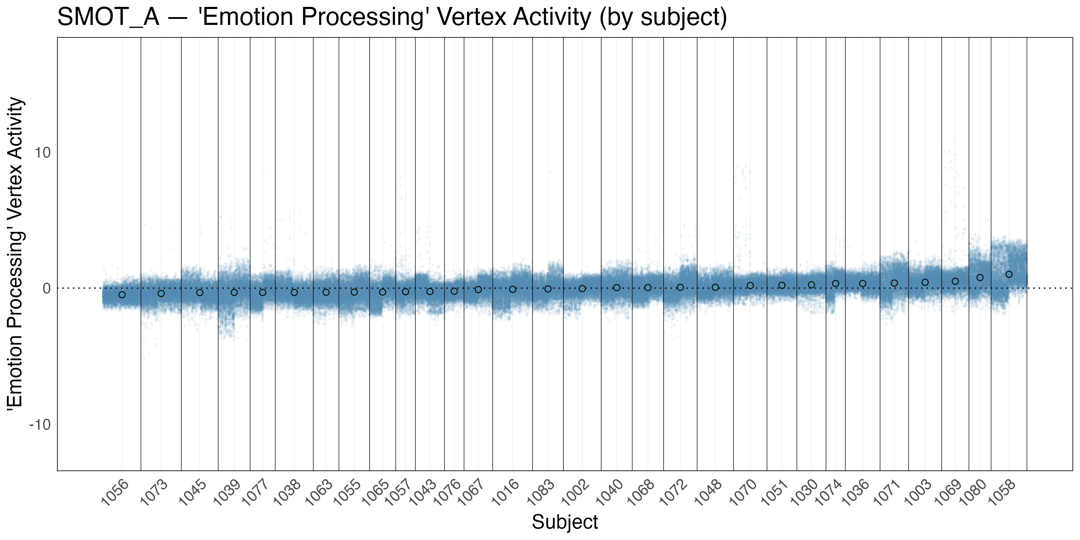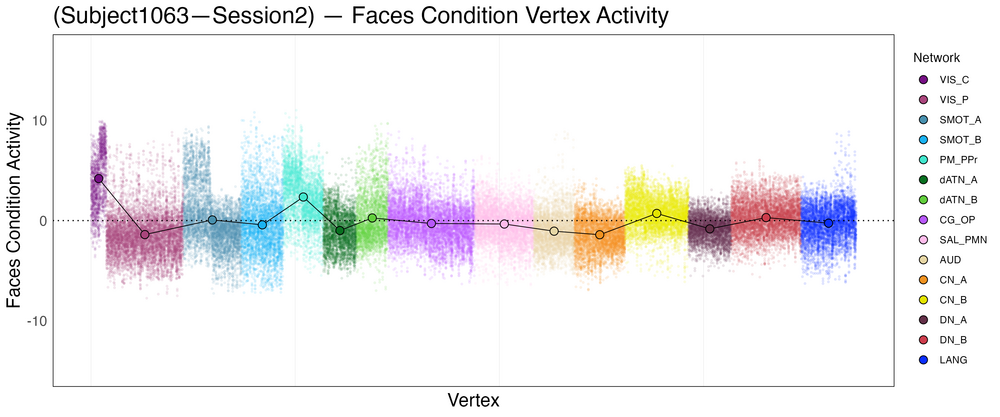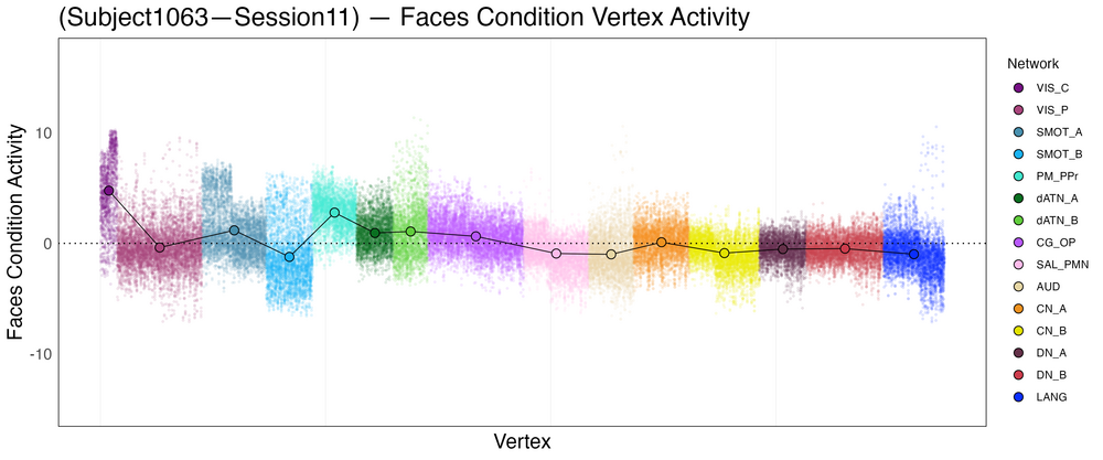 Reviewing the vertex-level activity for the faces and shapes conditions revealed that a subset of vertices in the somatomotor network A (SMOT_A) exhibited a notable increase in activity. In these examples, a subset of the vertices in the left hemisphere (note the left right split of the vertices) pull away from the overall distribution and band at a higher level of activity. The observed left lateralized region-level vertex activity likely reflects subject 1063 (right handed) making button press to indicate their responses during task. This activity not visible in the ‘emotion processing’ activity contrast (when activity in the shapes condition is subtracted from that of the faces condition), as both conditions contain a button press motor action.