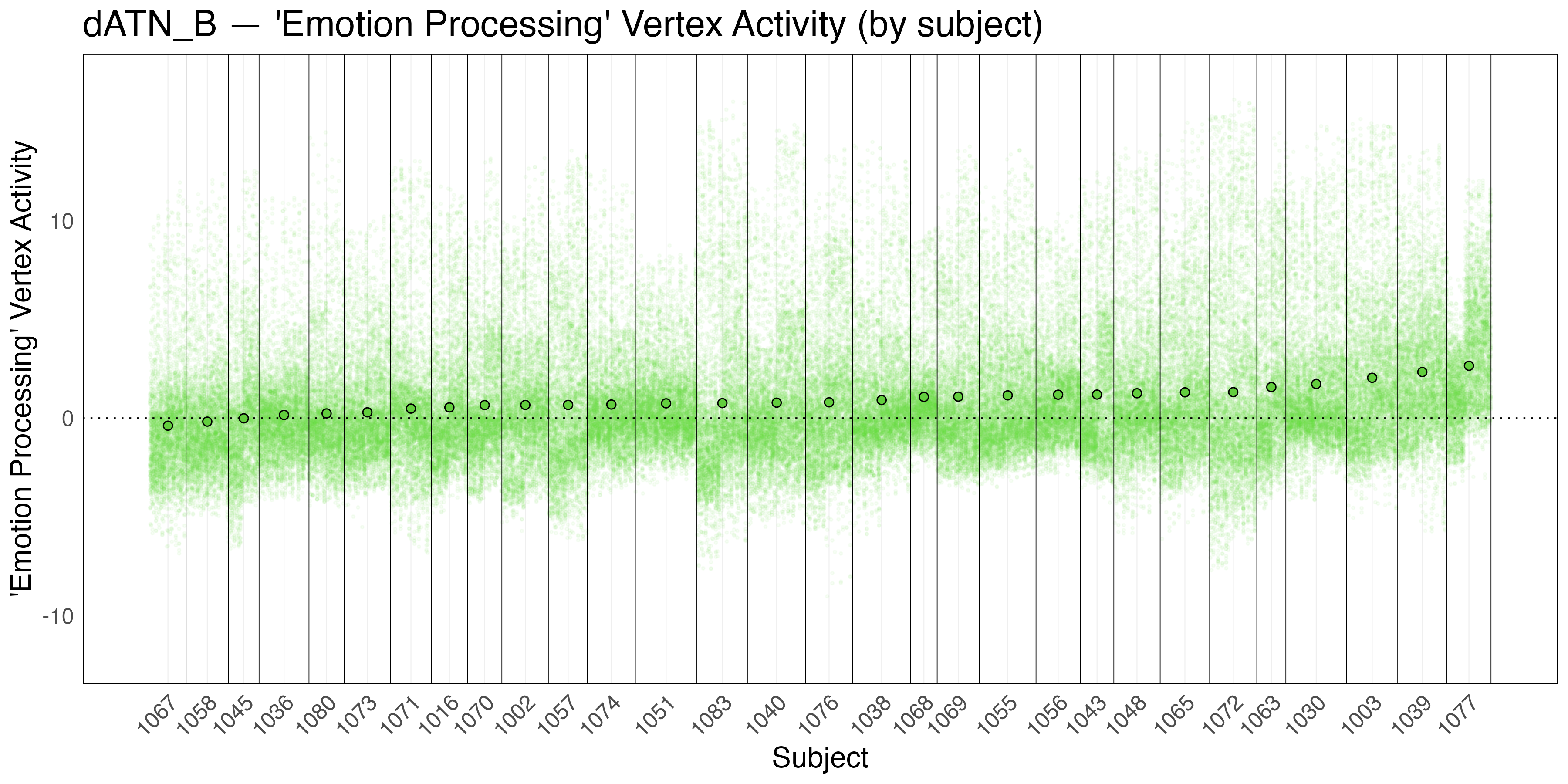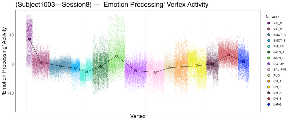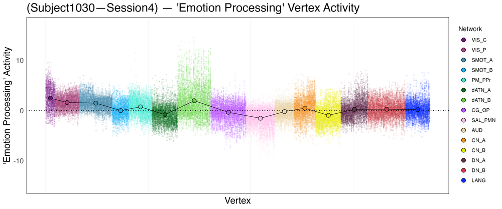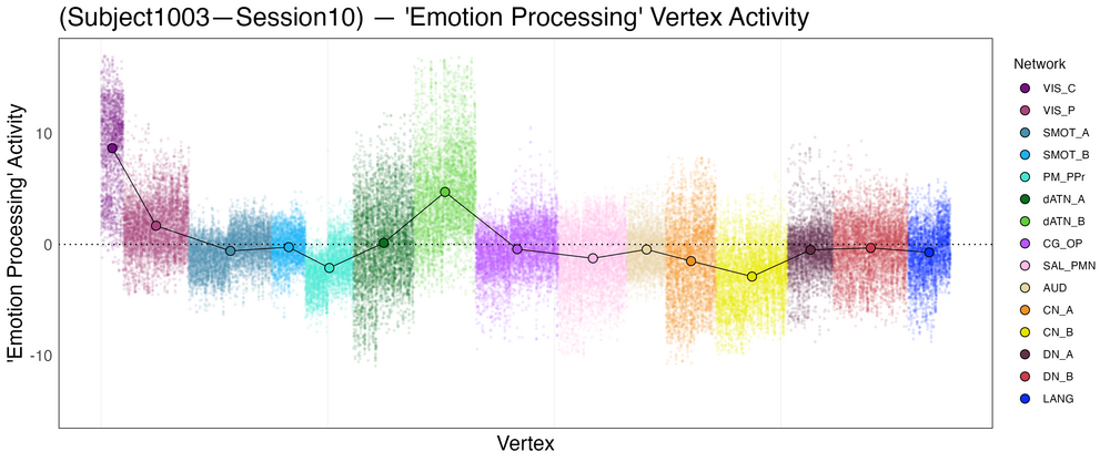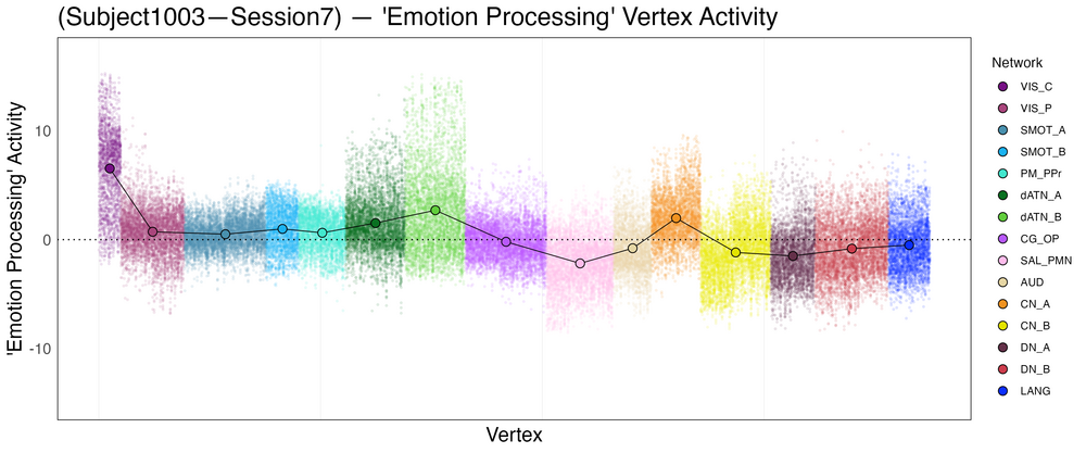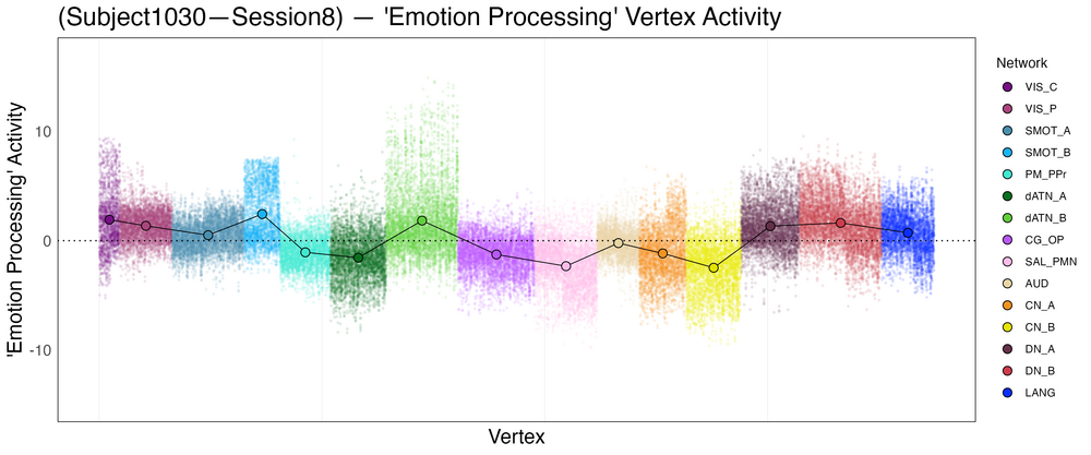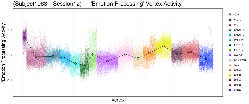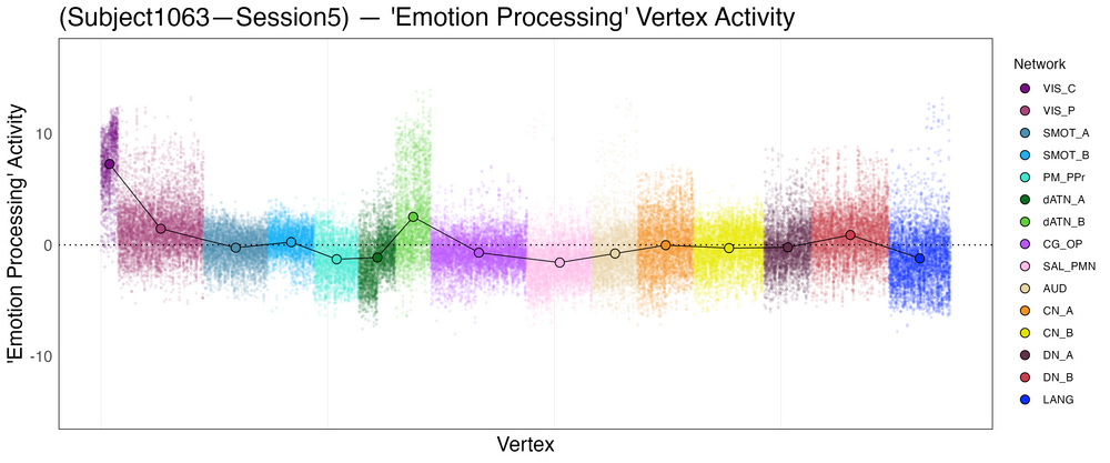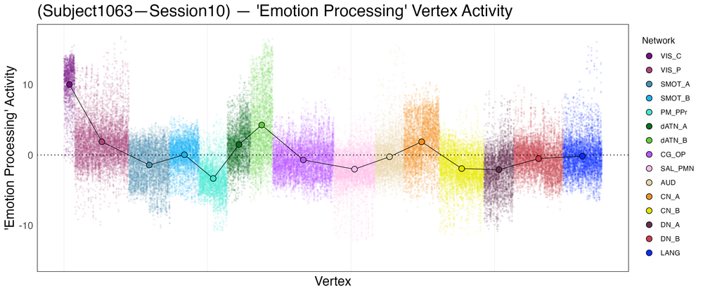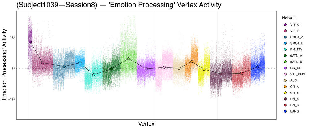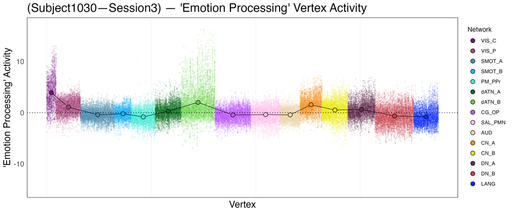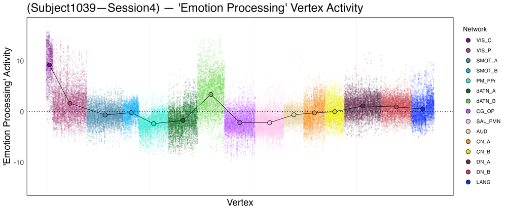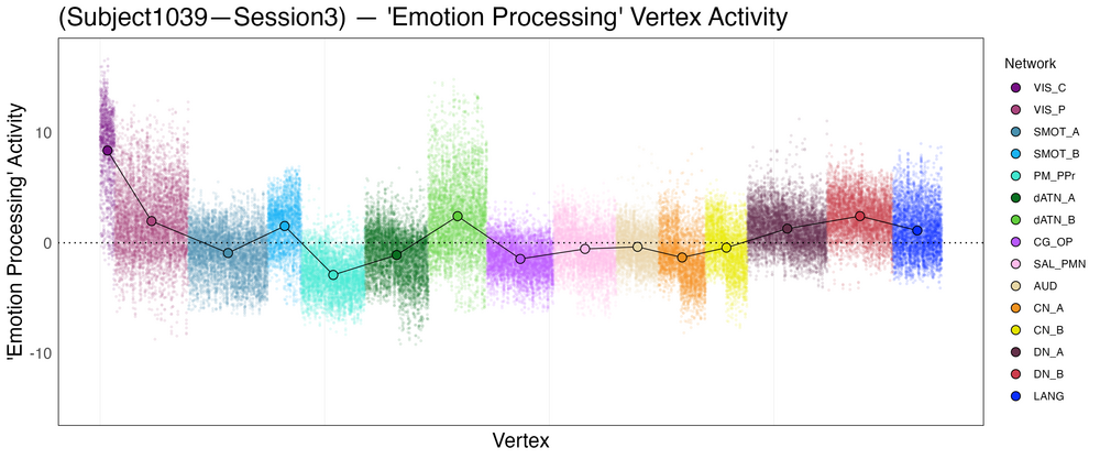 I will begin by simply visualizing the vertex-level activity for a set of sessions from a subset of subjects. For the sake of brevity, I will only examine vertex activity for the ‘emotion processing’ activity within the individualized networks. Below, you will see the vertex activity plotted by network . In these vertex activity plots, you will be able to see the distribution of activity across all vertices that fall within a given network. Below each vertex activity plot, you will see the network-activity overlays, where images of the actual ‘emotion processing’ activity (for the given session) is displayed with each network boundary (black outline) overlayed on top. You will be able to click through the various networks to examine the extent to which the observed activity is bounded by a given network. These two visualization techniques will allow you to gain a visual intuition for how activity during ‘emotion processing’ manifests.