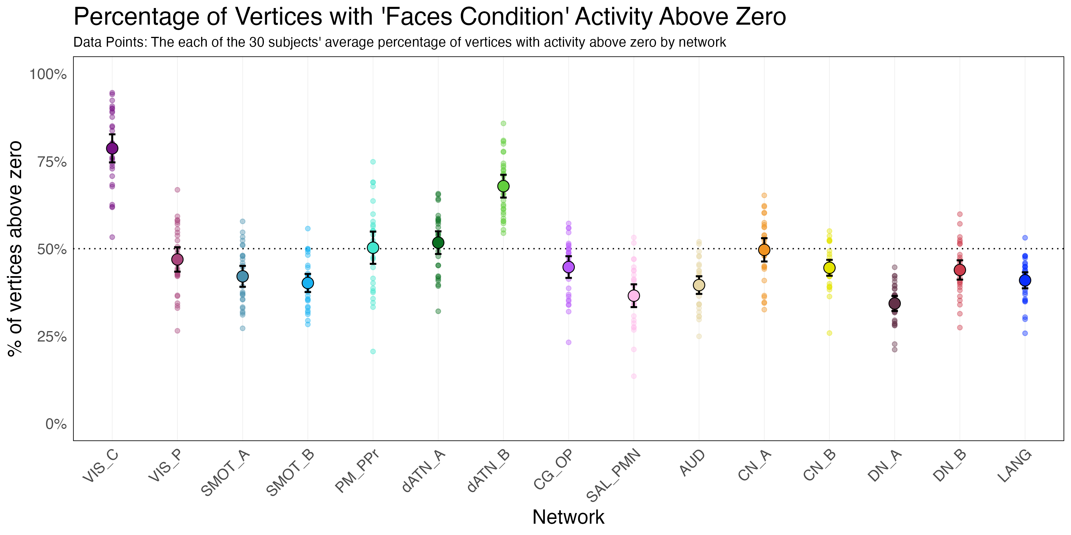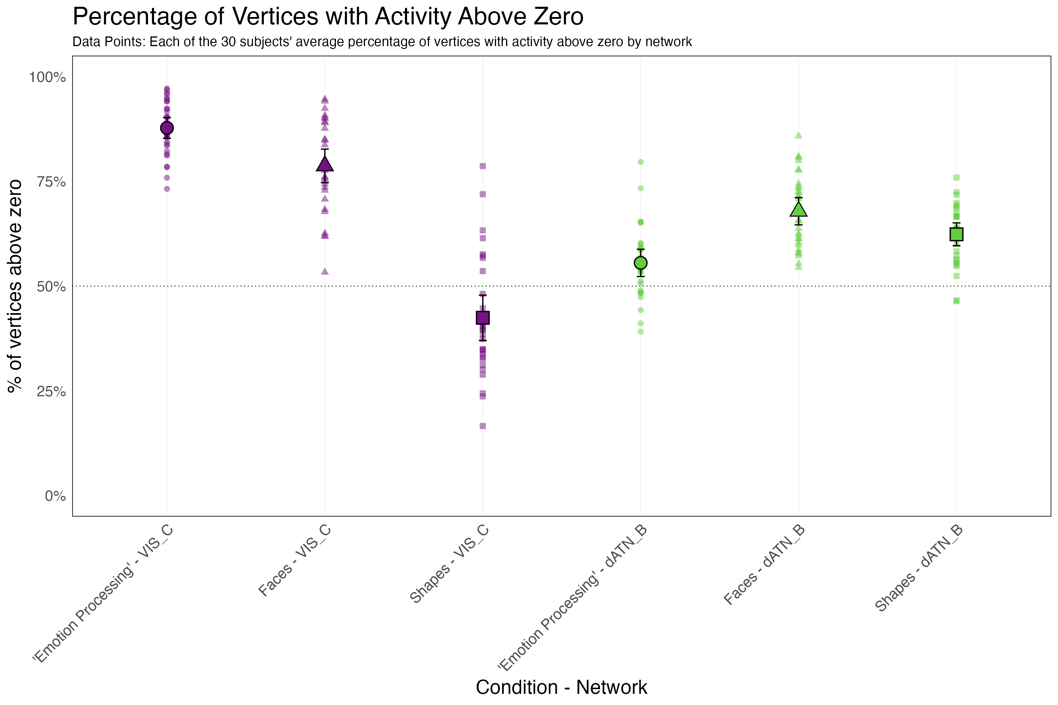 Percent Activity Above Zero - Observations. As seen in the plot above, on average, 88% of vertices in the visual-central network (VIS-C) have ‘emotion processing’ activity above zero. The average percent activity above zero for the dorsal attention network B (dATN_B) is much lower at 56%. However, the averages for each condition independently are higher (faces at 68% and shapes at 62%). Examining the plot in the second tab (Tab 2) shows that the visual-central network (VIS-C) and the dorsal attention network B (dATN_B) are the only networks that exhibit meaningful percent activity above 0.