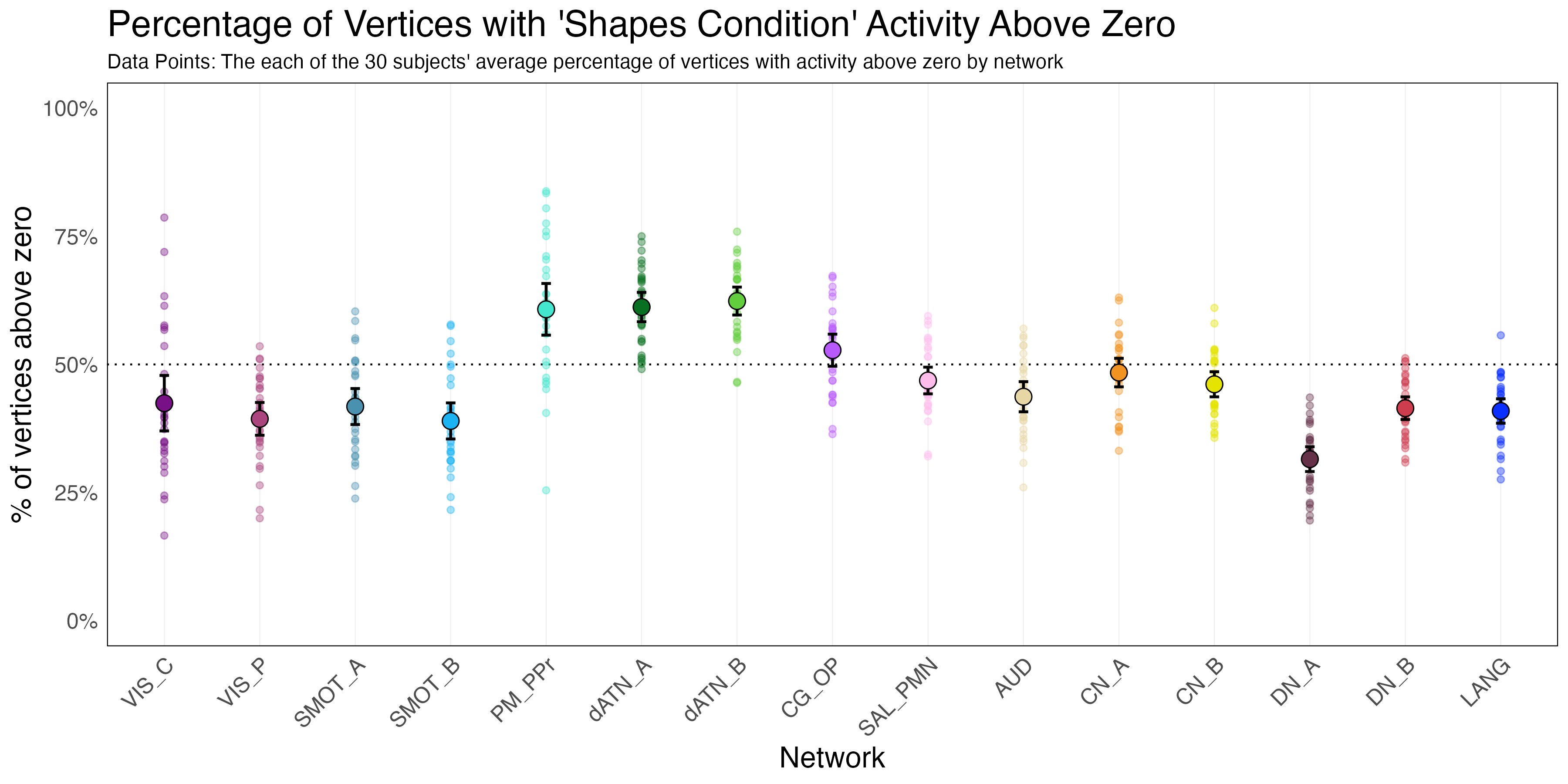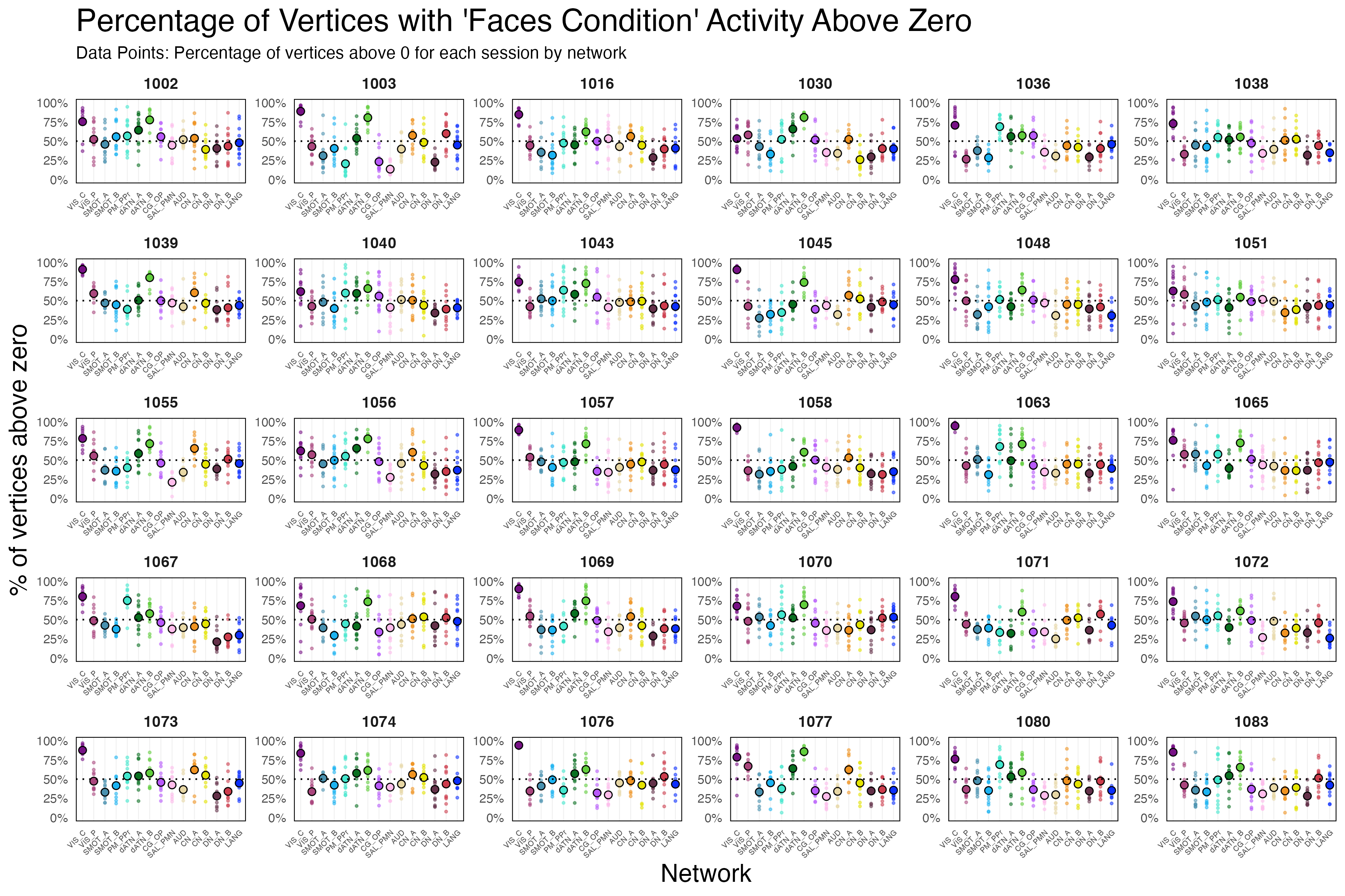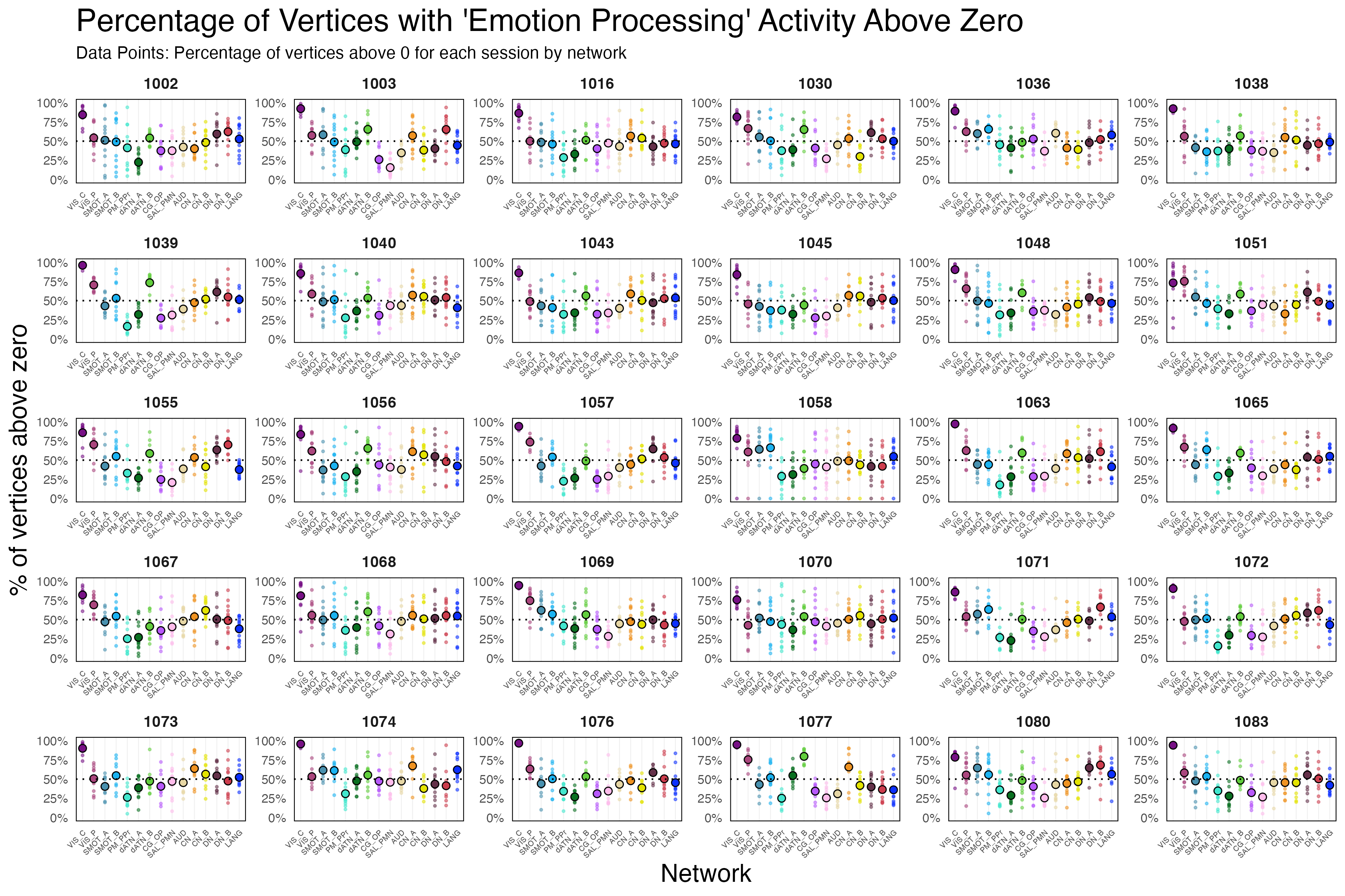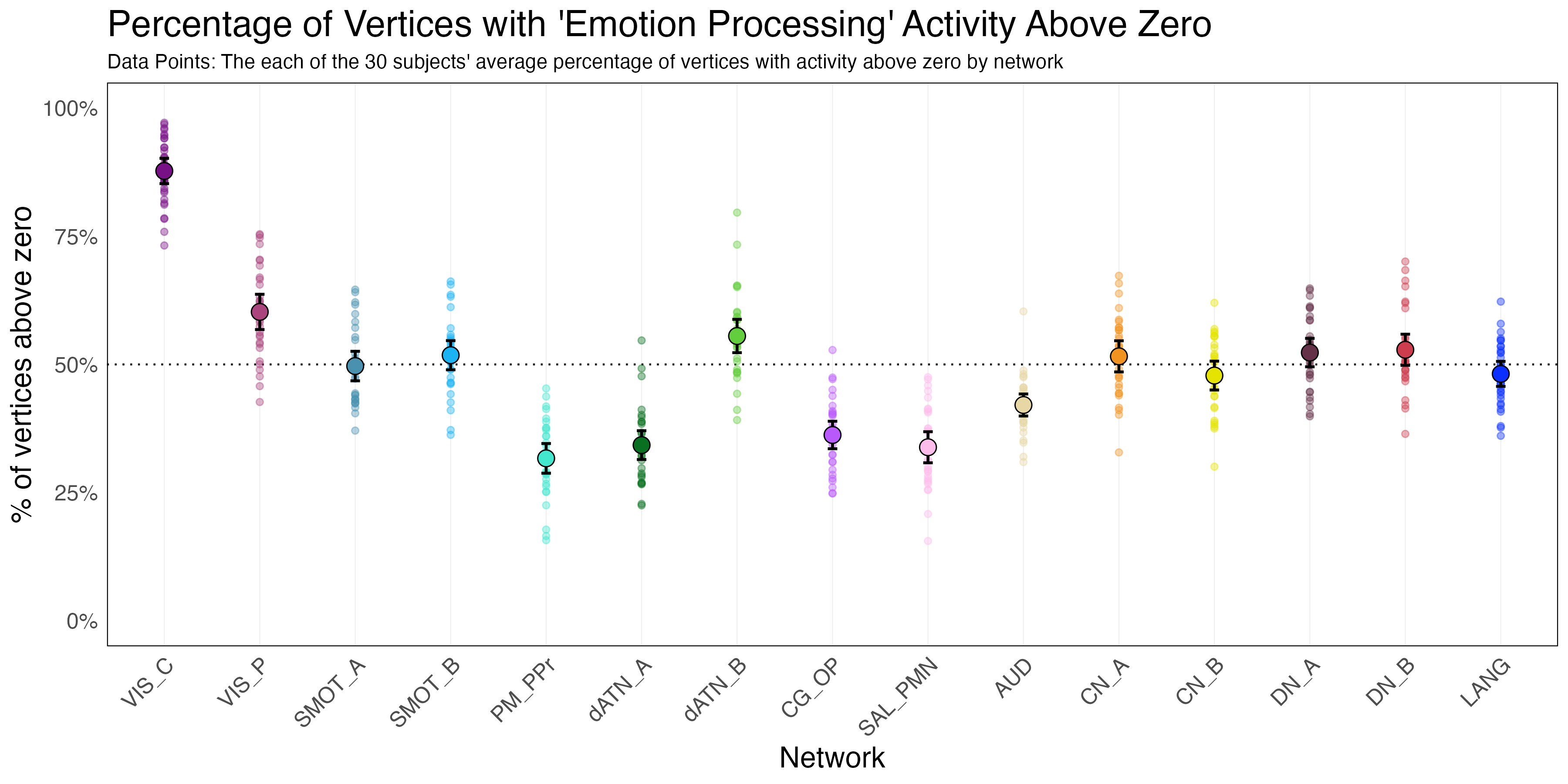 While the first two sections provided visual evidence that network-level activity is occurring during the emotion processing task, I wanted to quantify this visual observation. To do so I examined the percent of vertices within a network that exhibit activity greater than zero (percent vertex activity above zero). This metric is a simple way to quantify what was observed visually in the subject-session examples in section 1 — ie. when a network exhibits ‘emotion processing’ activity, a majority of the vertices in the network exhibit activity above zero.
