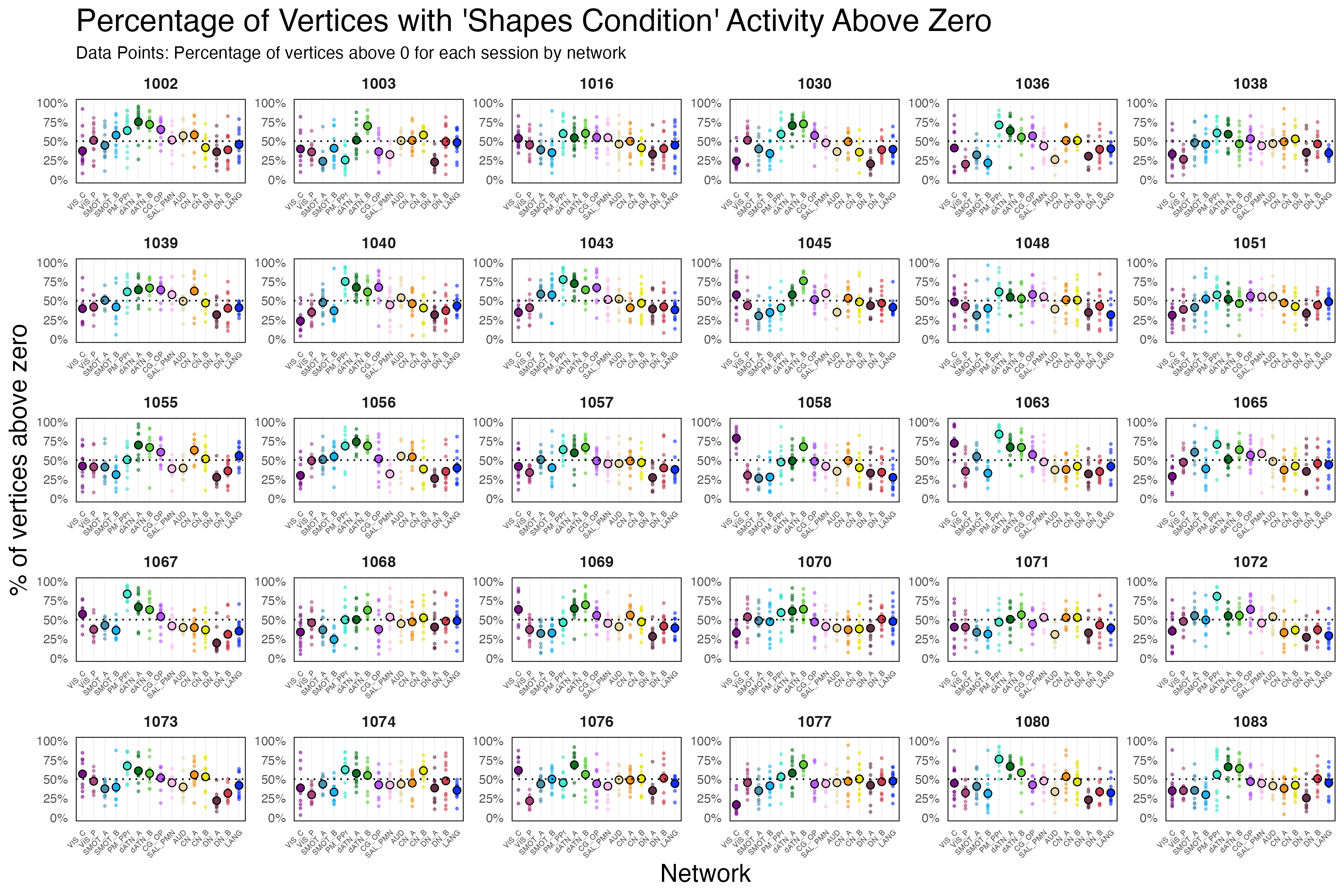 Observations - Vertex Activity Plots. Reviewing the above session-level vertex activity plots, reveals that when average activity increases within a network, the vertices within the network shows a global increase in activity. For three of four sessions, across subjects, all vertices within the visual-central network (VIS-C) show an increase in activity well above zero. Though some vertices in one subject-session (1030 - session 4) are below zero, the majority of vertices are above zero. A similar pattern of global vertex activity increase is seen for the dorsal attention network B (dATN-B) for all subjects across all sessions, where the whole distribution of vertices increases above zero. In section 3, I will quantify these visual observations by examining the percent of vertices within each network that show an increase in activity above zero for each network across all subjects and sessions.