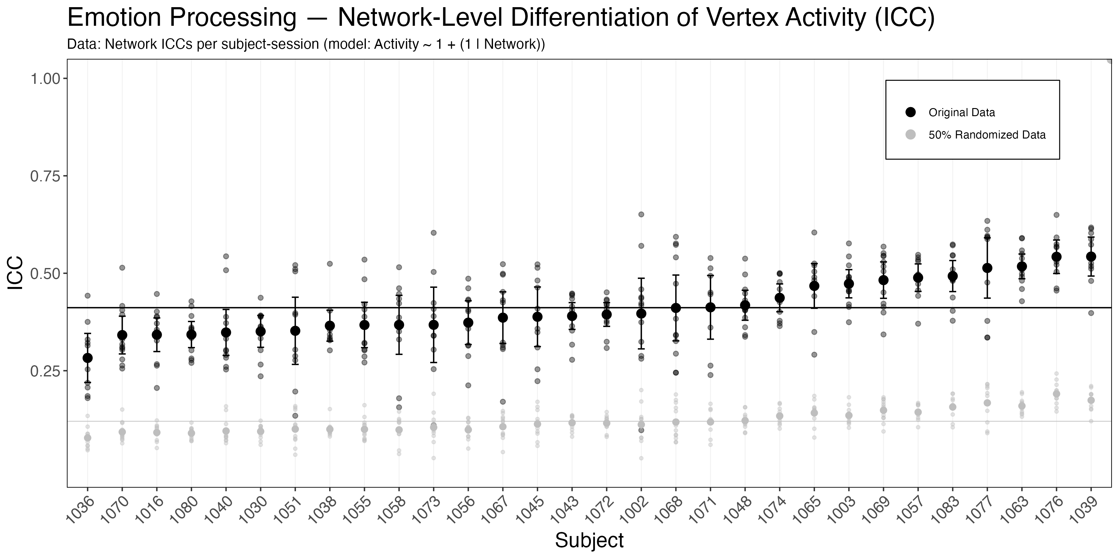 To examine between-network activity differentiation of vertex-level activity, I calculated a between-network intraclass correlation (ICC) for each session, for each subject. Here the between-network ICC is a ratio of the variability in vertex activity between networks relative to the total amount of variability in vertex activity, which allows for the quantification of how well the activity of the vertices is differentiated by the networks (ICC range: Poor (<0.4); Fair (0.4-0.6); Good (0.6-0.75); Excellent (>0.75)(Koo and Li, 2016)). For a given session, if each network exhibits a unique level of activity during ‘emotion processing’, and further this network-level structure is observable within the vertex-level data, then the ICC will be high. Again this is a between-network measure and will be high when the vertex activity is well described by the networks. I wanted to have a meaningful comparison for the between-network ICCs observed, so additionally calculated ICCs for data in which 50% of the vertices in each network were randomly assigned to a different network. Randomizing the vertex-level data in this way should disrupt network-level structure present in the data, if such structure is present. If the ICCs for the original data are significantly higher than the ICCs for the 50% randomized data, this would suggest that the vertex-level data is differentiated by network and thus the networks inherently exhibit unique levels of activity.