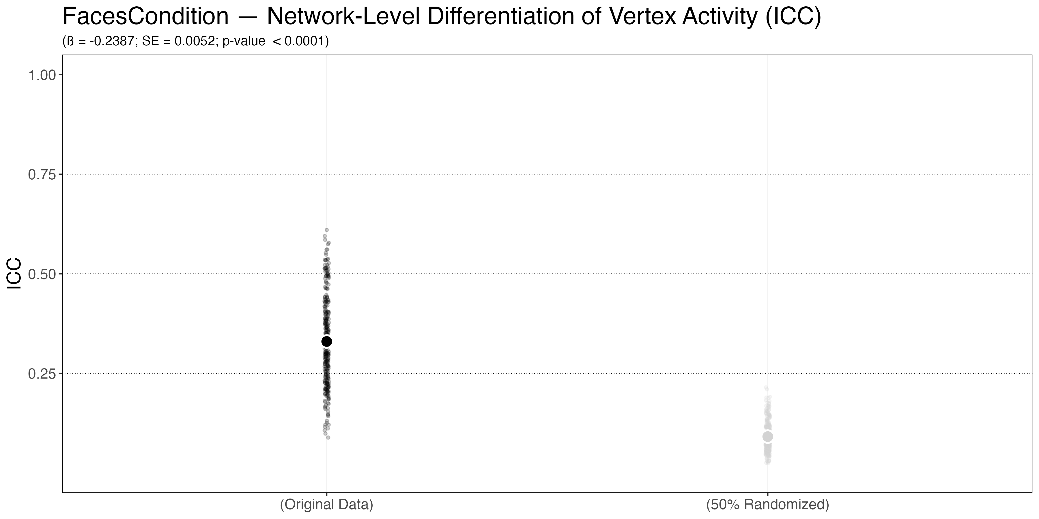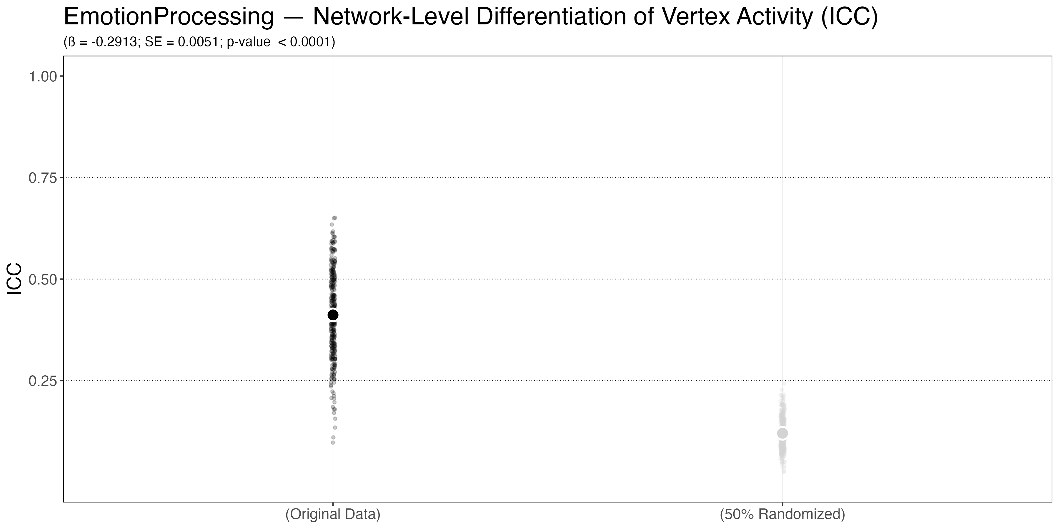 Observations. As seen in the group average plots above, the network ICCs for the original data (black) are significantly higher than the network ICCs for the data where 50% of the vertices in each network were randomized to a different network (light grey). This is true in the ‘emotion processing’ activity (b = -0.29, SE = 0.0051, p < 0.0001), as well as the faces (b = -0.24, SE = 0.0052, p < 0.0001) and shapes (b = -0.19, SE = 0.0043, p < 0.0001) conditions activity. This indicates that randomizing 50% of the vertices significantly decreases the network structure in the data. If the original data did not exhibit network structure, then randomizing 50% of the vertices would not have had a significant effect on the network ICCs.
