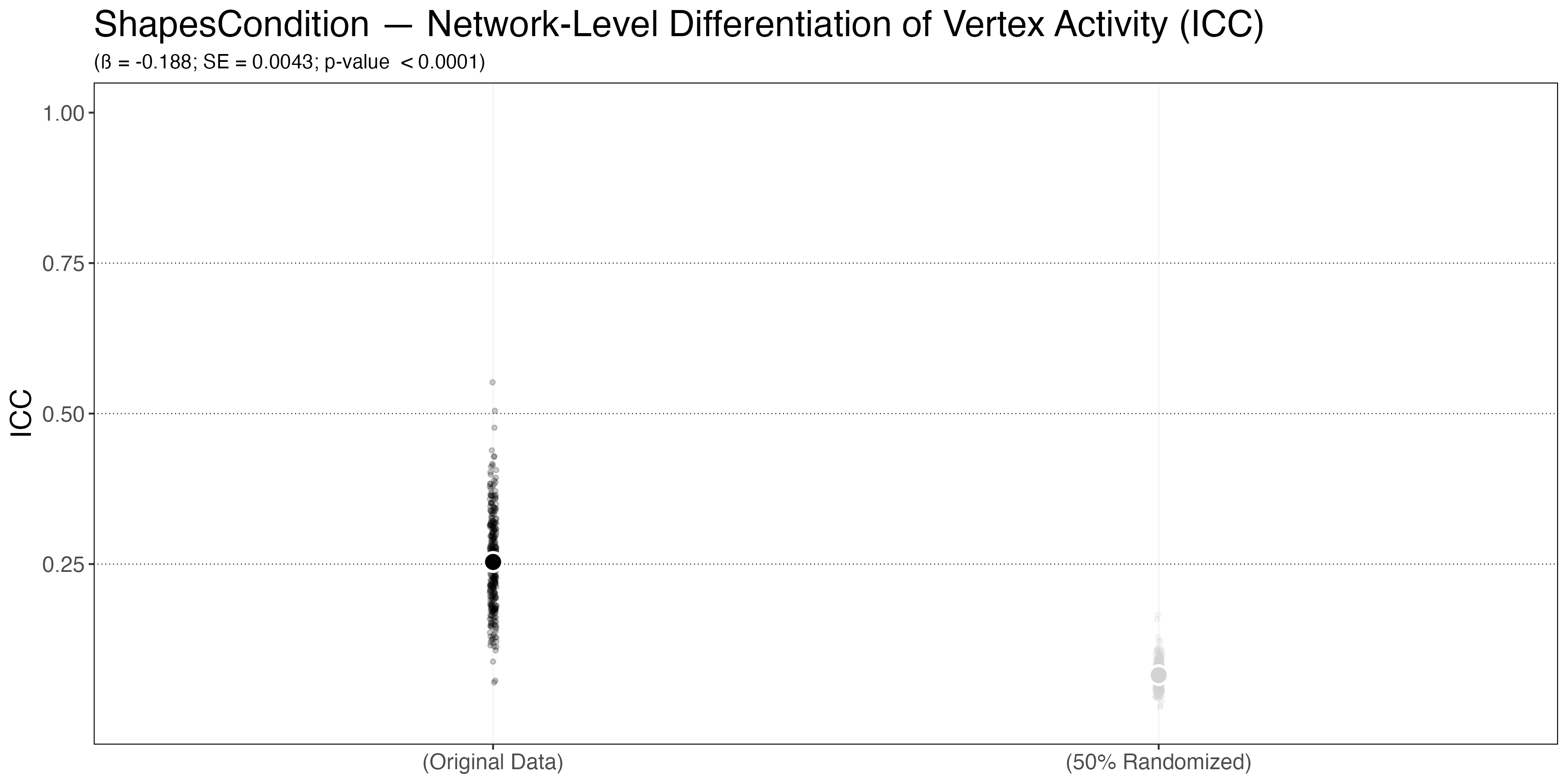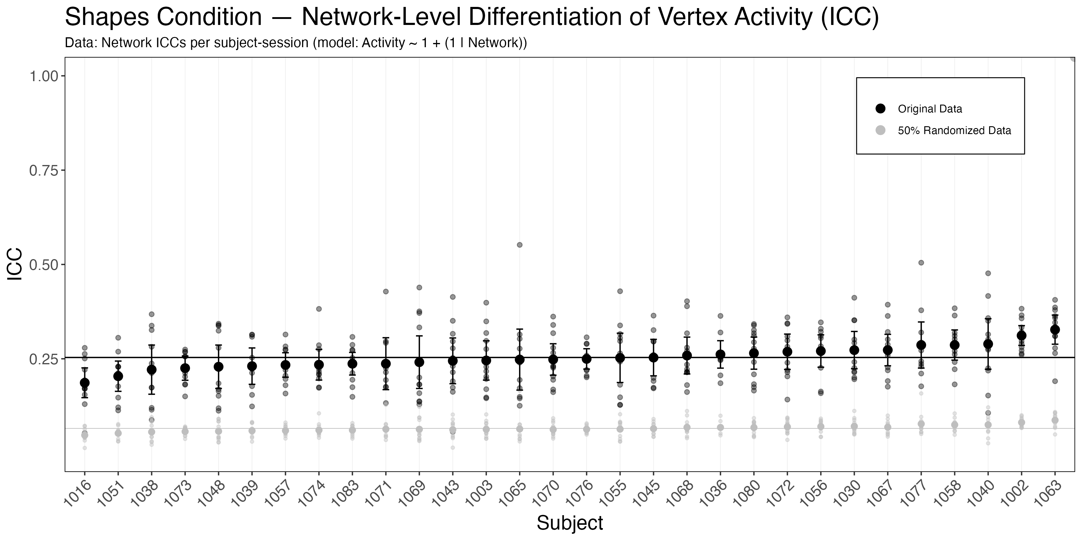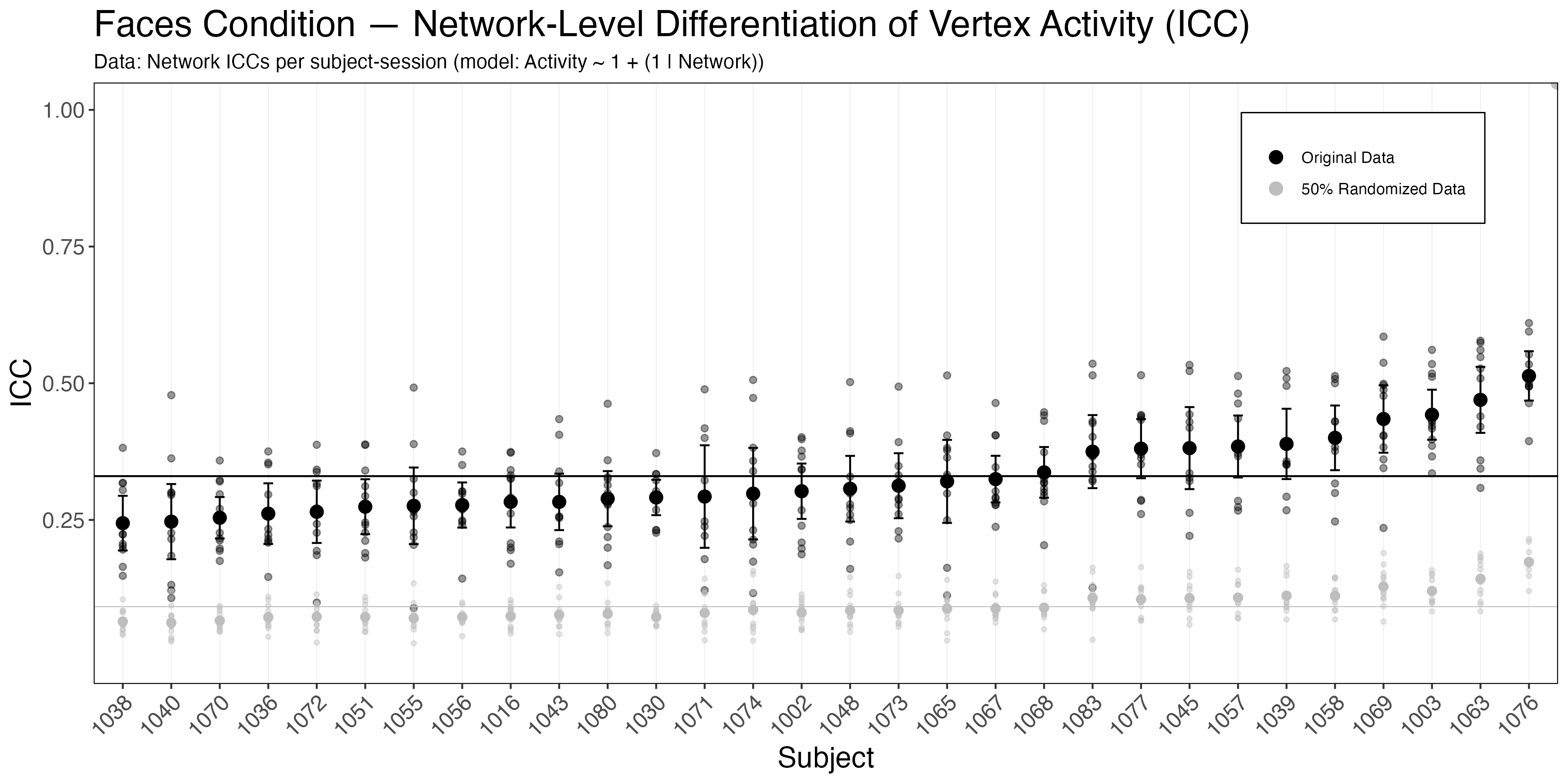 On average, original data exhibited between-network ICCs of 0.43 implying fair differentiation of vertex activity by network within sessions. Interestingly, the conditions activity ICCs were lower than the network ICCs for the Faces > Shapes activity, with the faces condition ICCs averaging 0.33 and the shapes condition ICCs averaging 0.25. This indicates more network differentiation in the Faces > Shapes contrast than in the individual conditions activity alone.