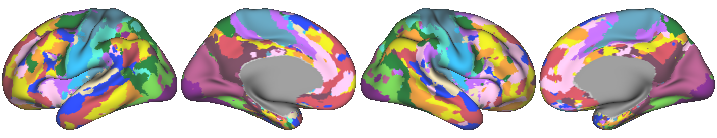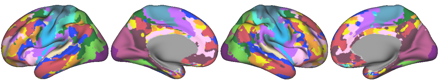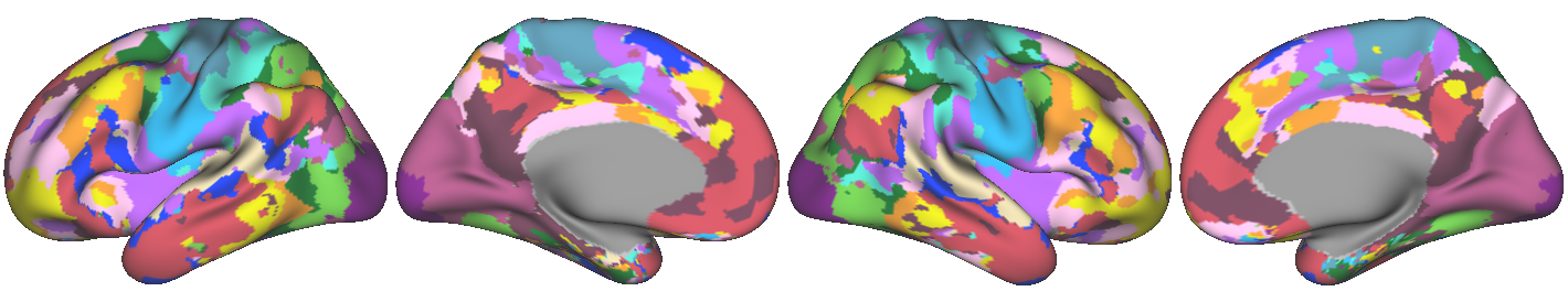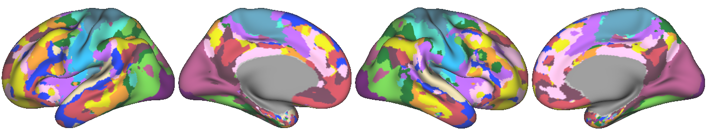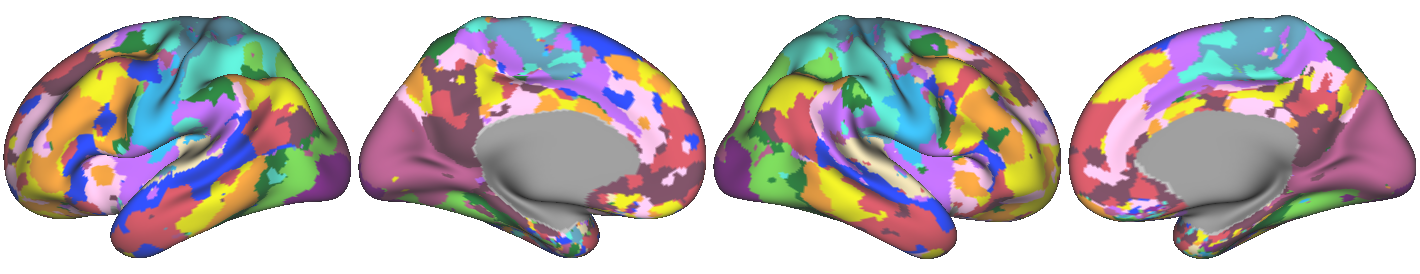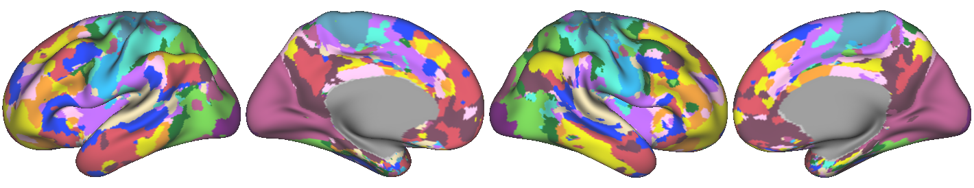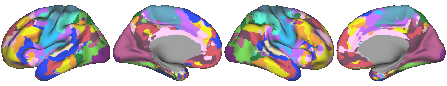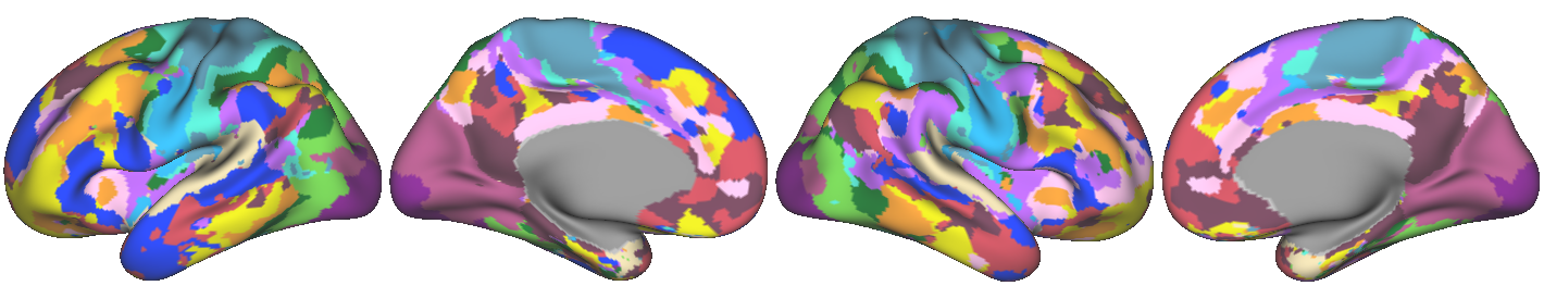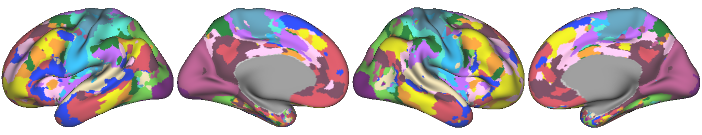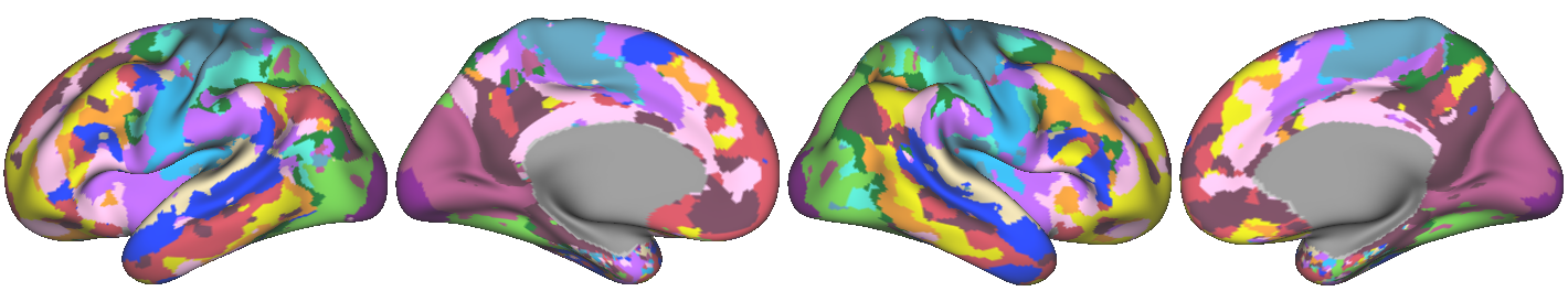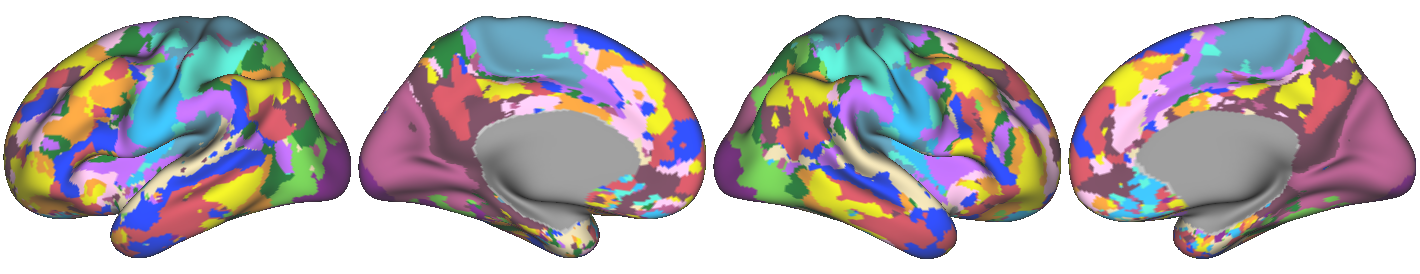 This group-based parcellation is composed of 17 networks: The visual-central network (VisCent), the visual-peripheral network (VisPeri), the somatomotor network A (SomMotA), the somatomotor network B (SomMotB), the dorsal attention network A (DorsAttnA), the dorsal attention network B (DorsAttnB), the salience/ventral attention network A (SalVentAttnA), the salience/ventral attention network B (SalVentAttnB), the limbic network A (LimbicA), the limbic network B (LimbicB), the control network A (ContA), the control network B (ContB), the control network C (ContC), the default network A (DefaultA), the default network B (DefaultB), the default network C (DefaultC), and the tempero-parietal network (TempPar). For a full account of these network, please refer to the original publication (Yeo et al., 2011).