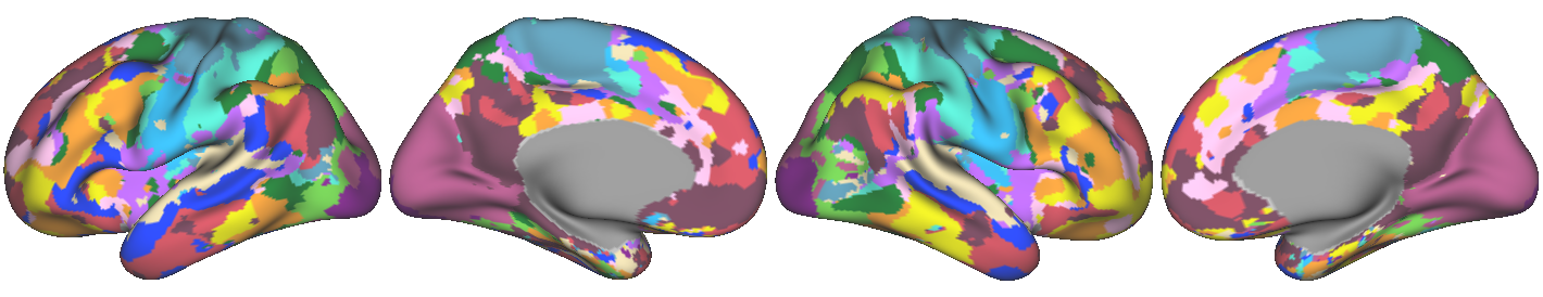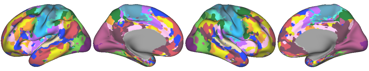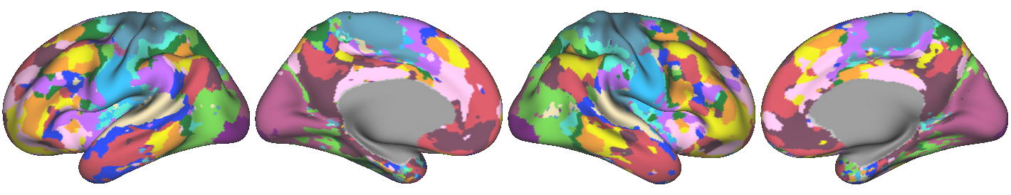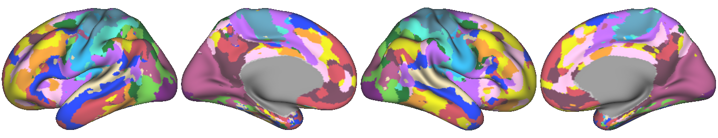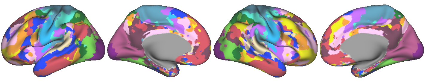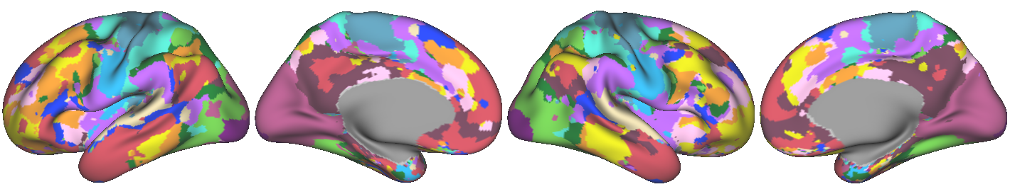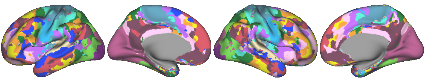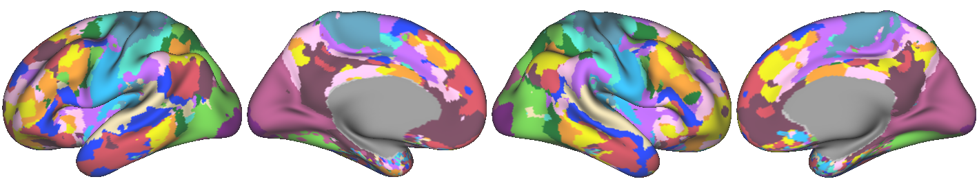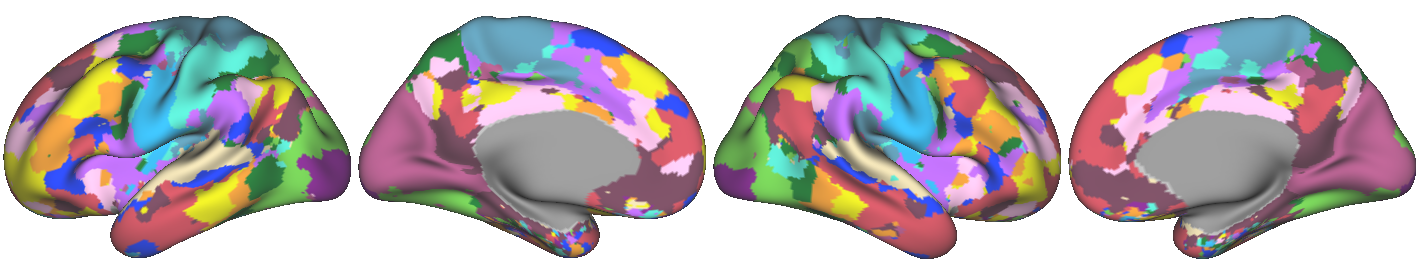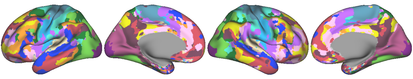 This group-based parcellation is composed of 17 networks: The visual-central network (VisCent), the visual-peripheral network (VisPeri), the somatomotor network A (SomMotA), the somatomotor network B (SomMotB), the dorsal attention network A (DorsAttnA), the dorsal attention network B (DorsAttnB), the salience/ventral attention network A (SalVentAttnA), the salience/ventral attention network B (SalVentAttnB), the limbic network A (LimbicA), the limbic network B (LimbicB), the control network A (ContA), the control network B (ContB), the control network C (ContC), the default network A (DefaultA), the default network B (DefaultB), the default network C (DefaultC), and the tempero-parietal network (TempPar). For a full account of these network, please refer to the original publication (Yeo et al., 2011).