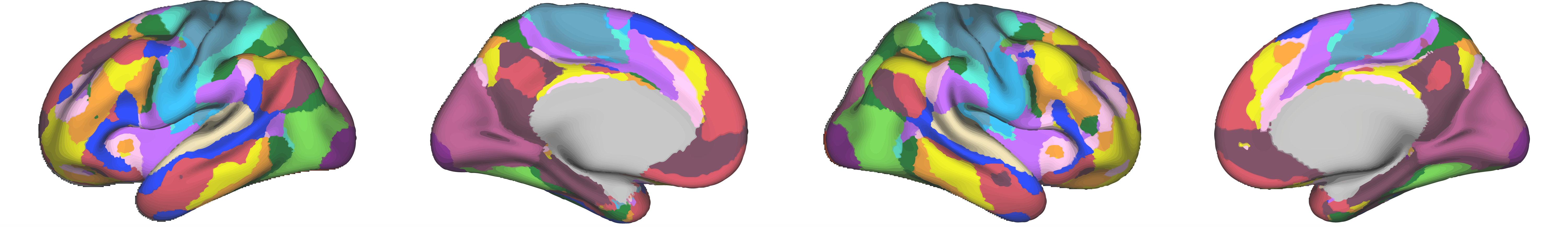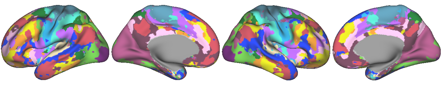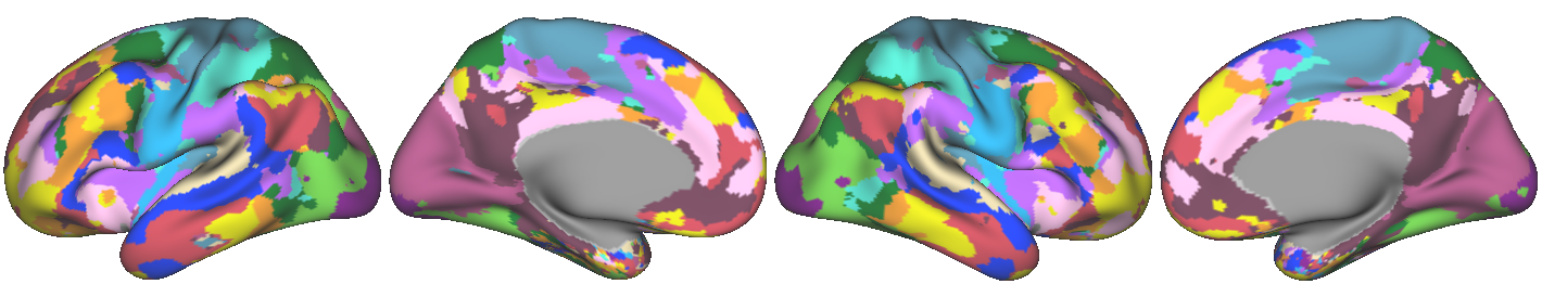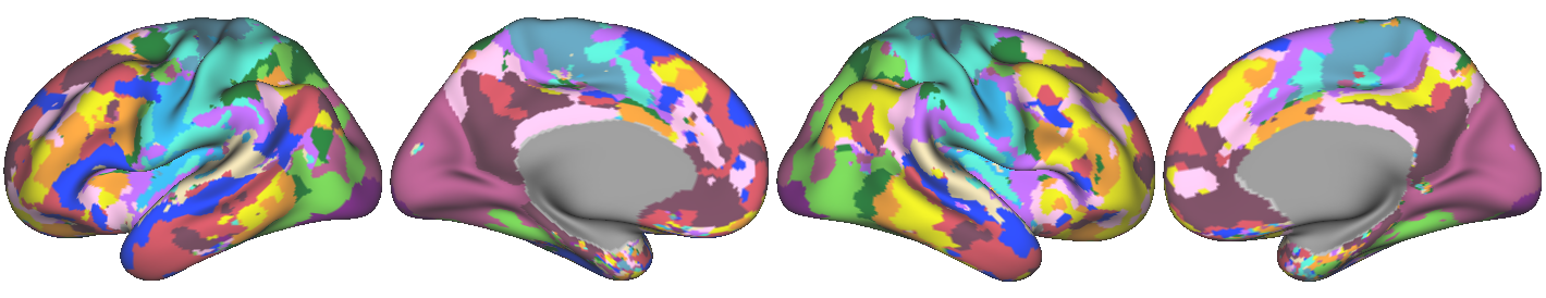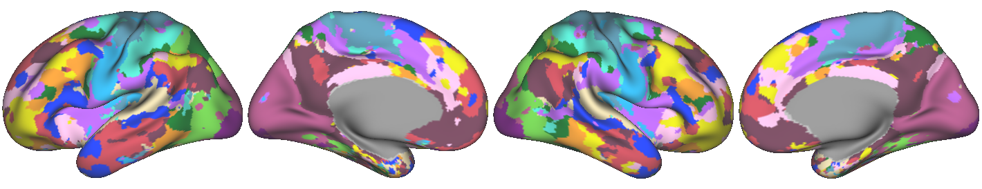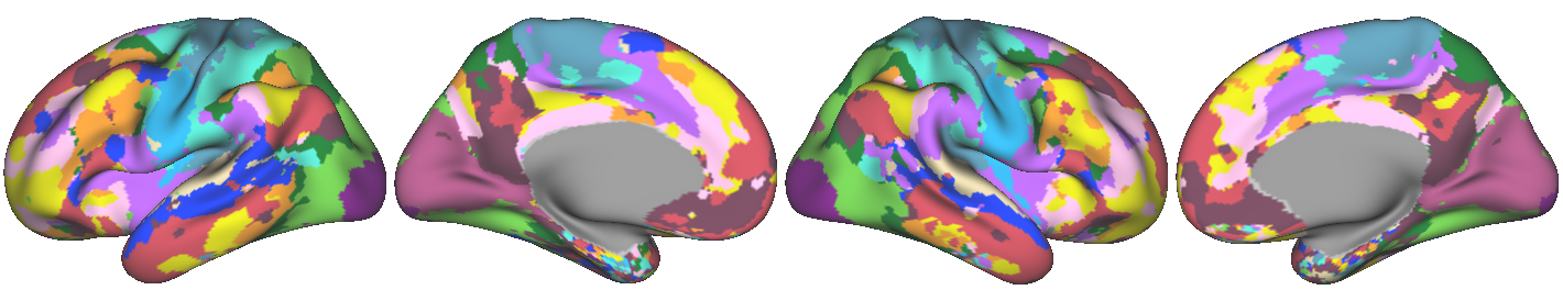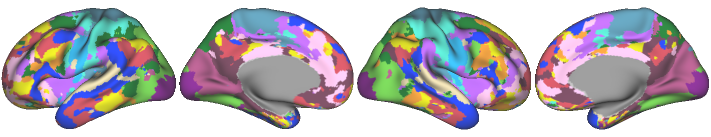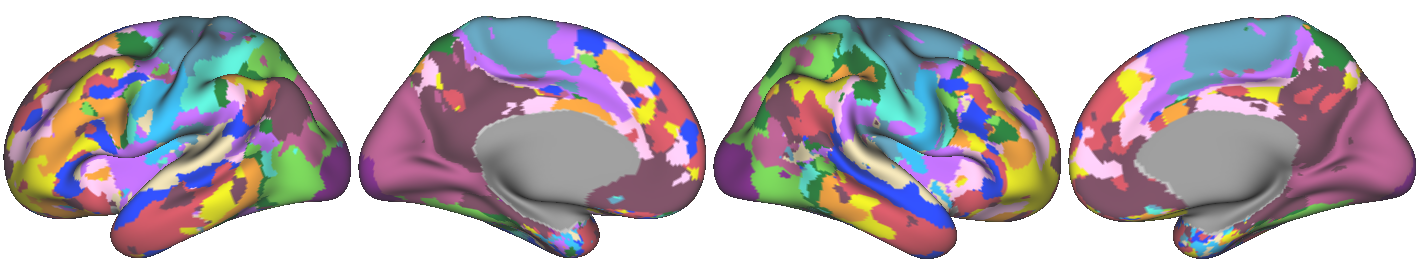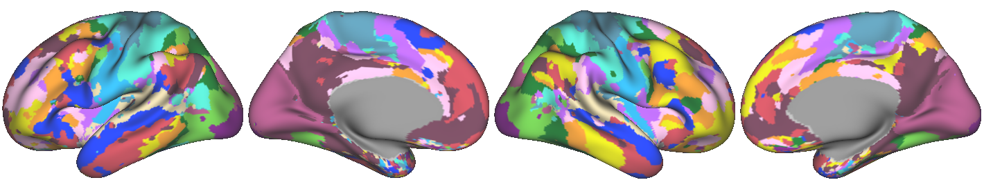 This group-based parcellation is composed of 17 networks: The visual-central network (VisCent), the visual-peripheral network (VisPeri), the somatomotor network A (SomMotA), the somatomotor network B (SomMotB), the dorsal attention network A (DorsAttnA), the dorsal attention network B (DorsAttnB), the salience/ventral attention network A (SalVentAttnA), the salience/ventral attention network B (SalVentAttnB), the limbic network A (LimbicA), the limbic network B (LimbicB), the control network A (ContA), the control network B (ContB), the control network C (ContC), the default network A (DefaultA), the default network B (DefaultB), the default network C (DefaultC), and the tempero-parietal network (TempPar). For a full account of these network, please refer to the original publication (Yeo et al., 2011).