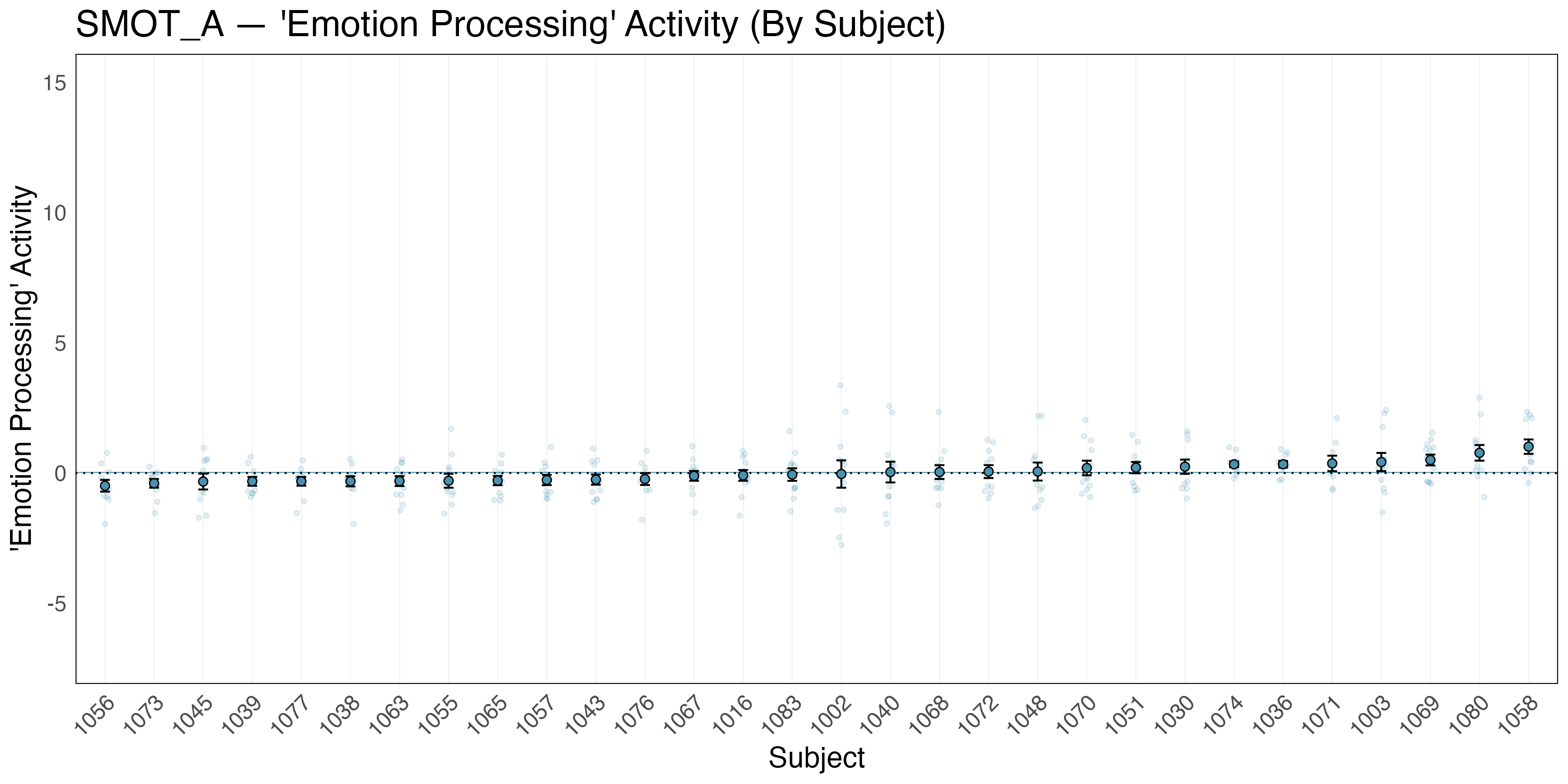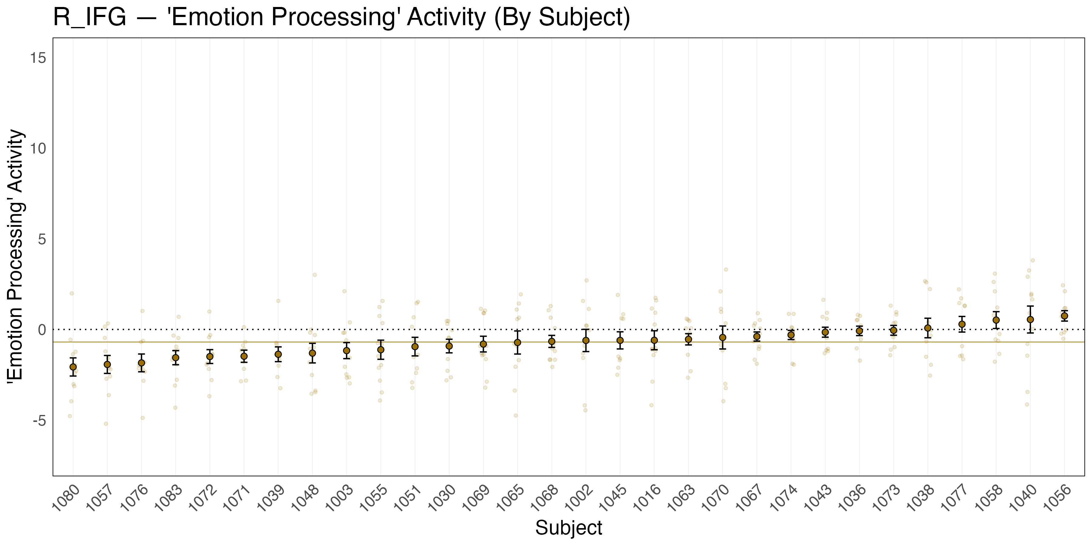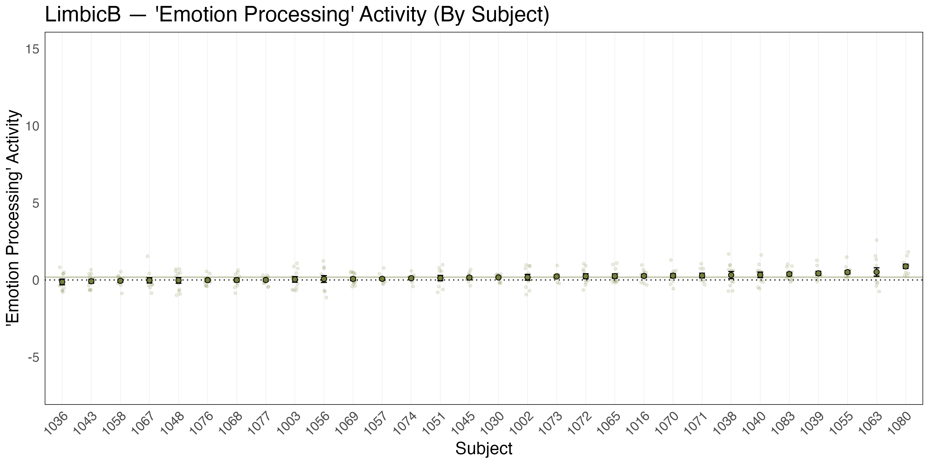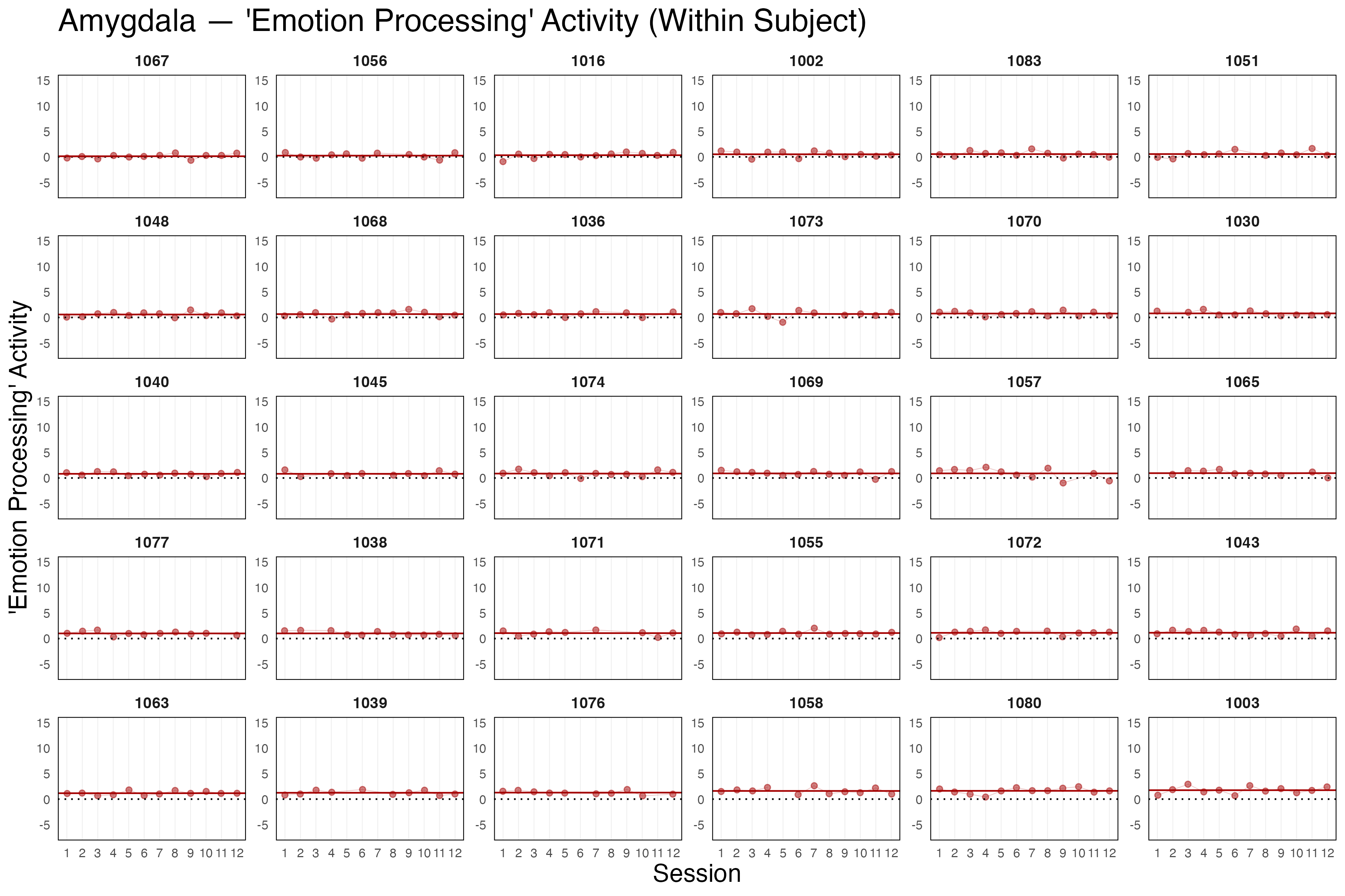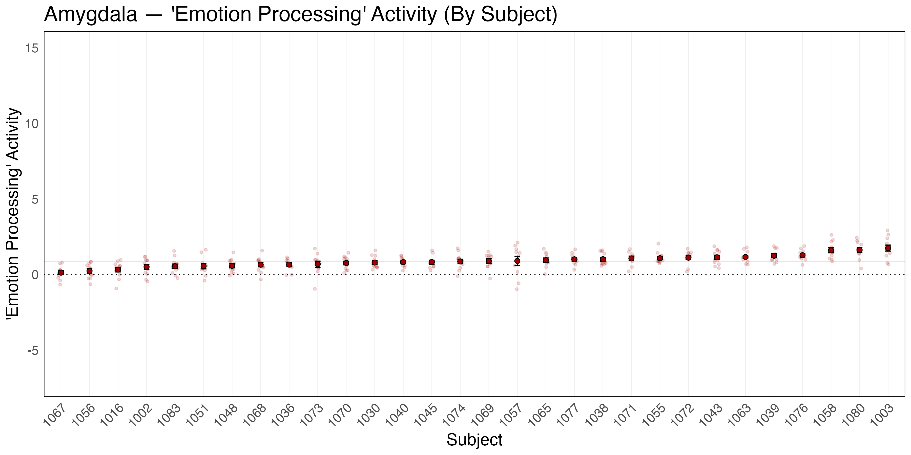 Amygdala. By reviewing the between-subject plots, we can see that the within-subject variability in ‘emotion processing’ activity in the amygdala (the transparent points) is as large or larger than the between-subject variability.
