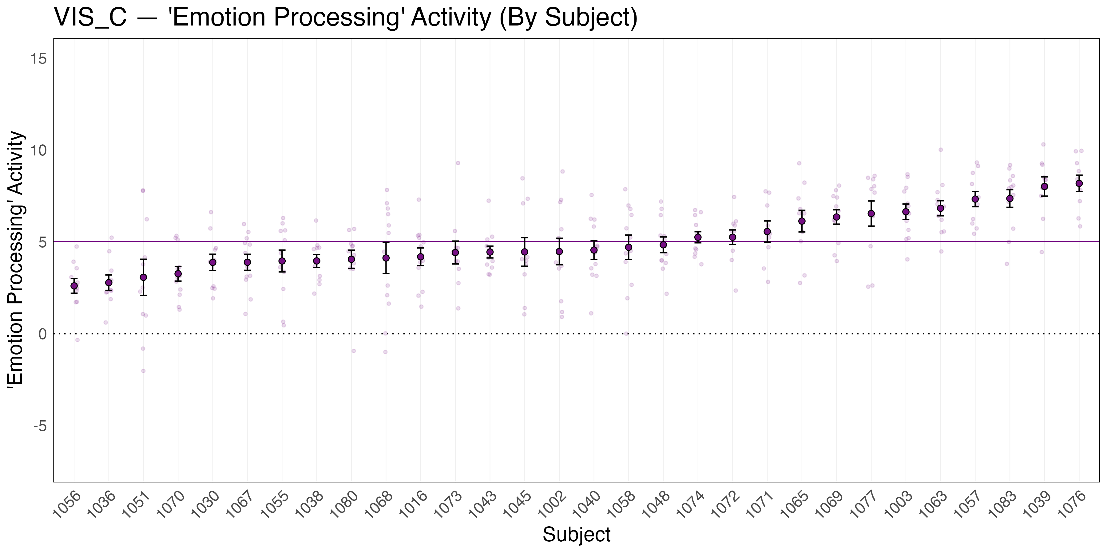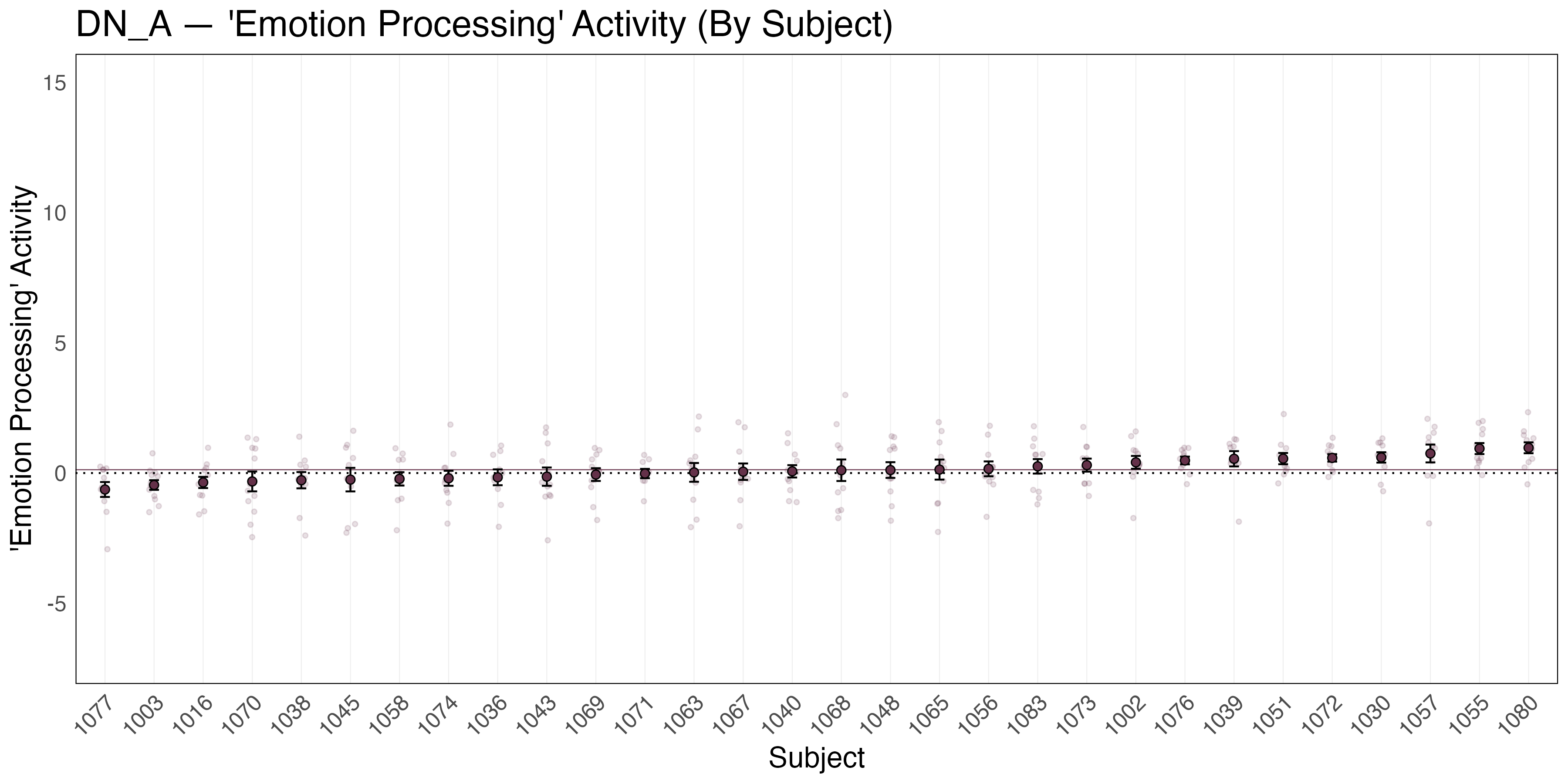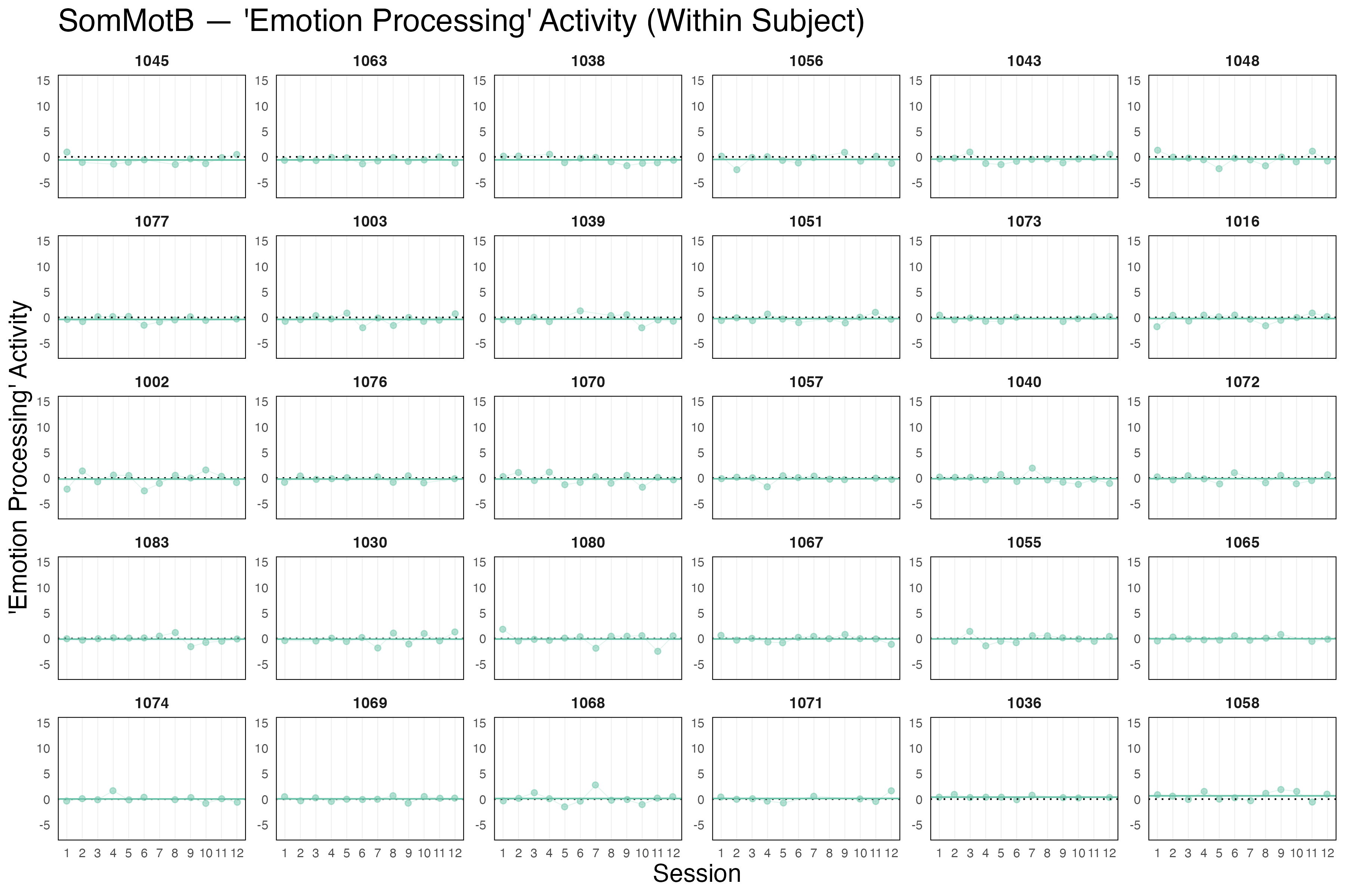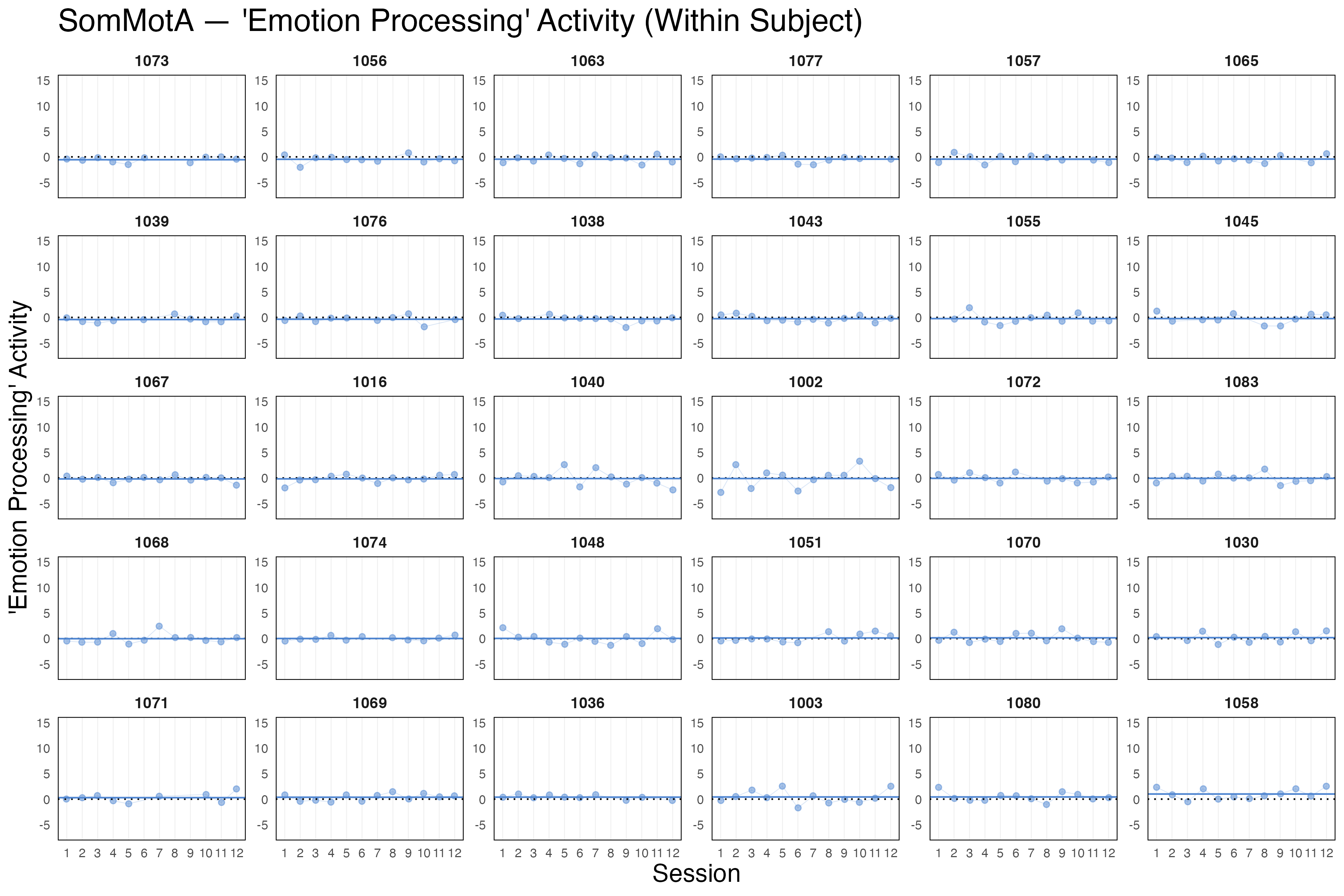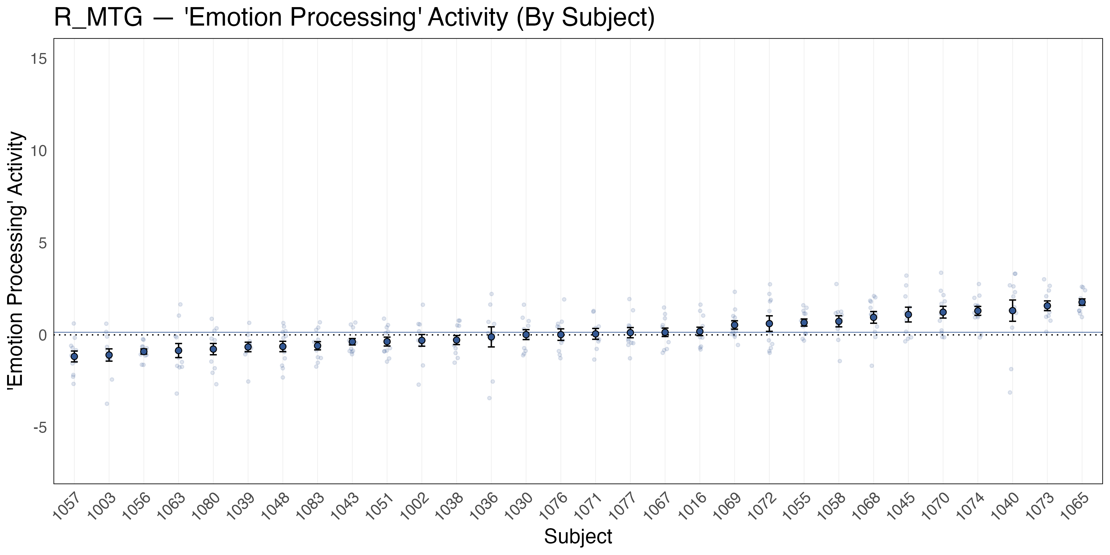 Amygdala. By reviewing the between-subject plots, we can see that the within-subject variability in ‘emotion processing’ activity in the amygdala (the transparent points) is as large or larger than the between-subject variability.