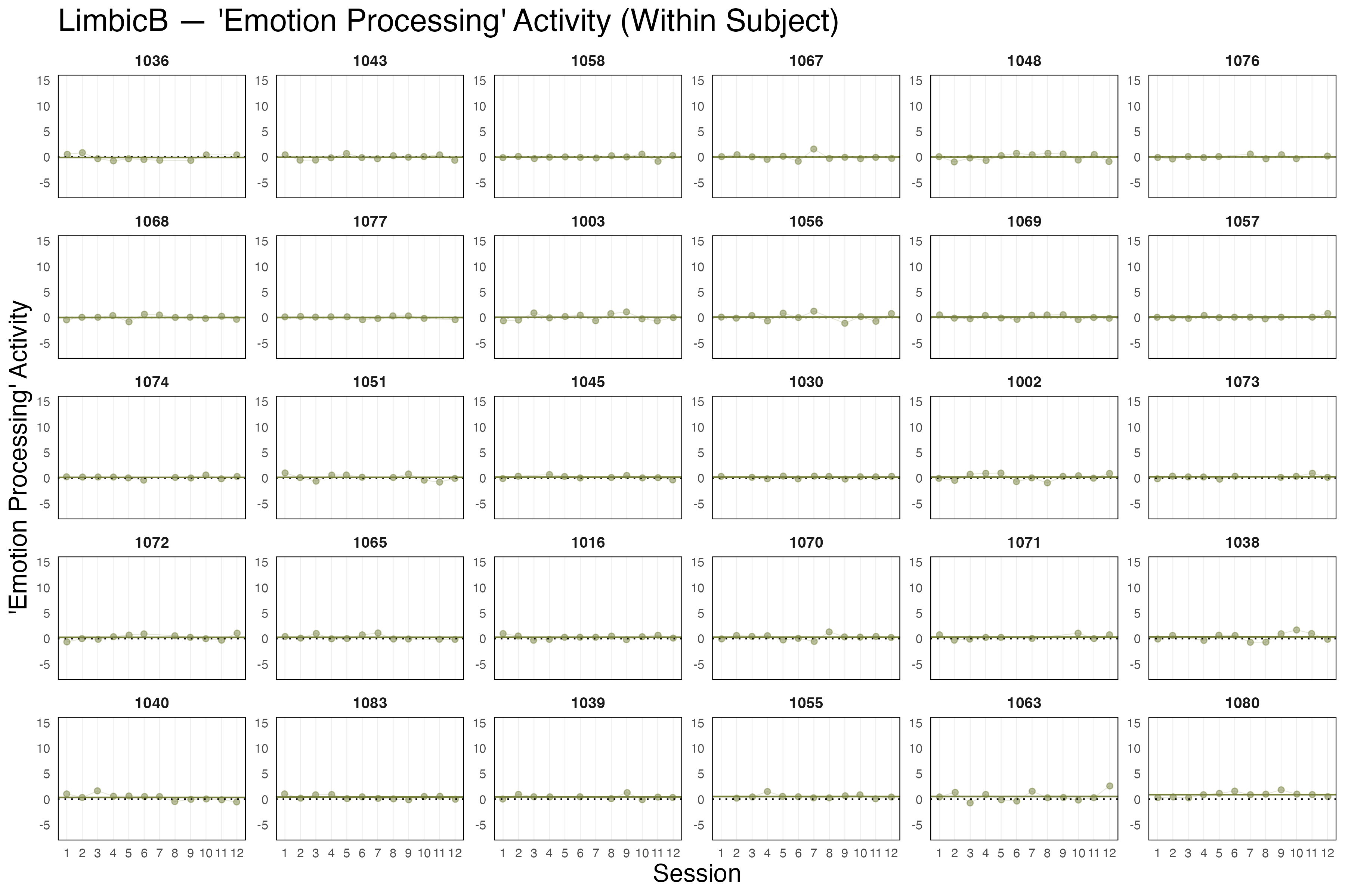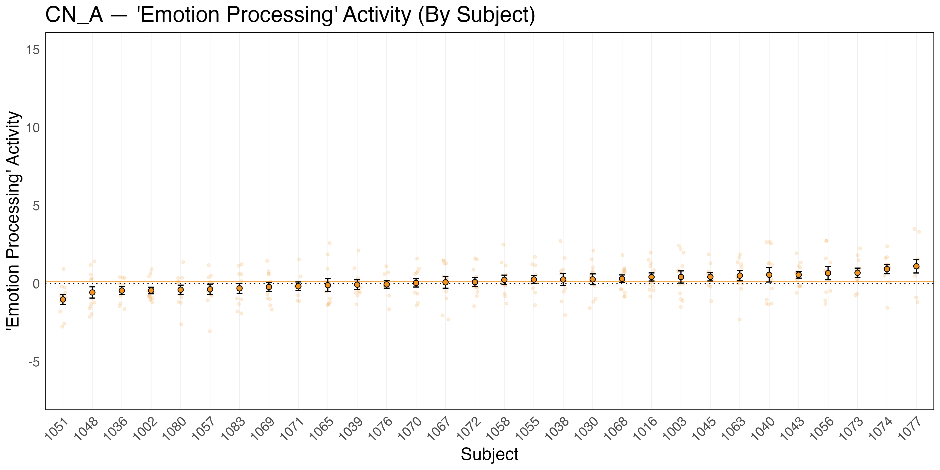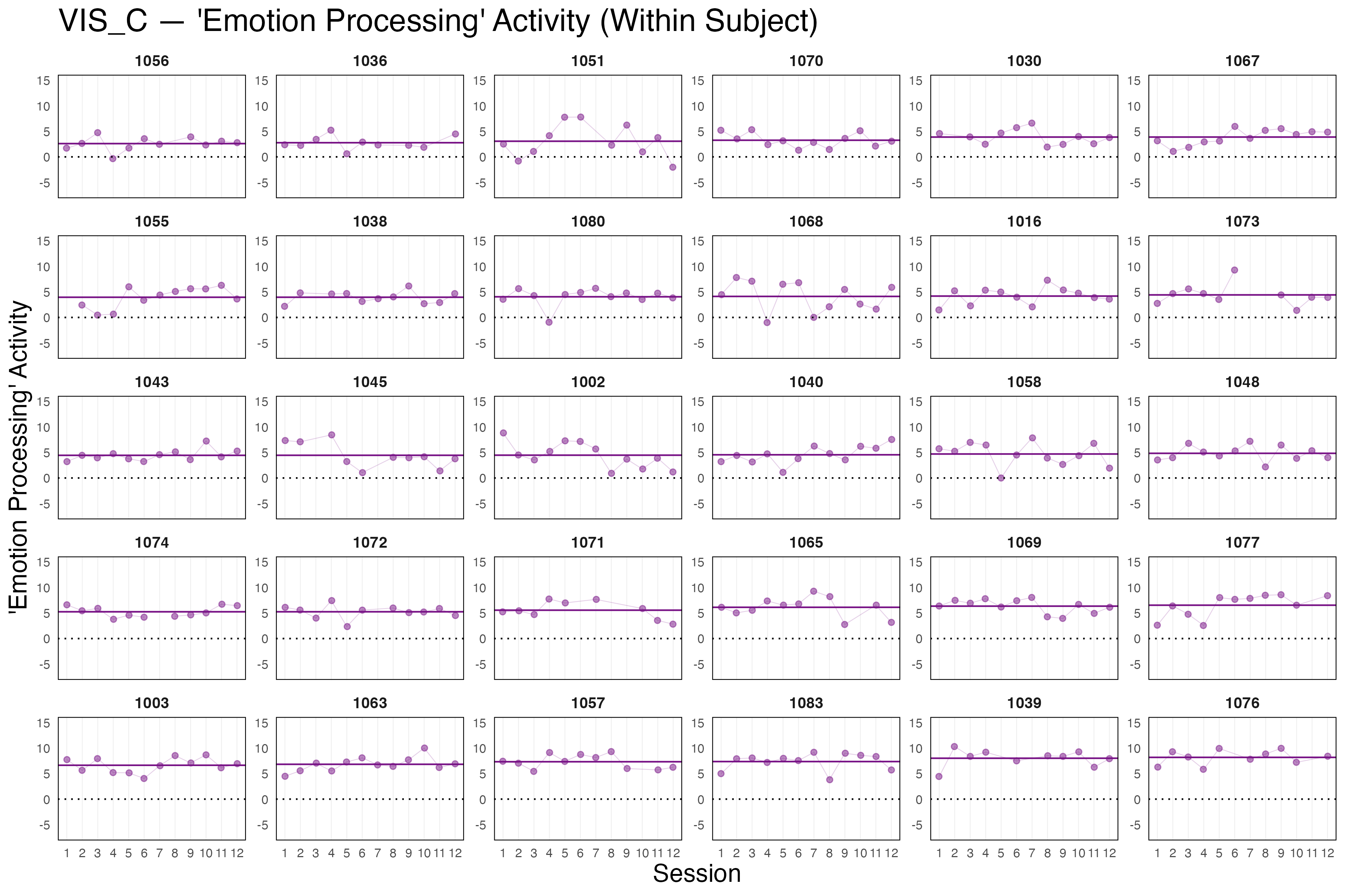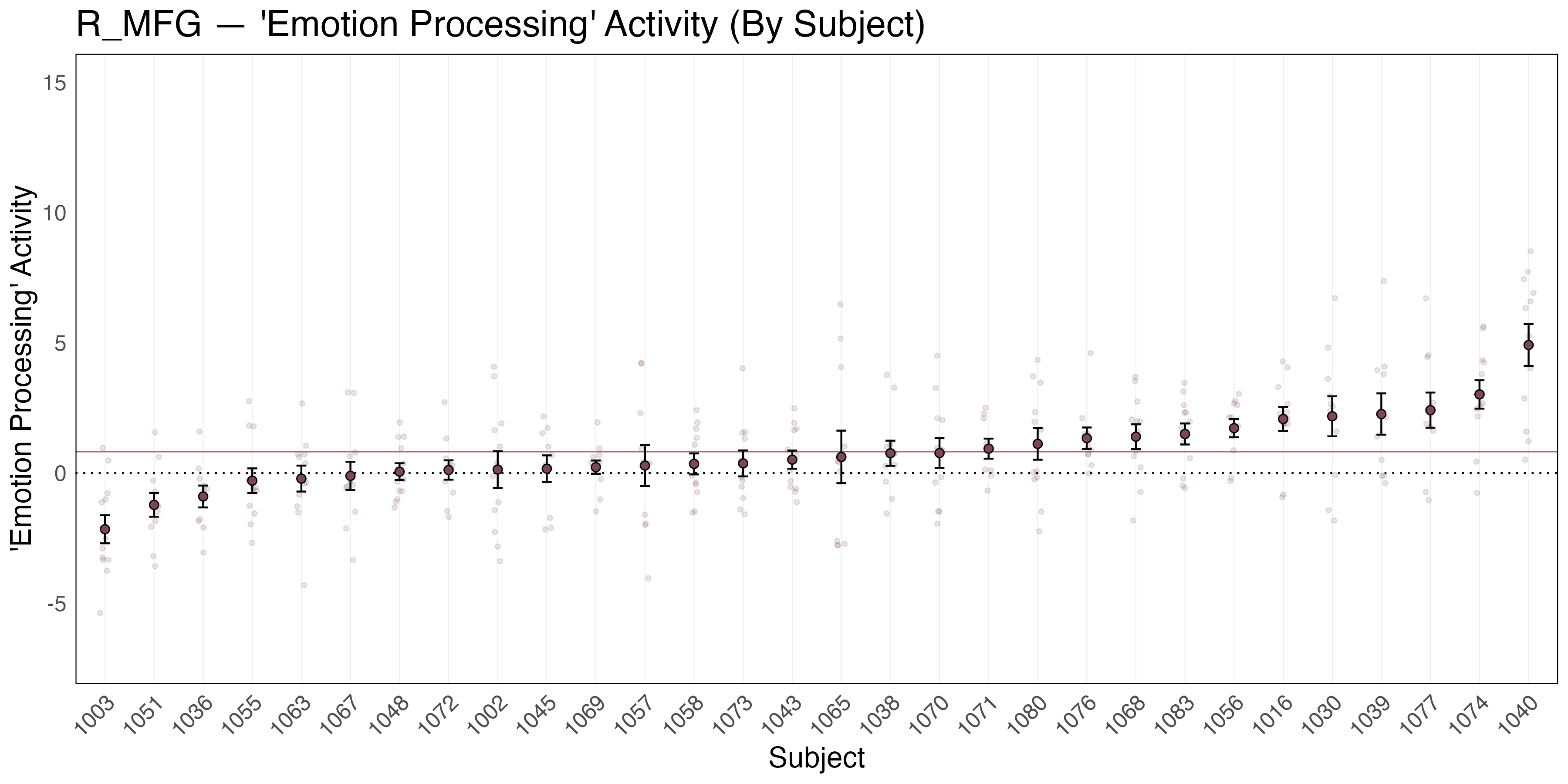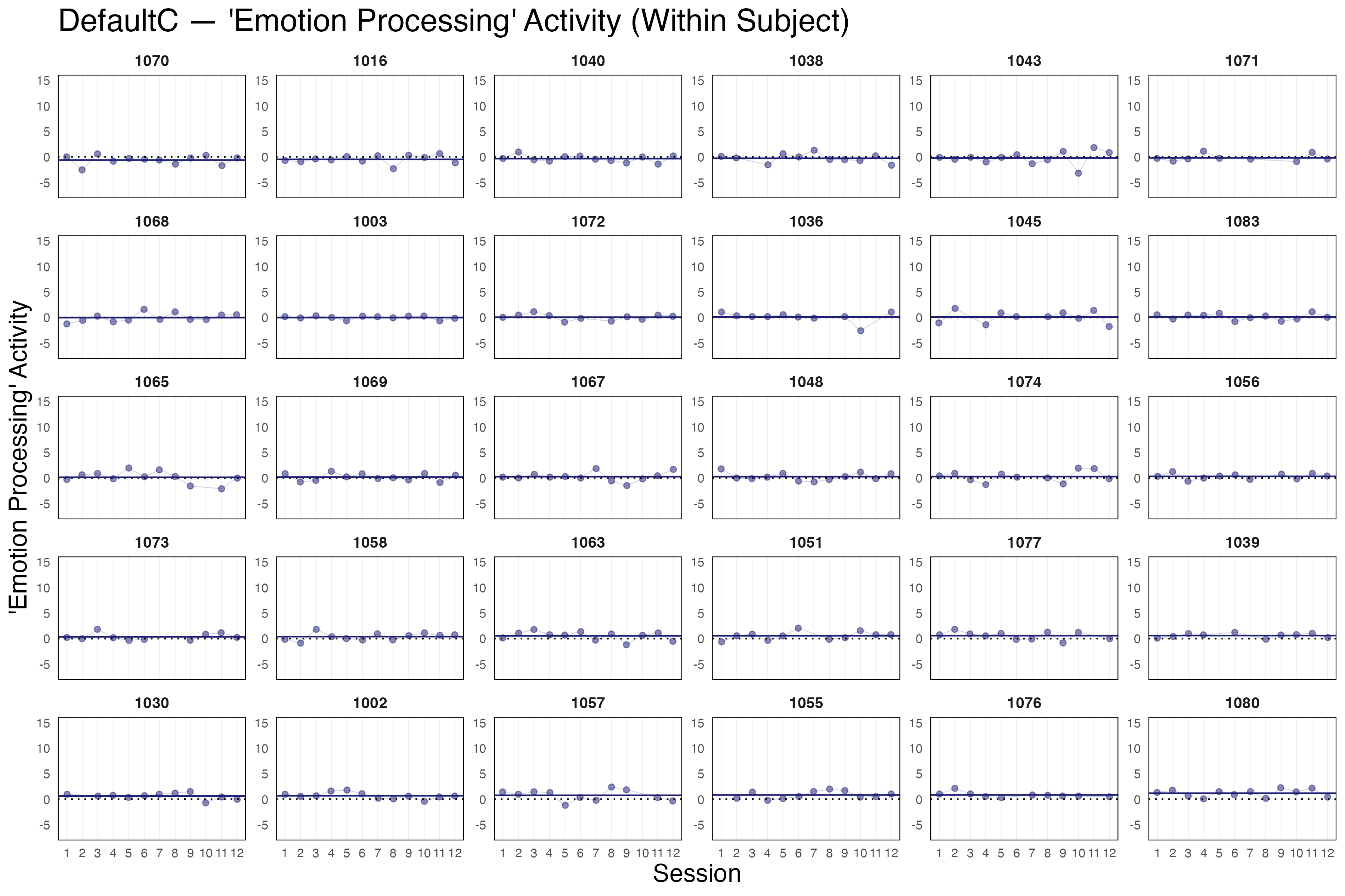 Amygdala. By reviewing the between-subject plots, we can see that the within-subject variability in ‘emotion processing’ activity in the amygdala (the transparent points) is as large or larger than the between-subject variability.