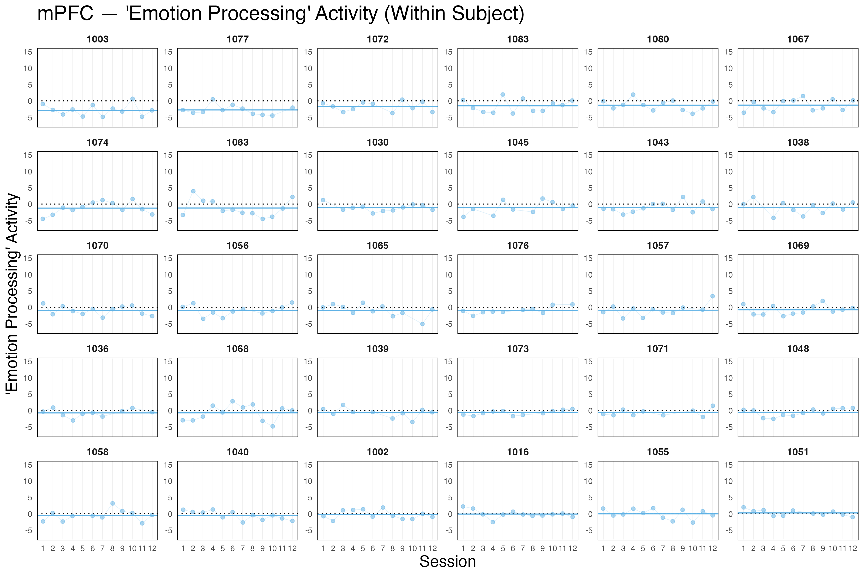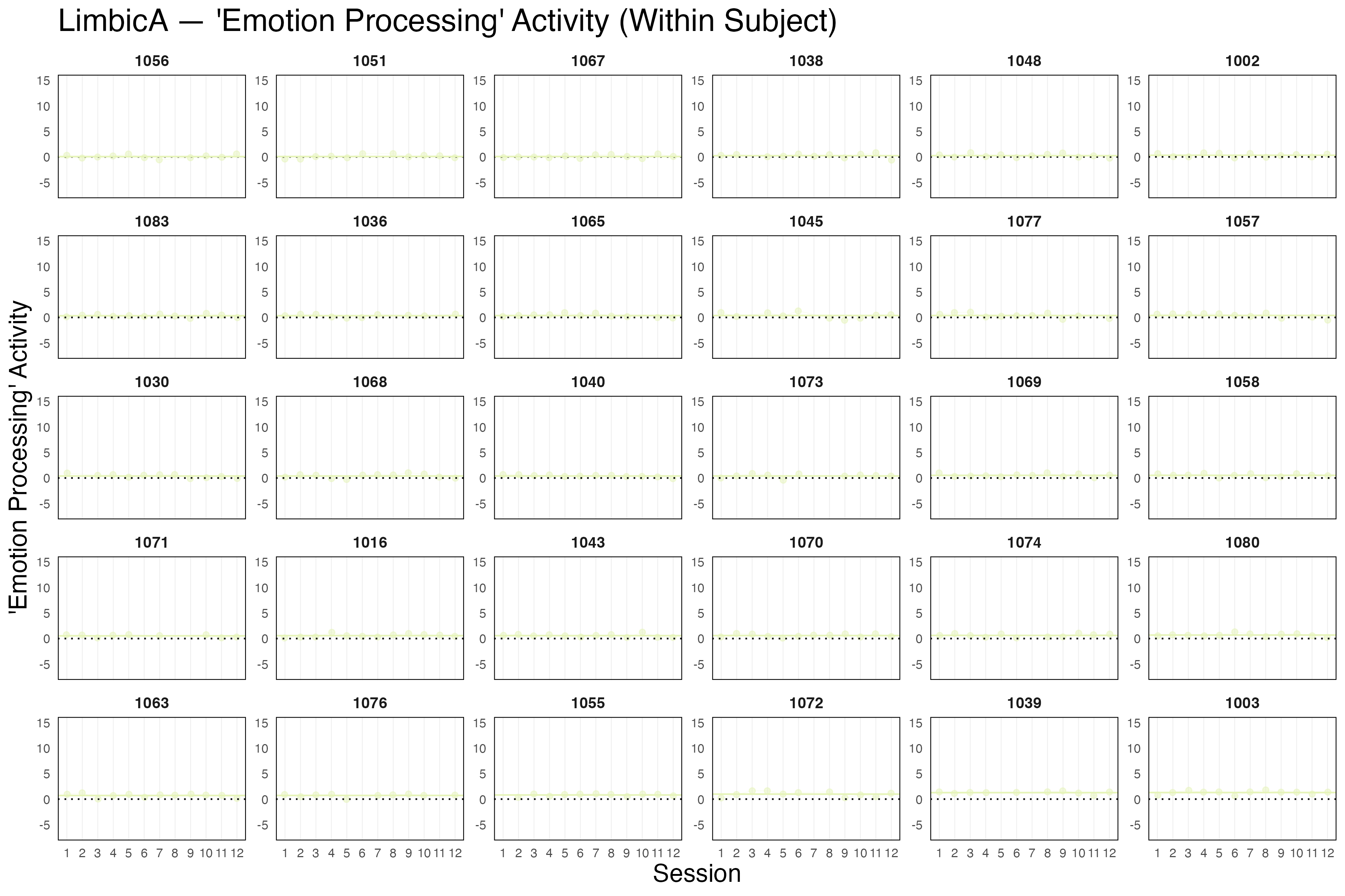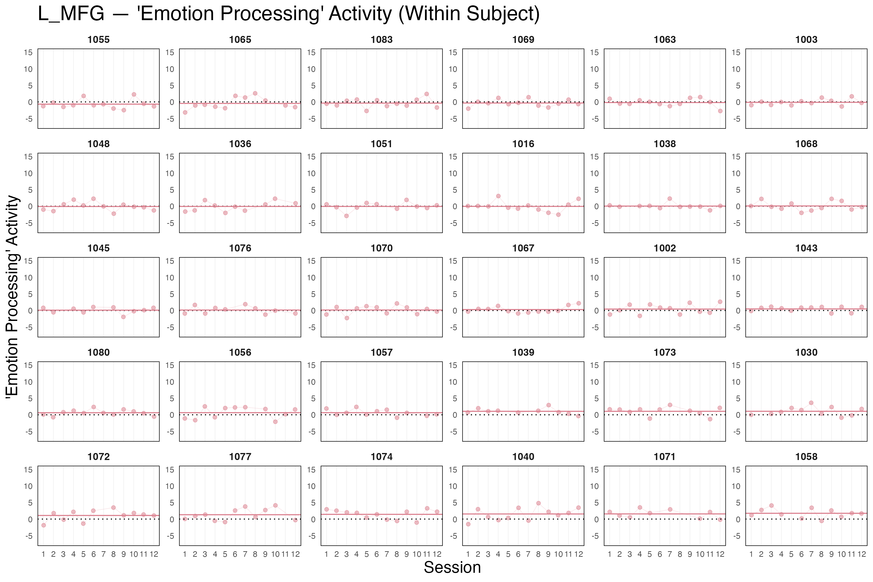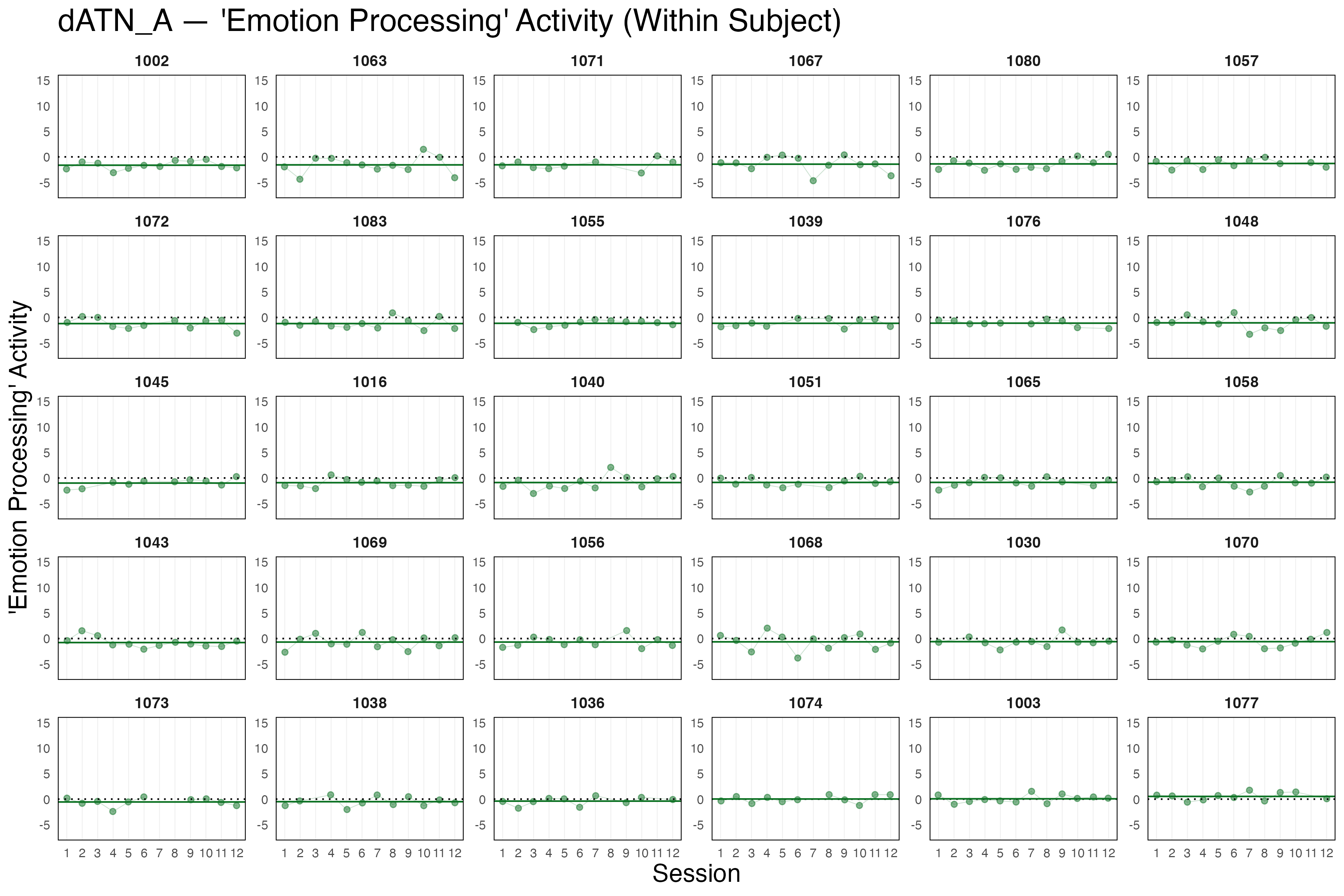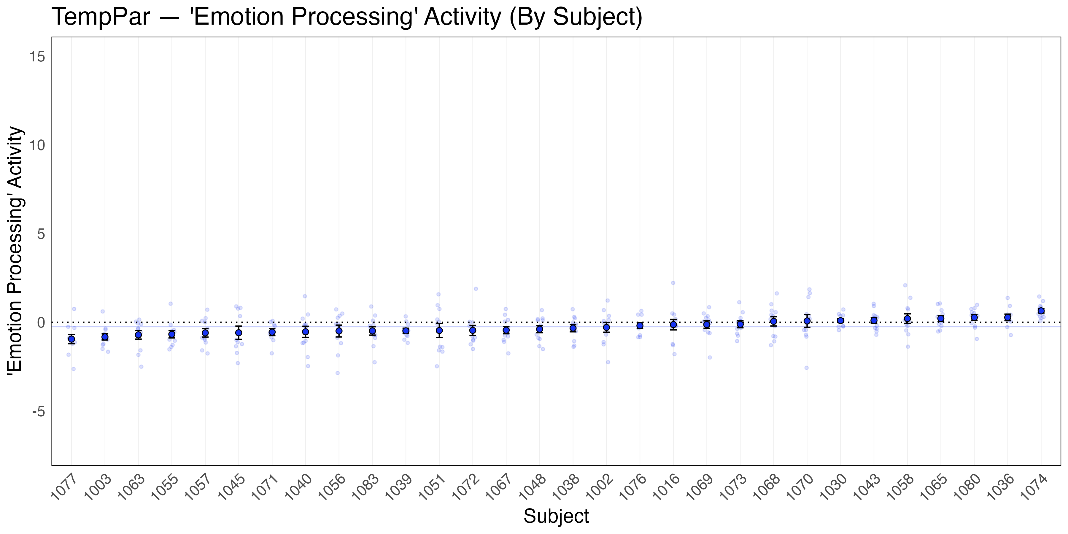 Amygdala. By reviewing the between-subject plots, we can see that the within-subject variability in ‘emotion processing’ activity in the amygdala (the transparent points) is as large or larger than the between-subject variability.