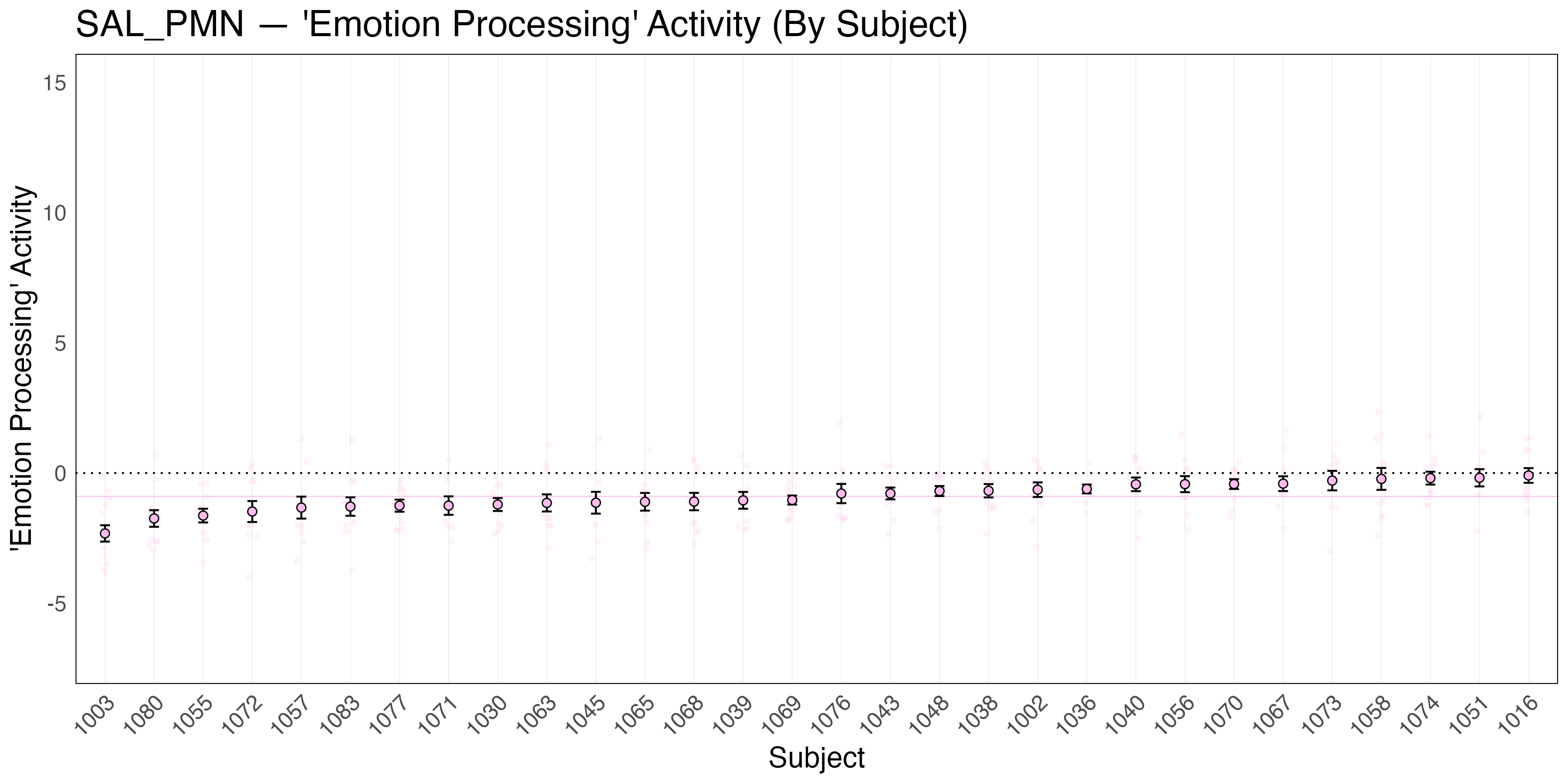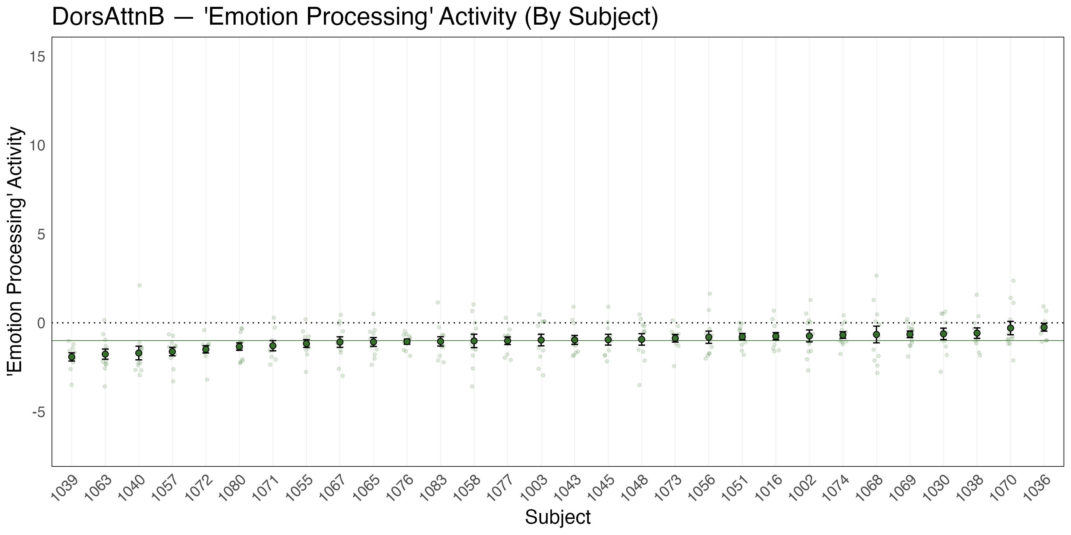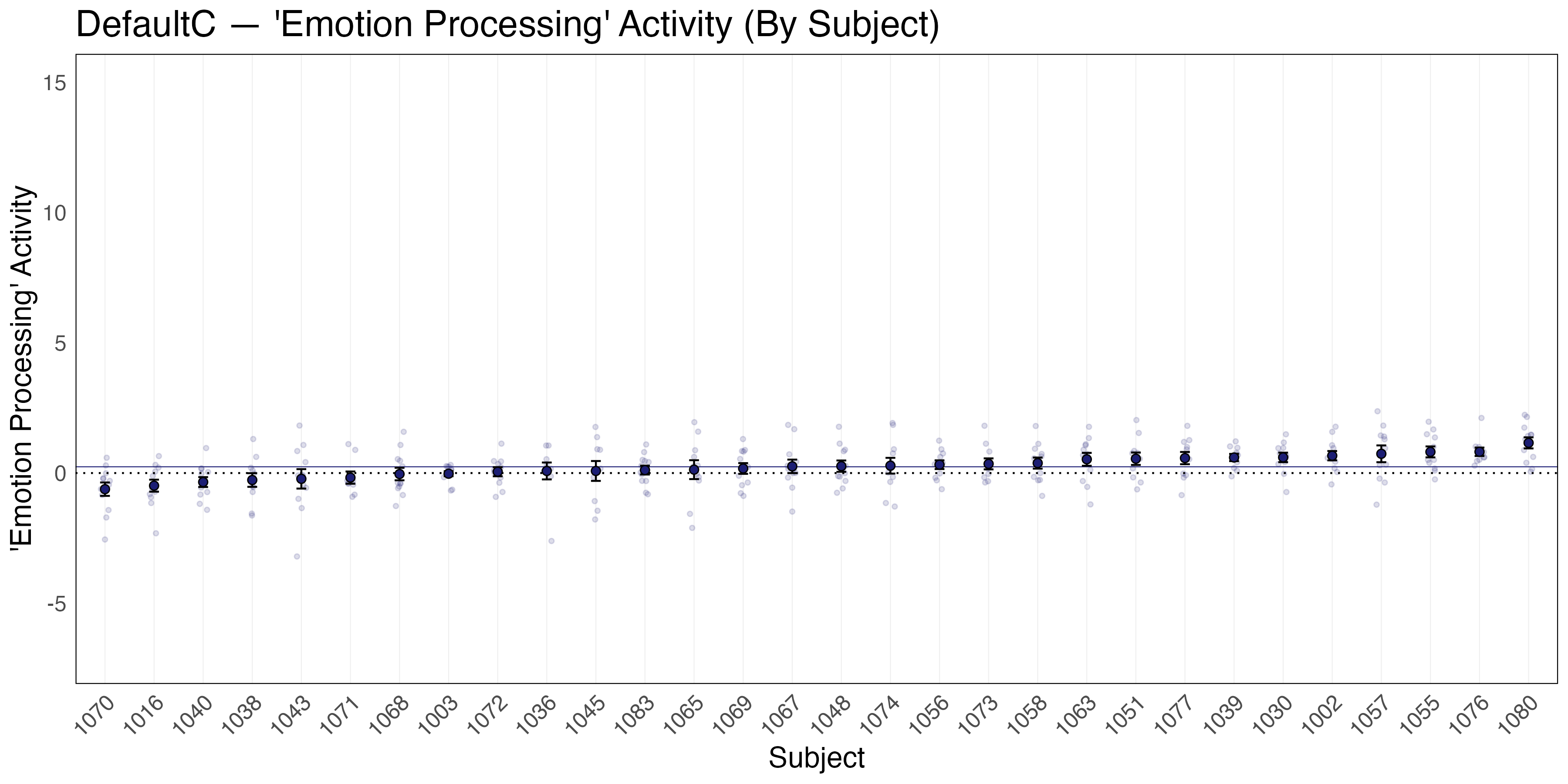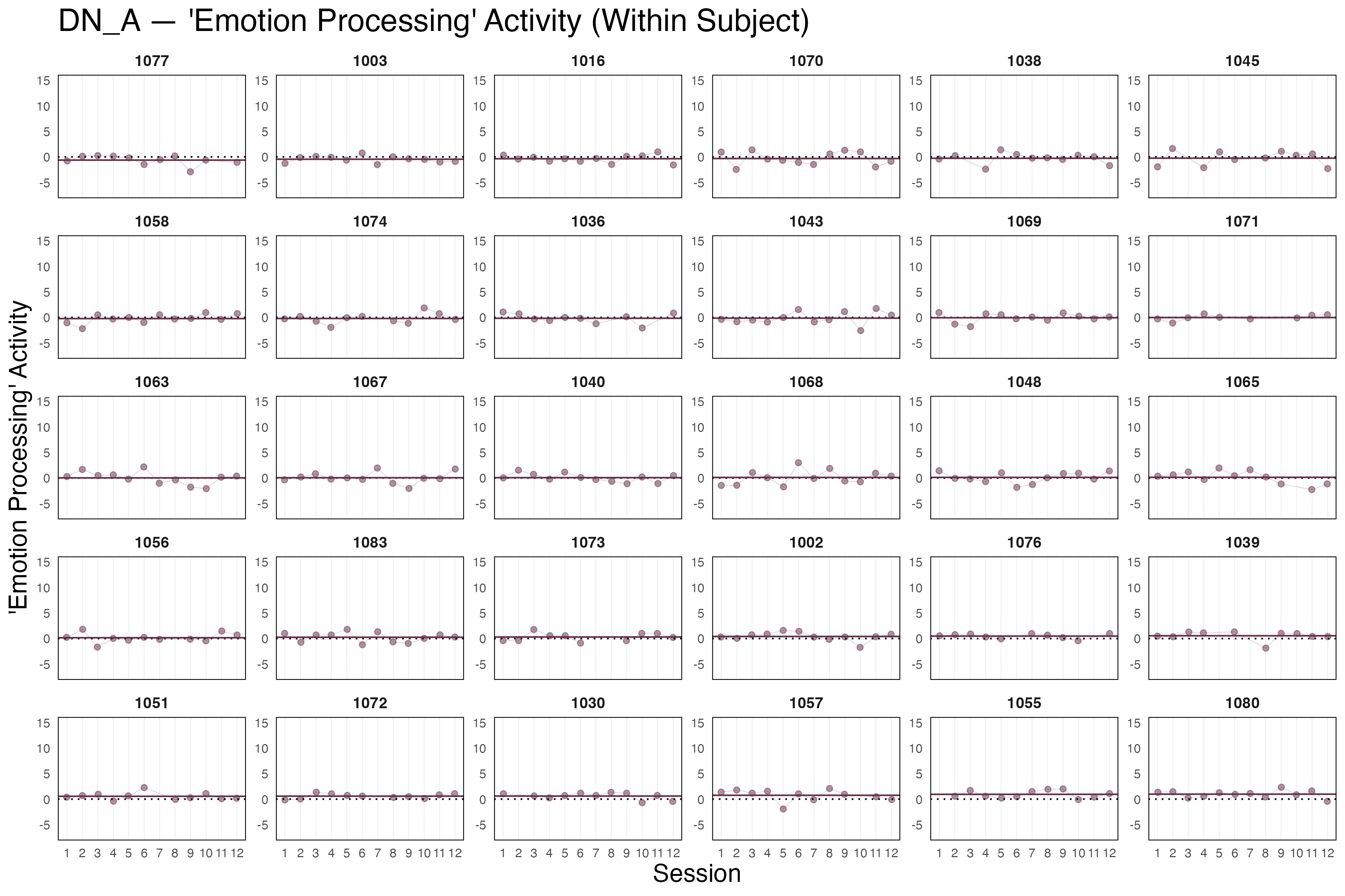 Amygdala. By reviewing the between-subject plots, we can see that the within-subject variability in ‘emotion processing’ activity in the amygdala (the transparent points) is as large or larger than the between-subject variability.