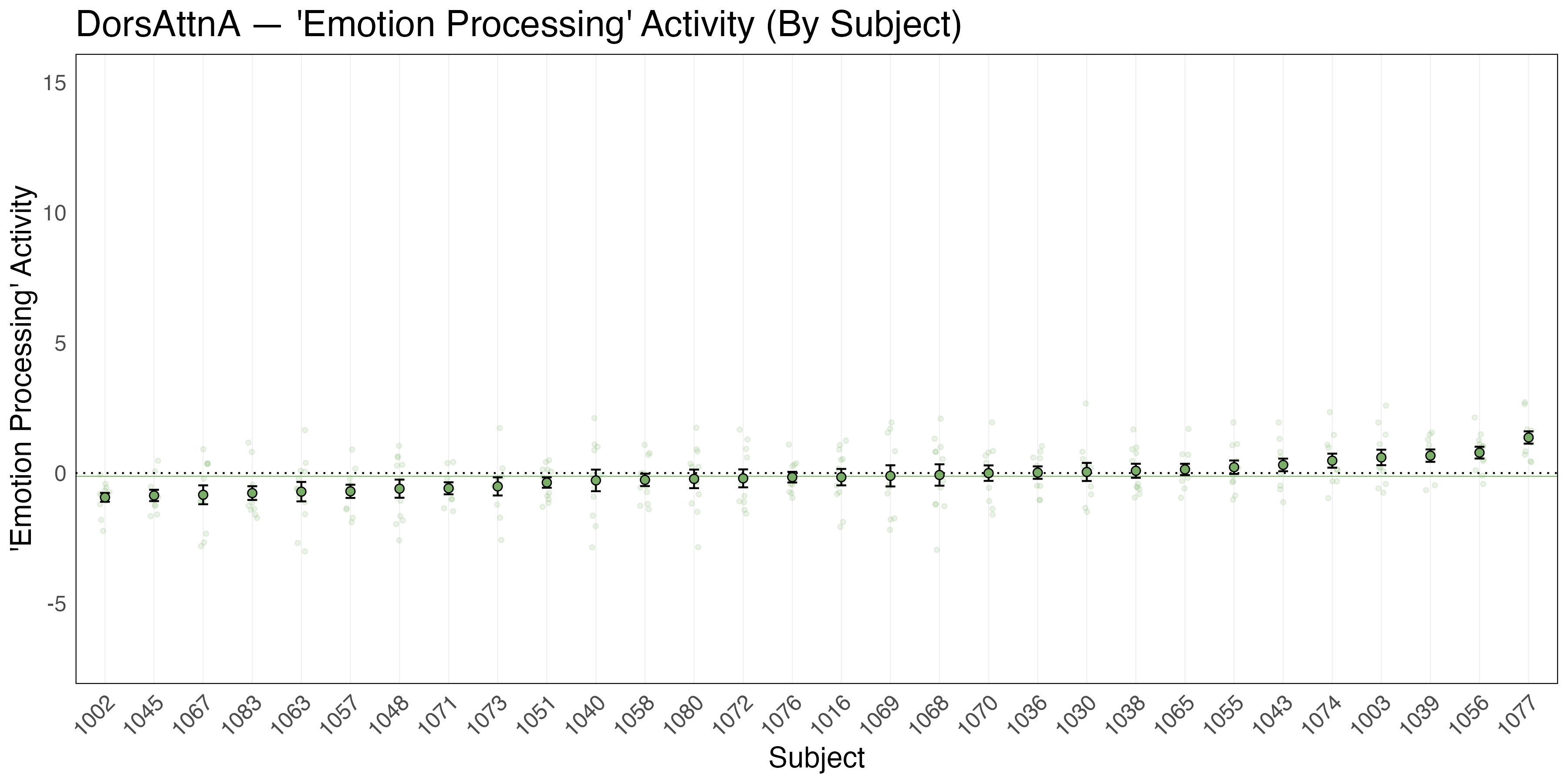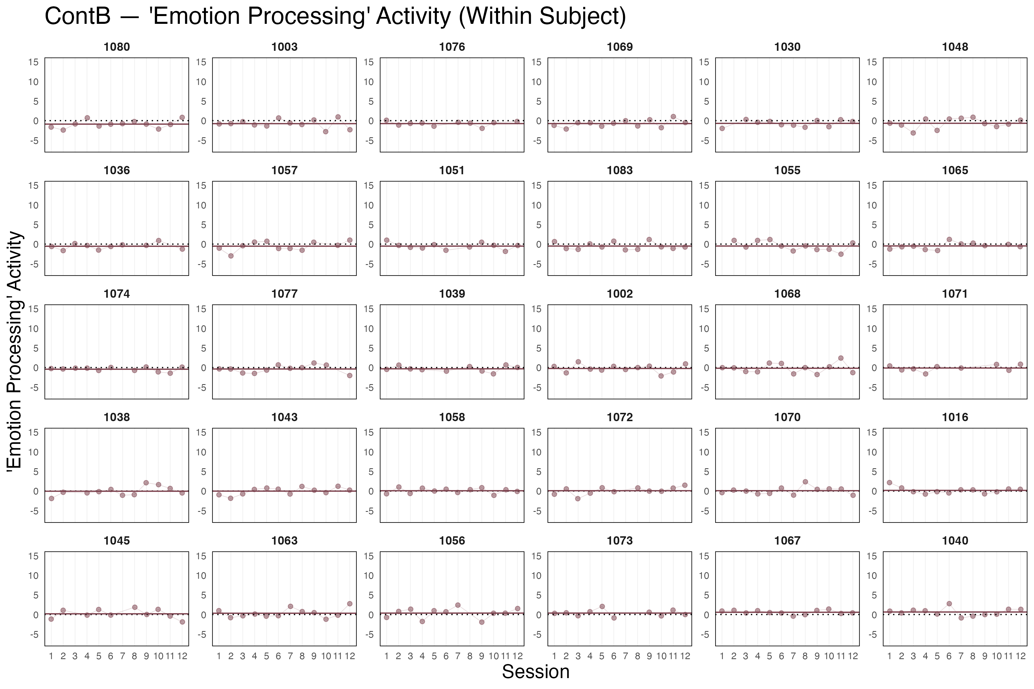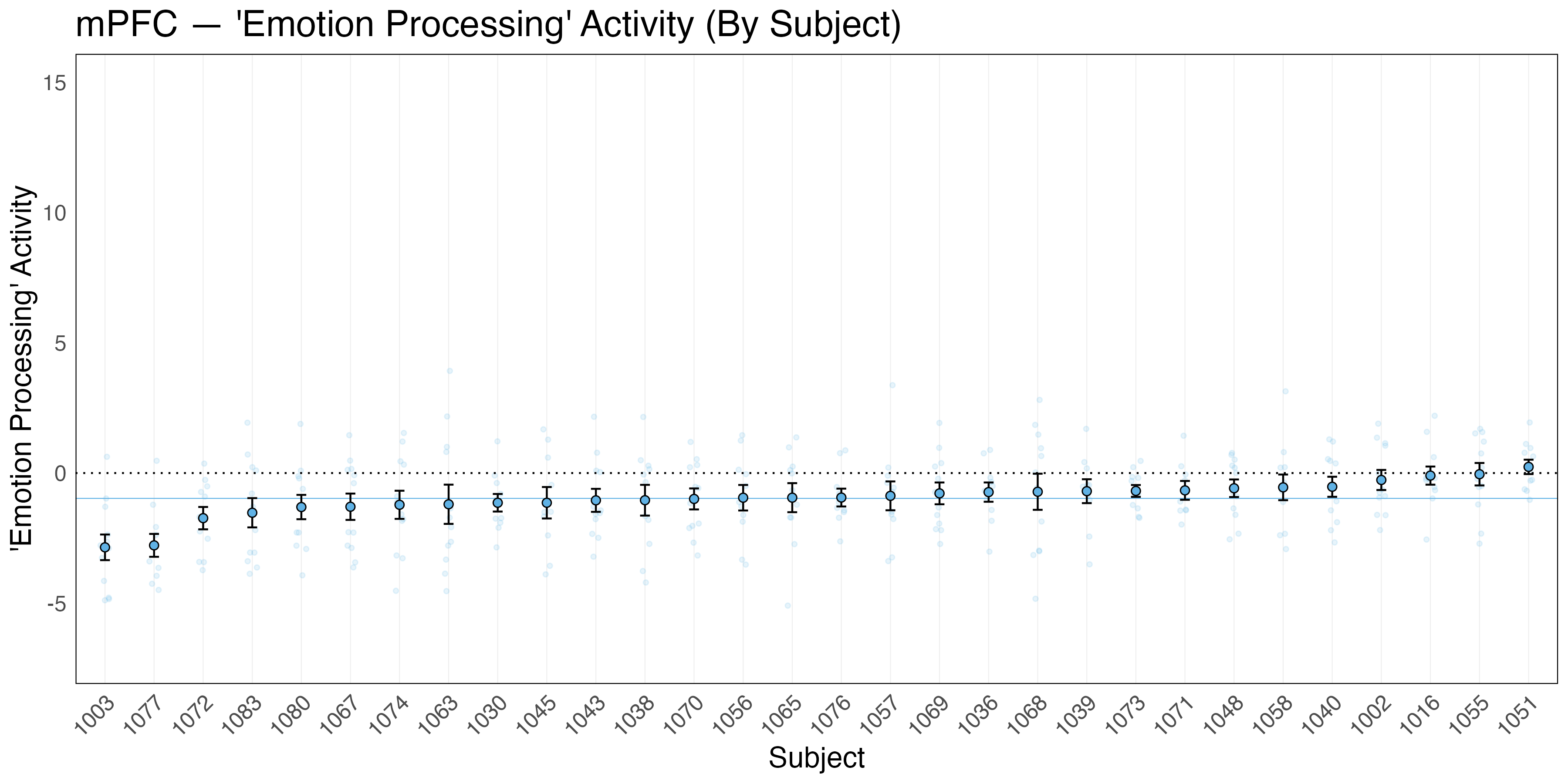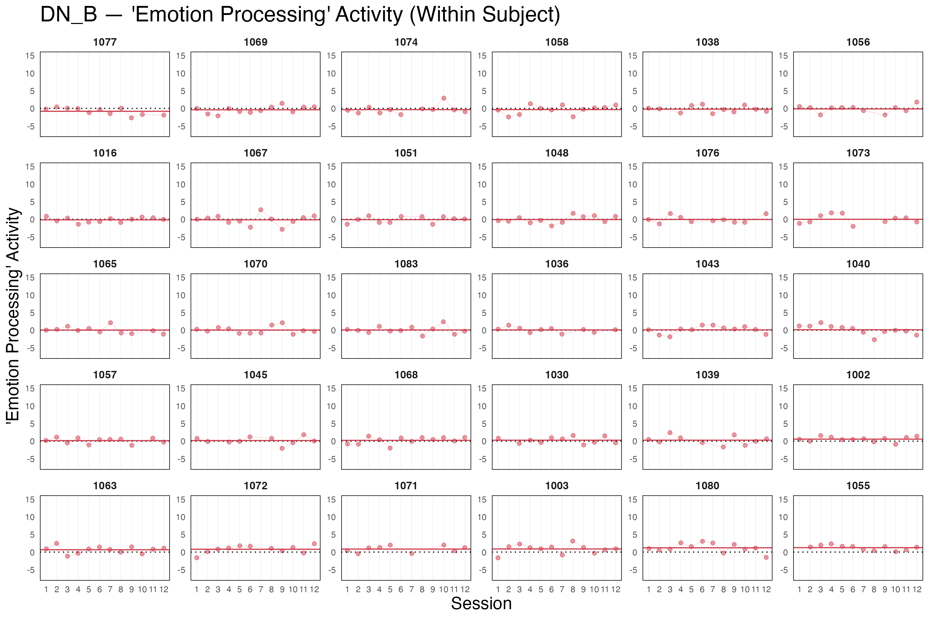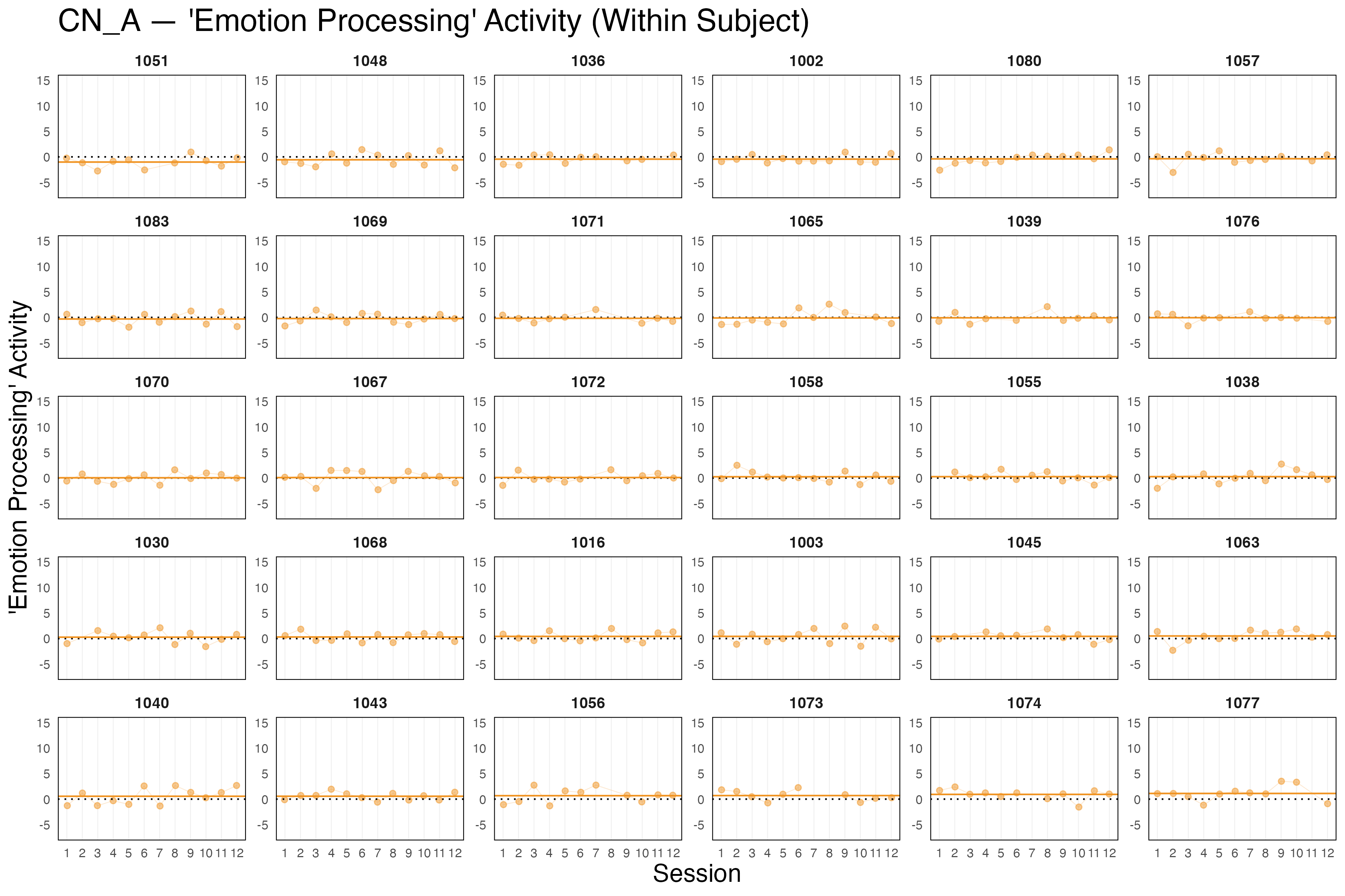 Amygdala. By reviewing the between-subject plots, we can see that the within-subject variability in ‘emotion processing’ activity in the amygdala (the transparent points) is as large or larger than the between-subject variability.