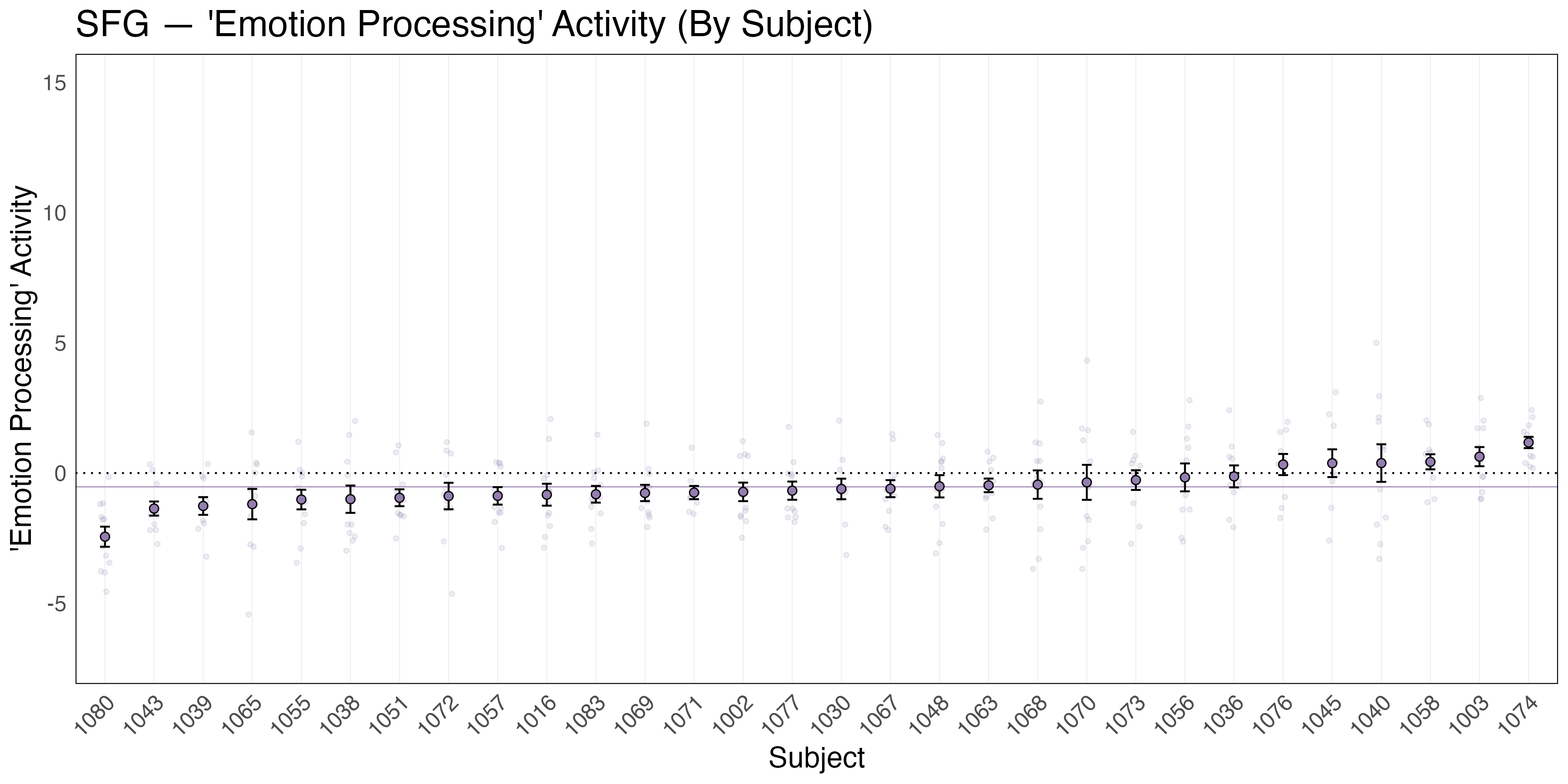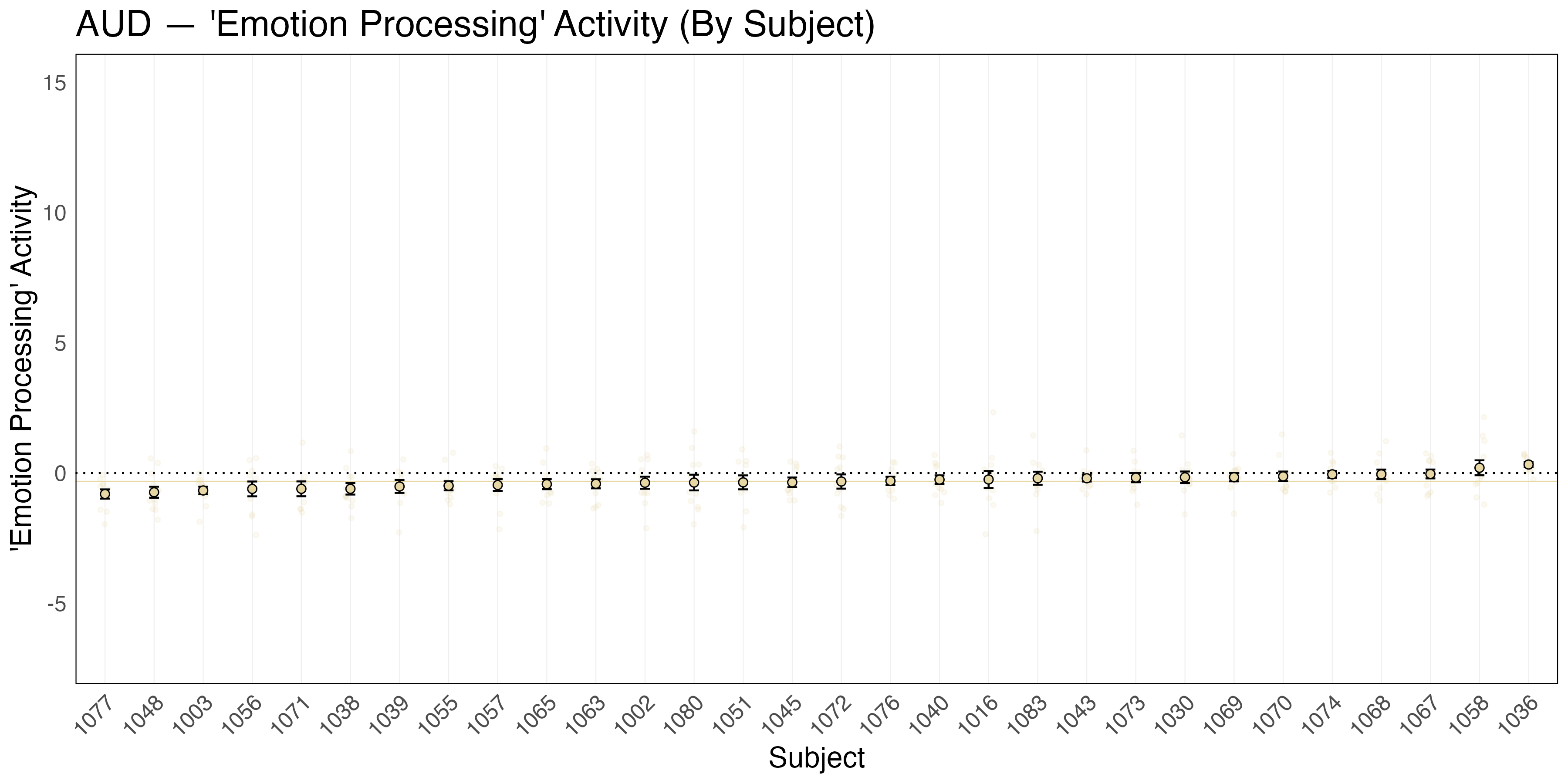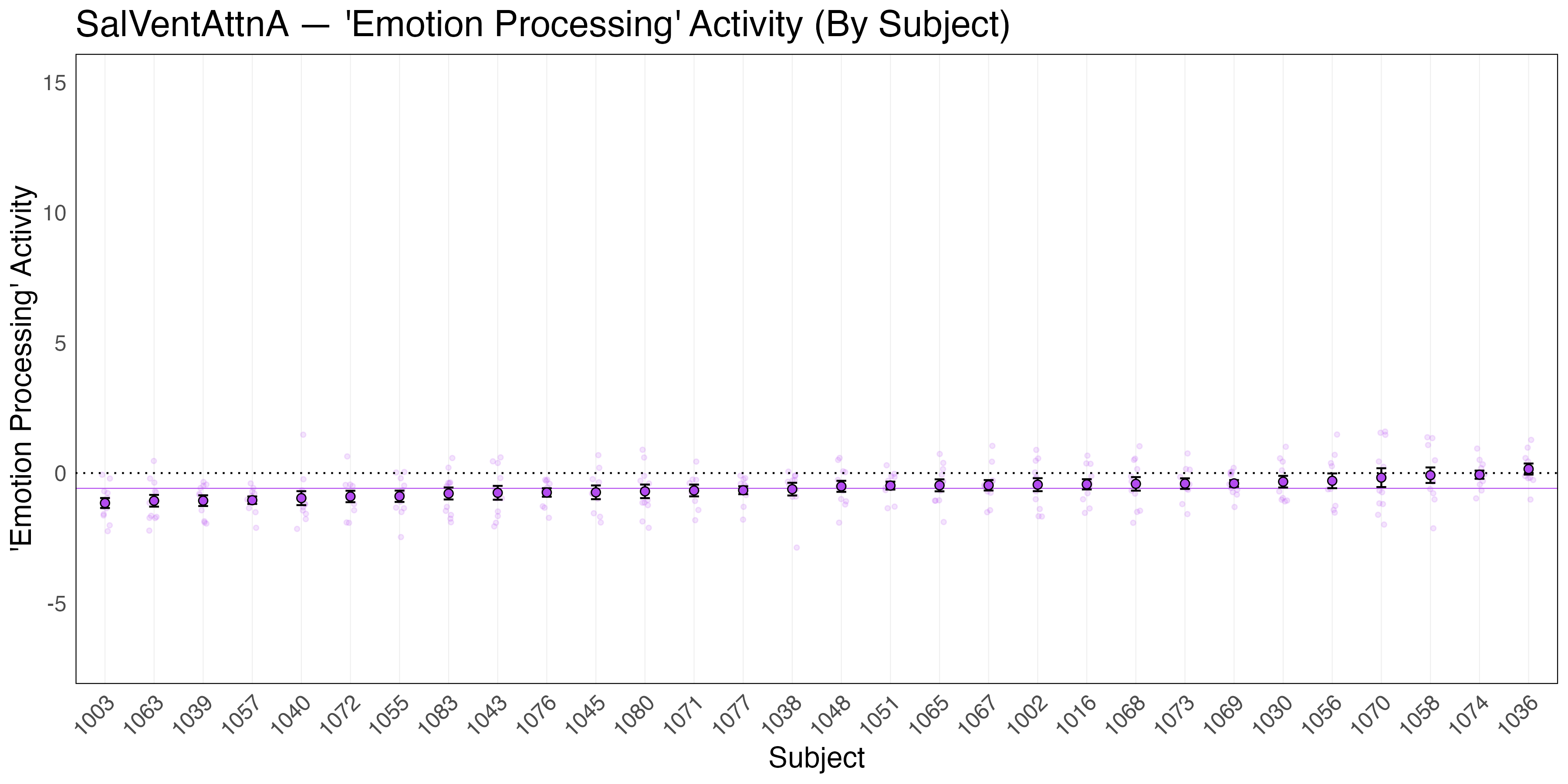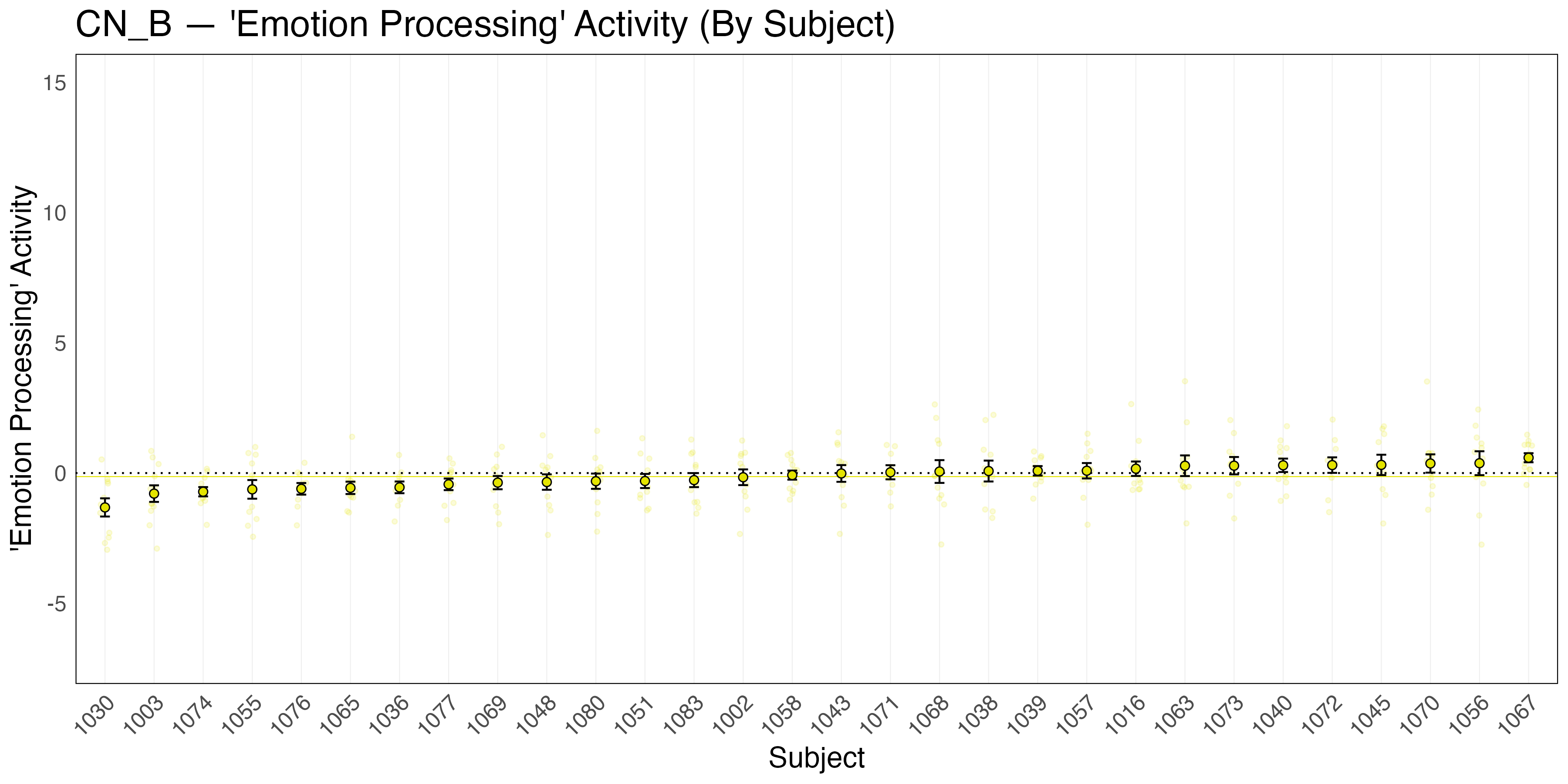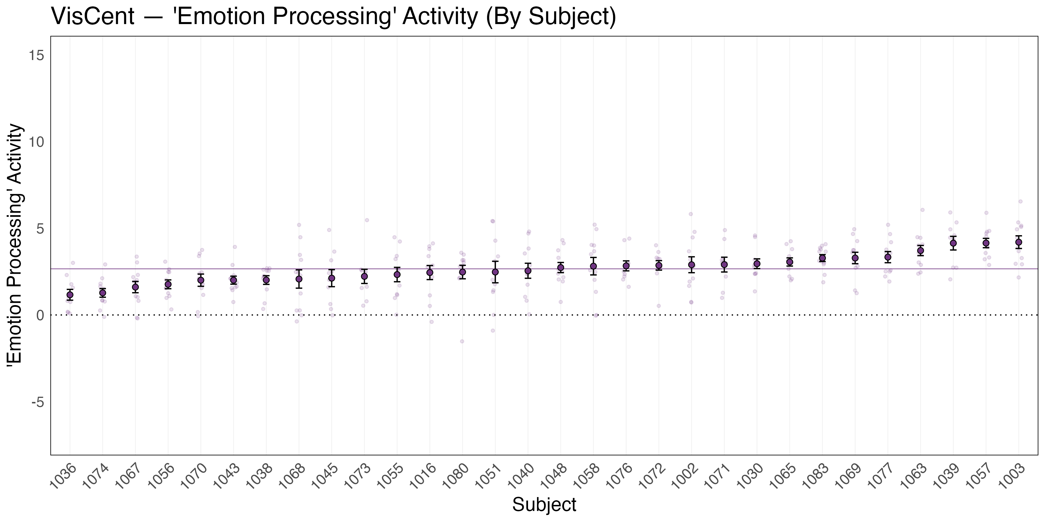 Amygdala. By reviewing the between-subject plots, we can see that the within-subject variability in ‘emotion processing’ activity in the amygdala (the transparent points) is as large or larger than the between-subject variability.