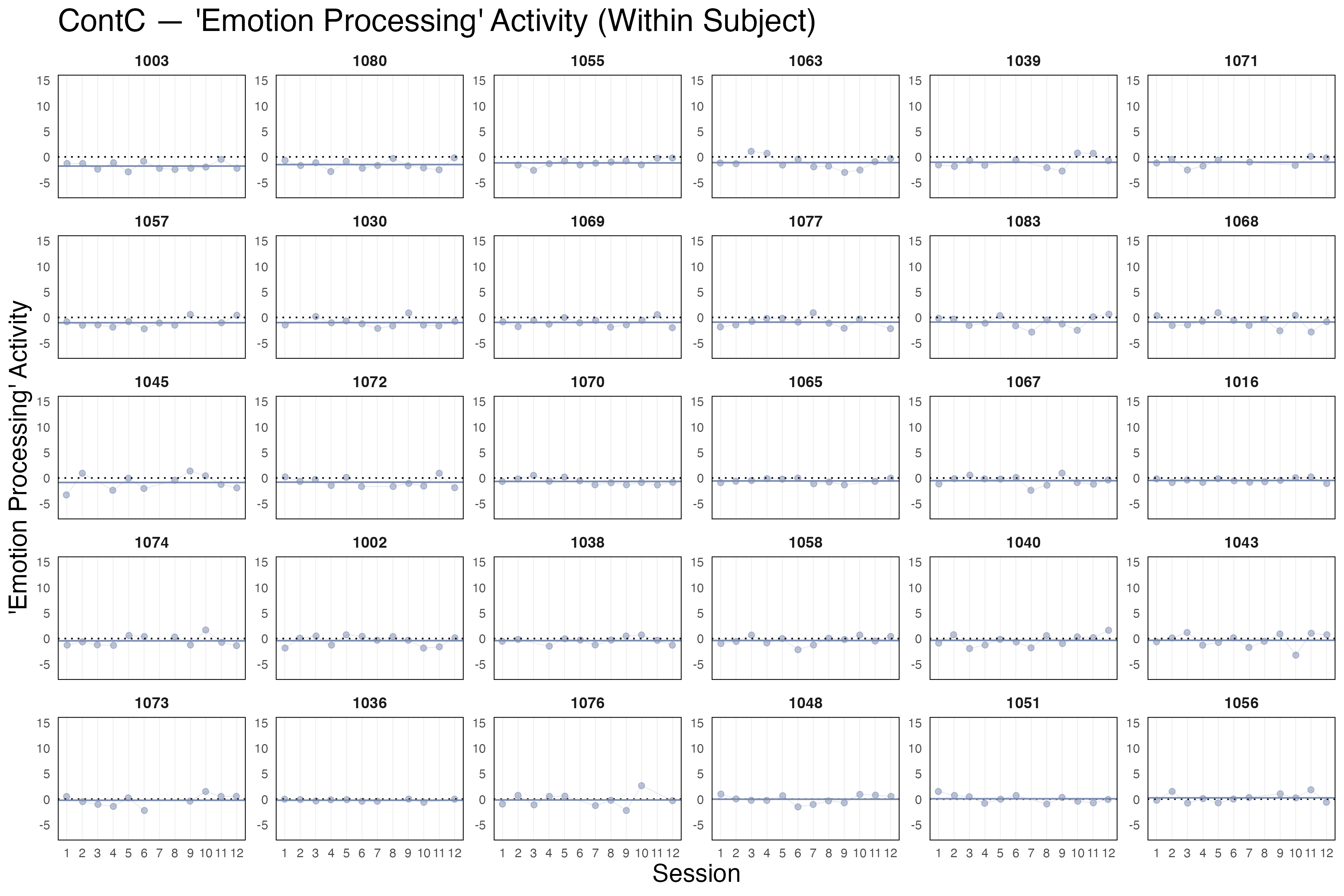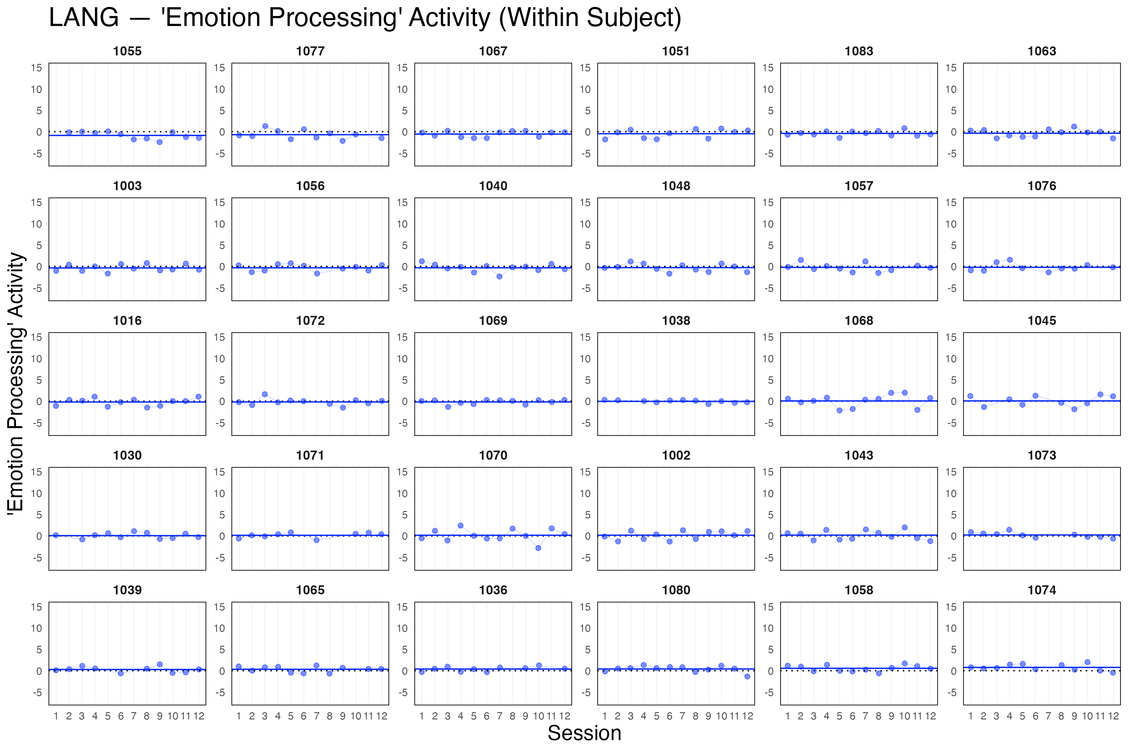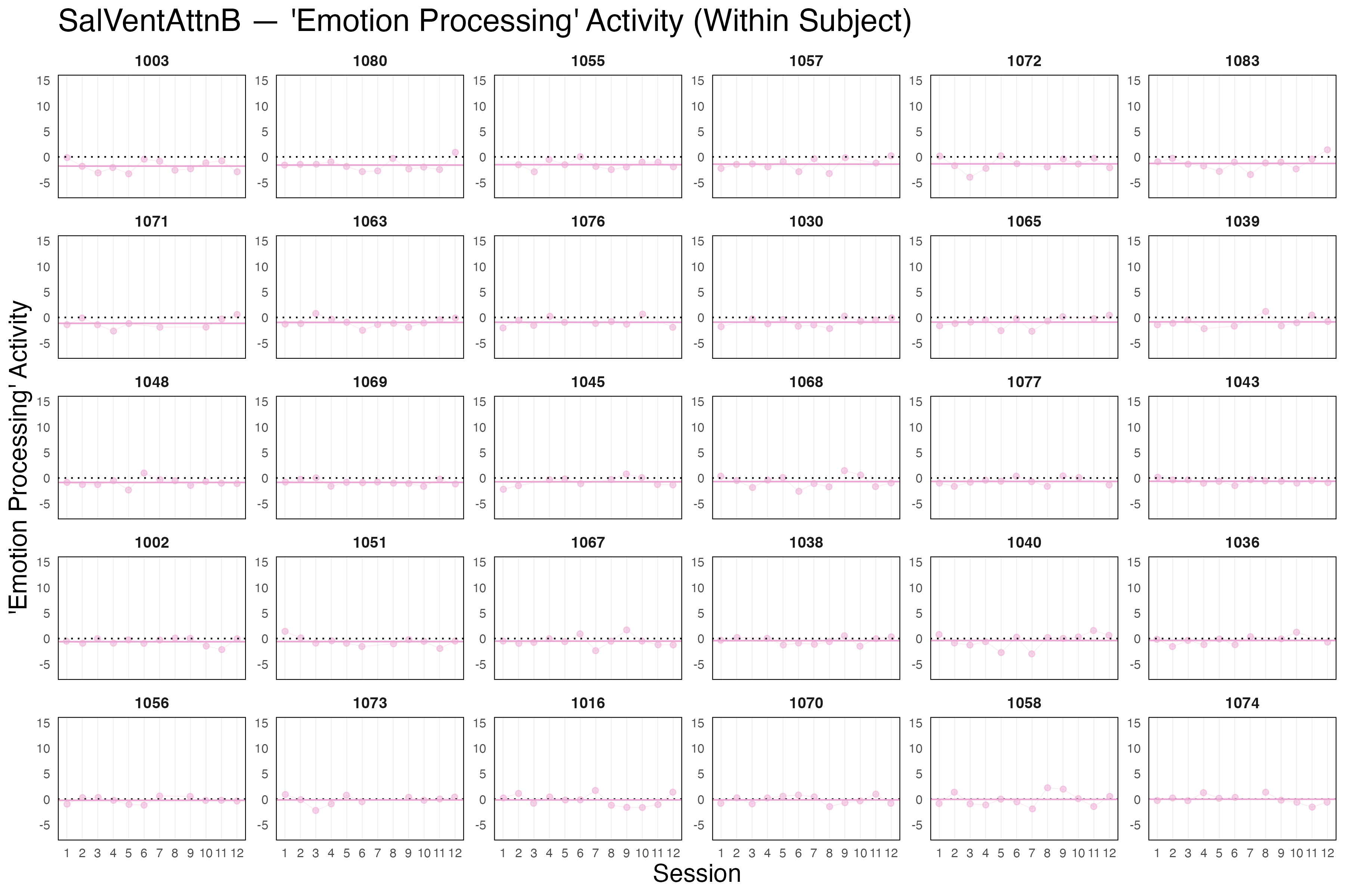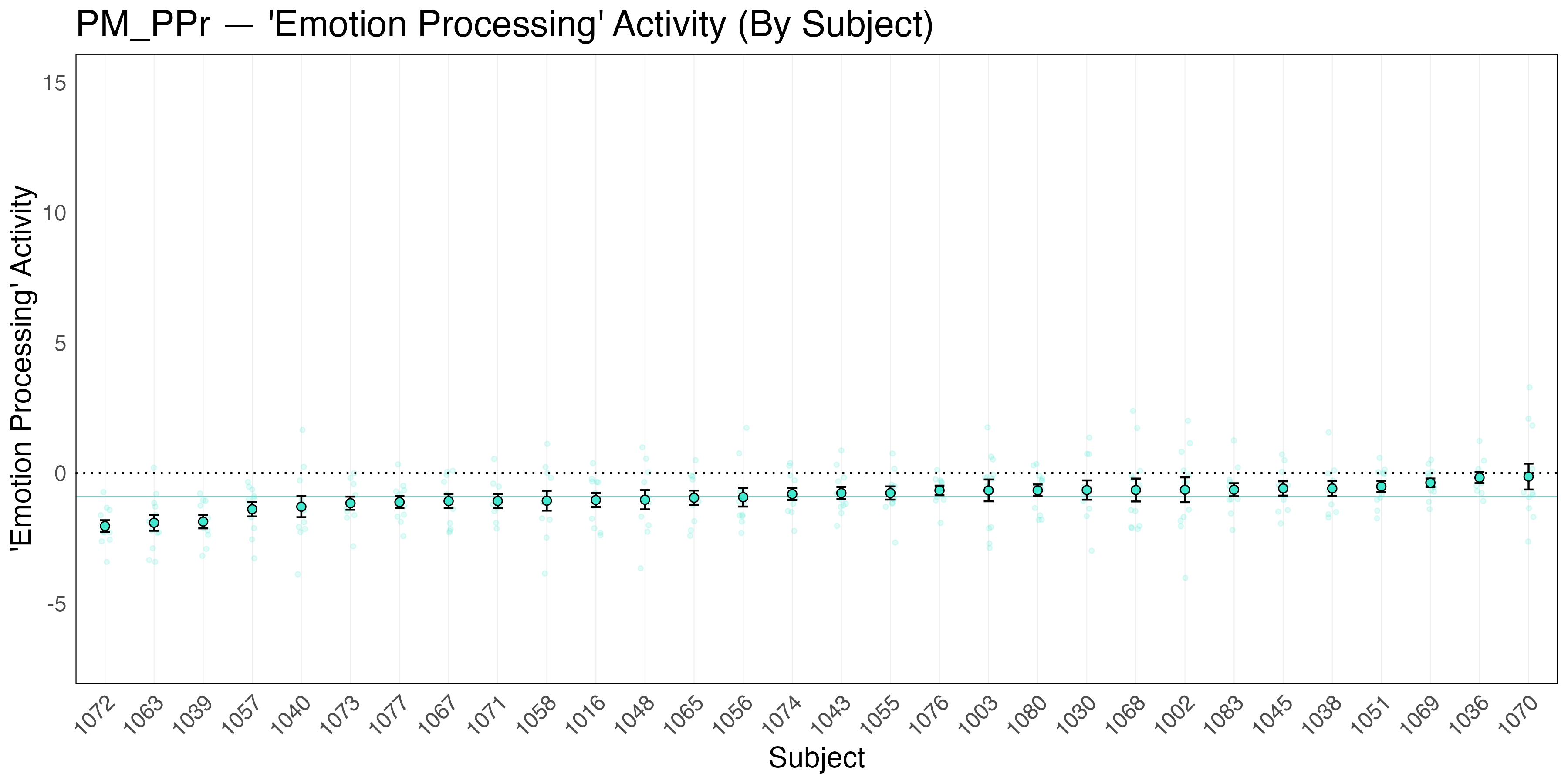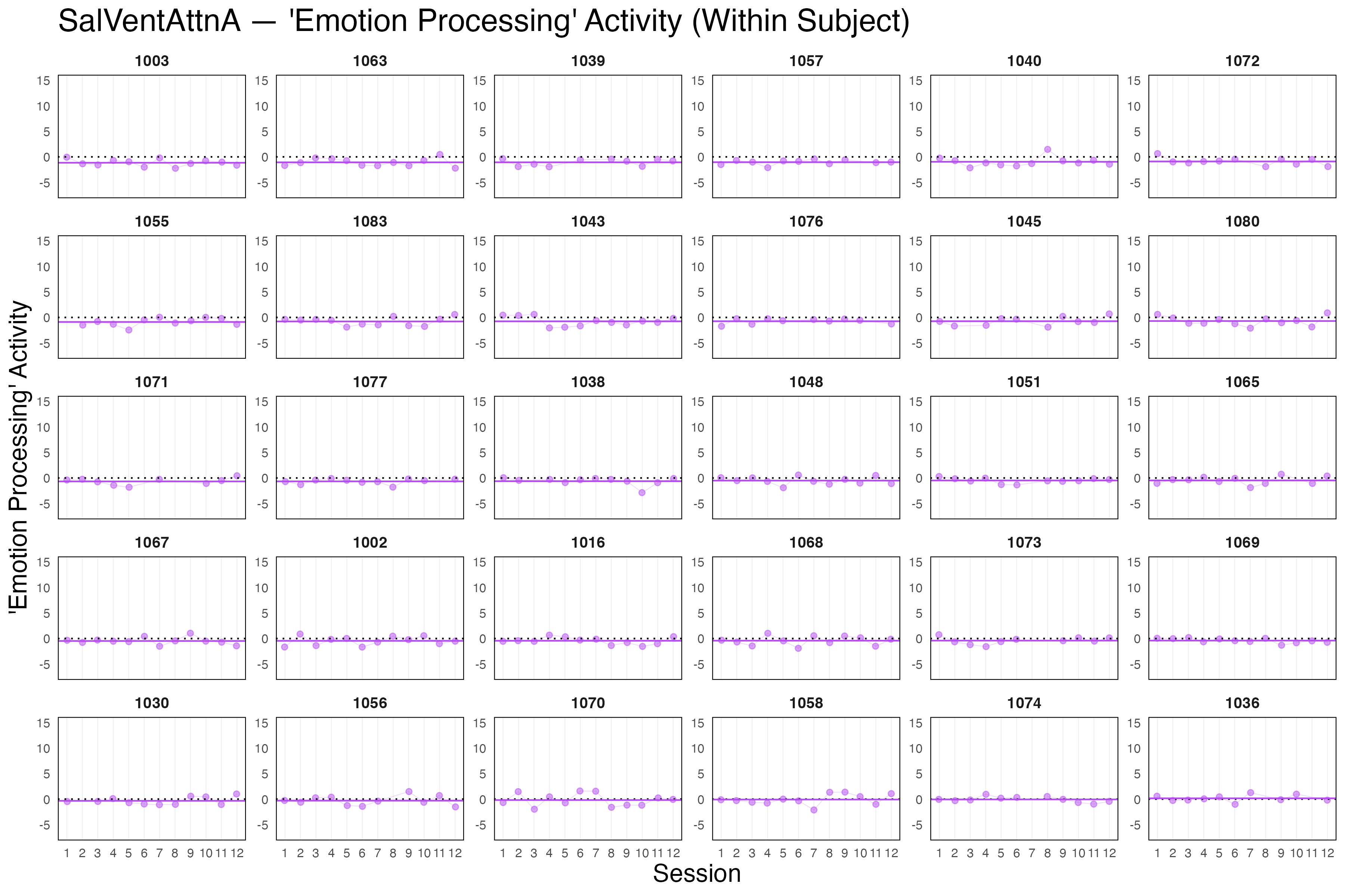 Amygdala. By reviewing the between-subject plots, we can see that the within-subject variability in ‘emotion processing’ activity in the amygdala (the transparent points) is as large or larger than the between-subject variability.