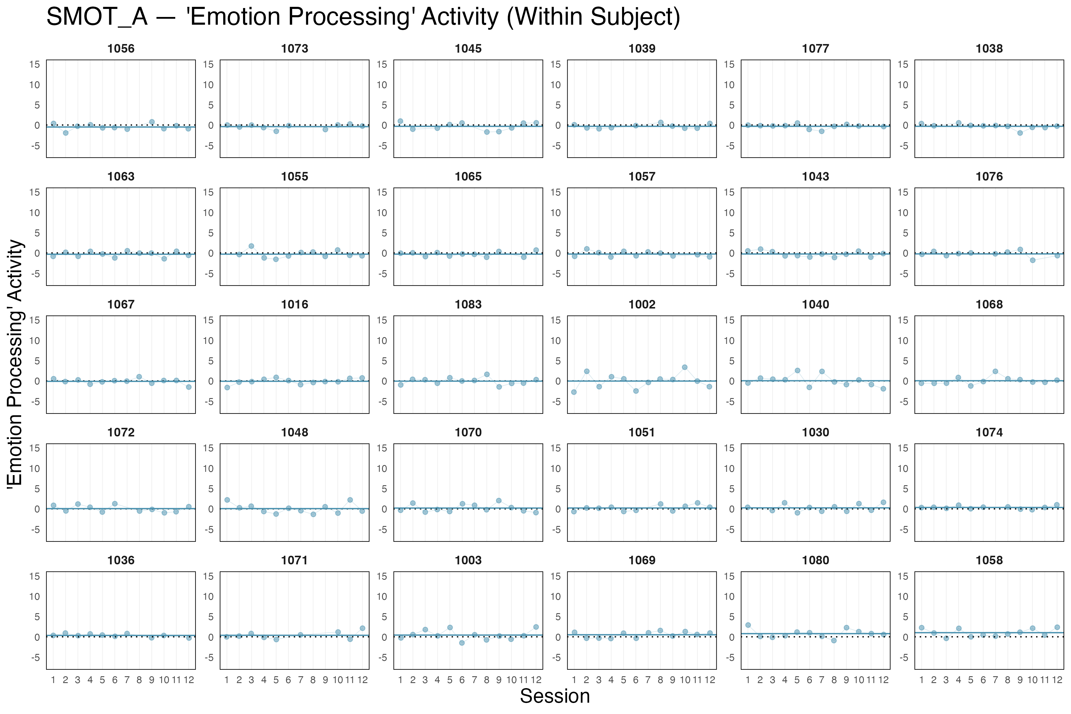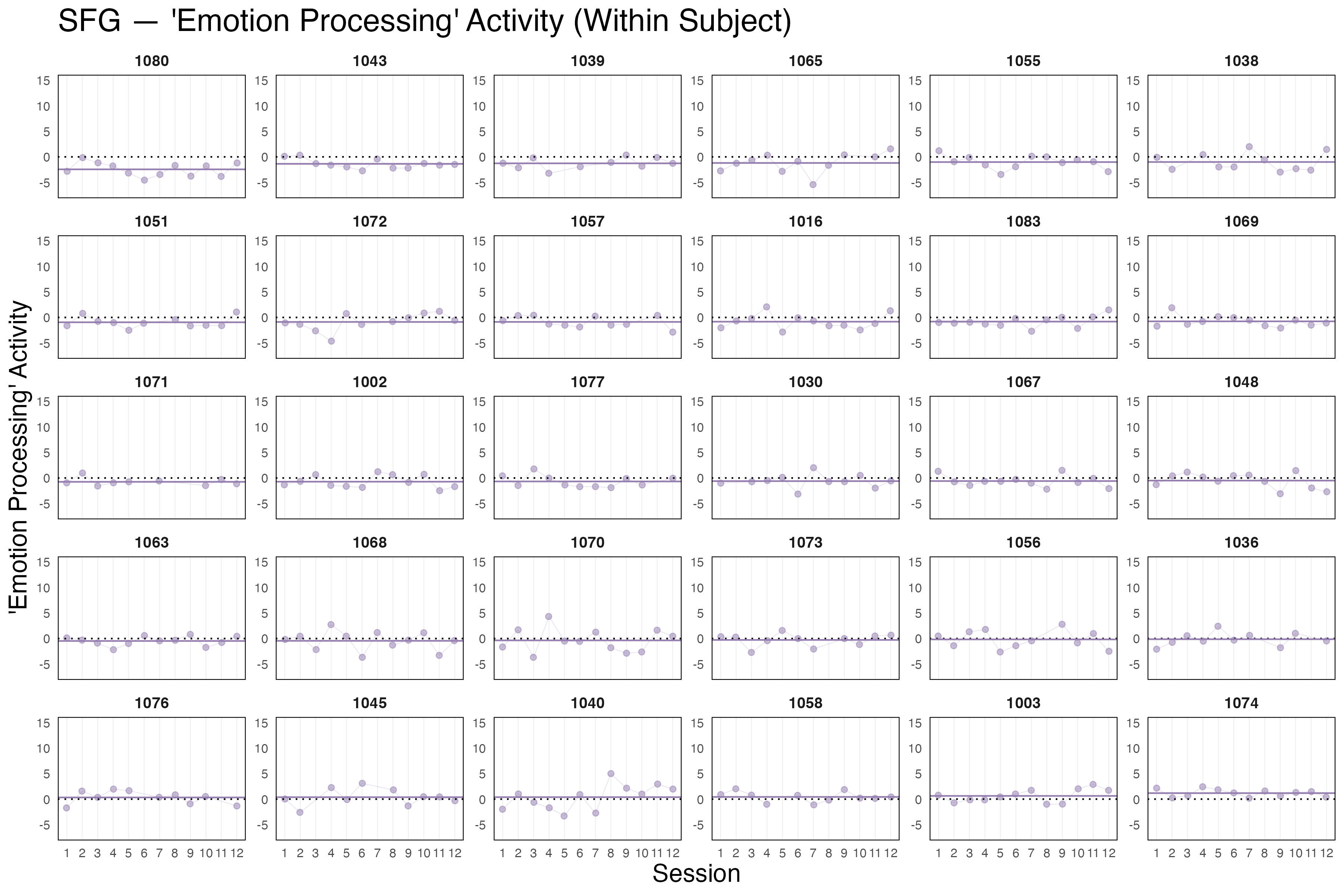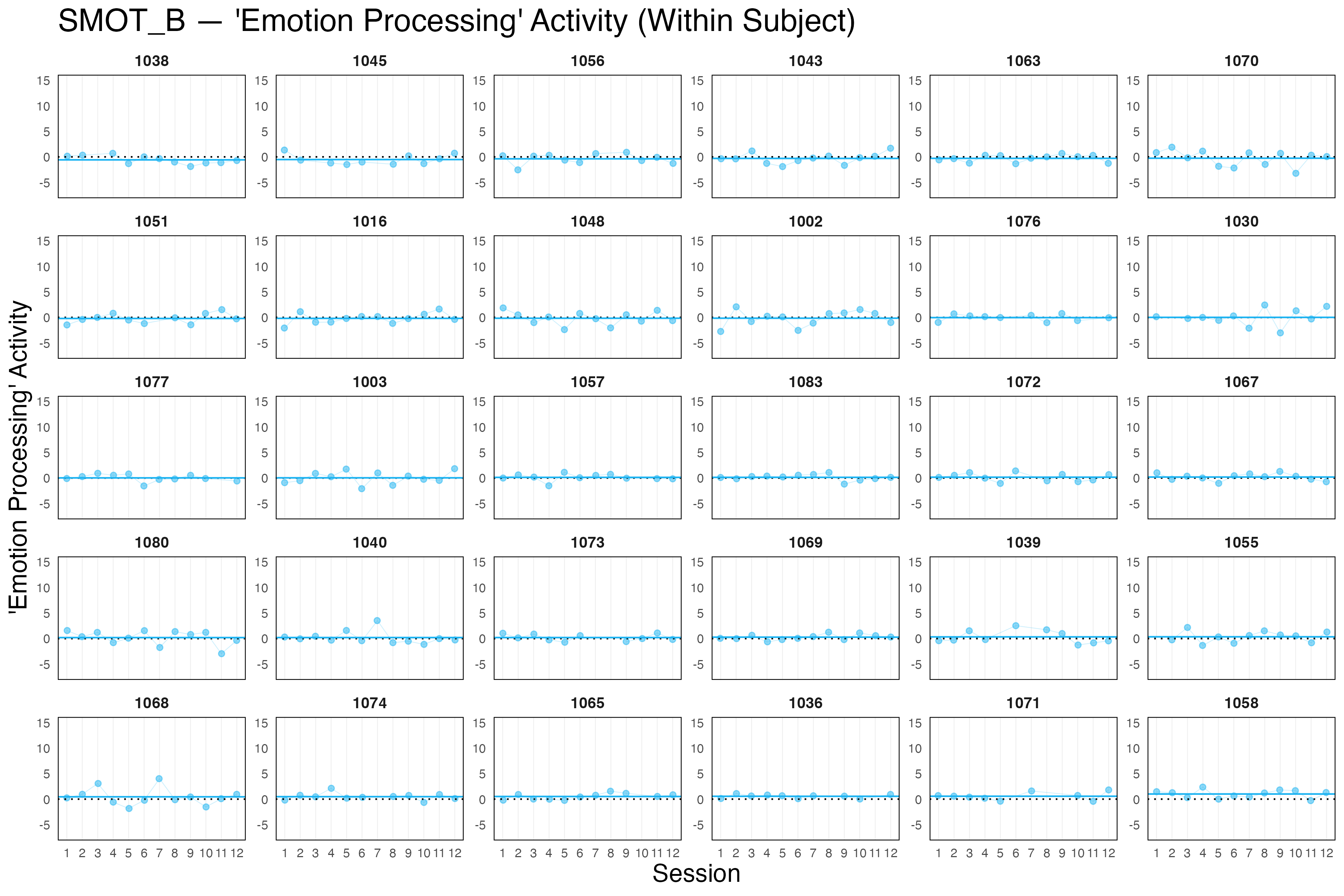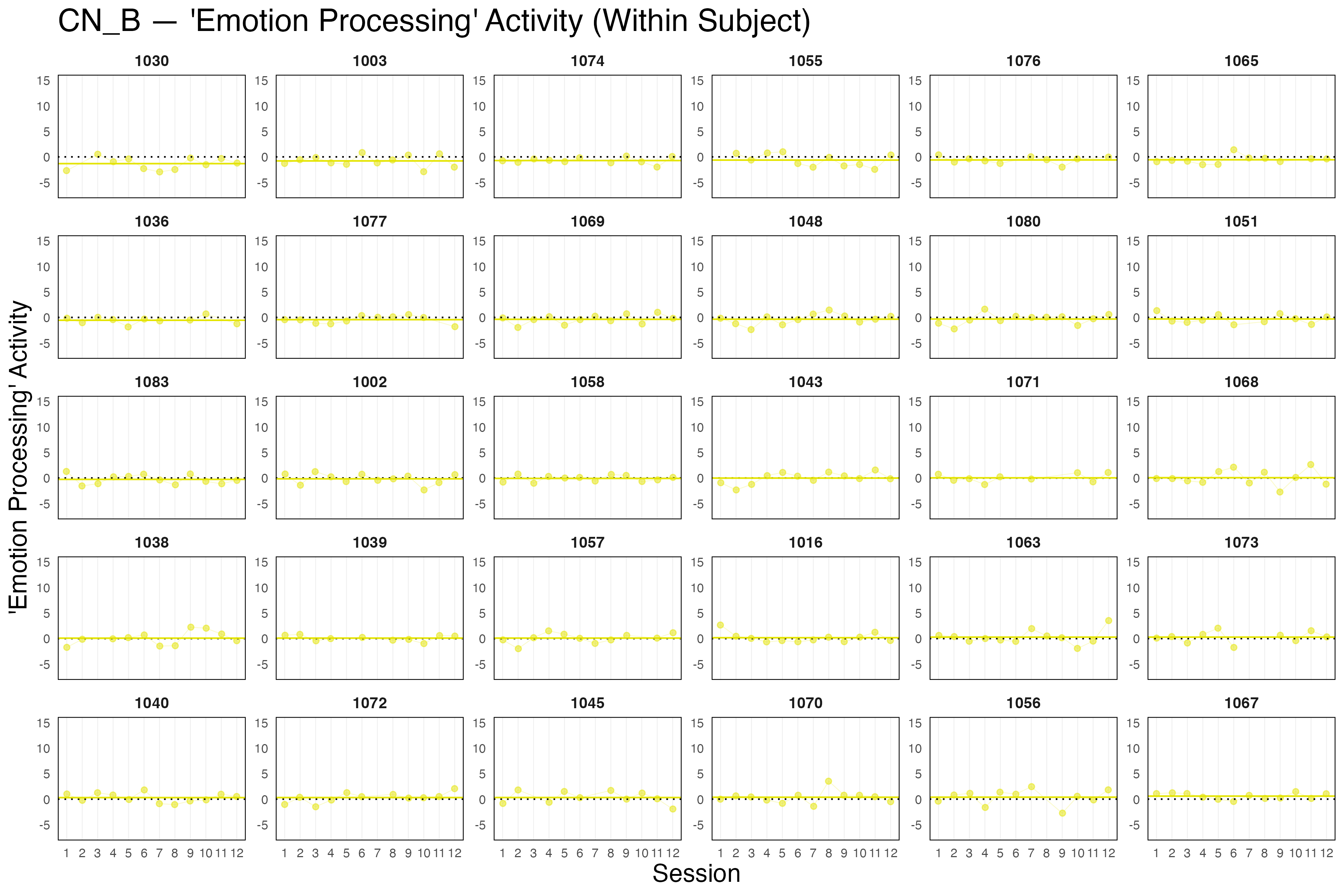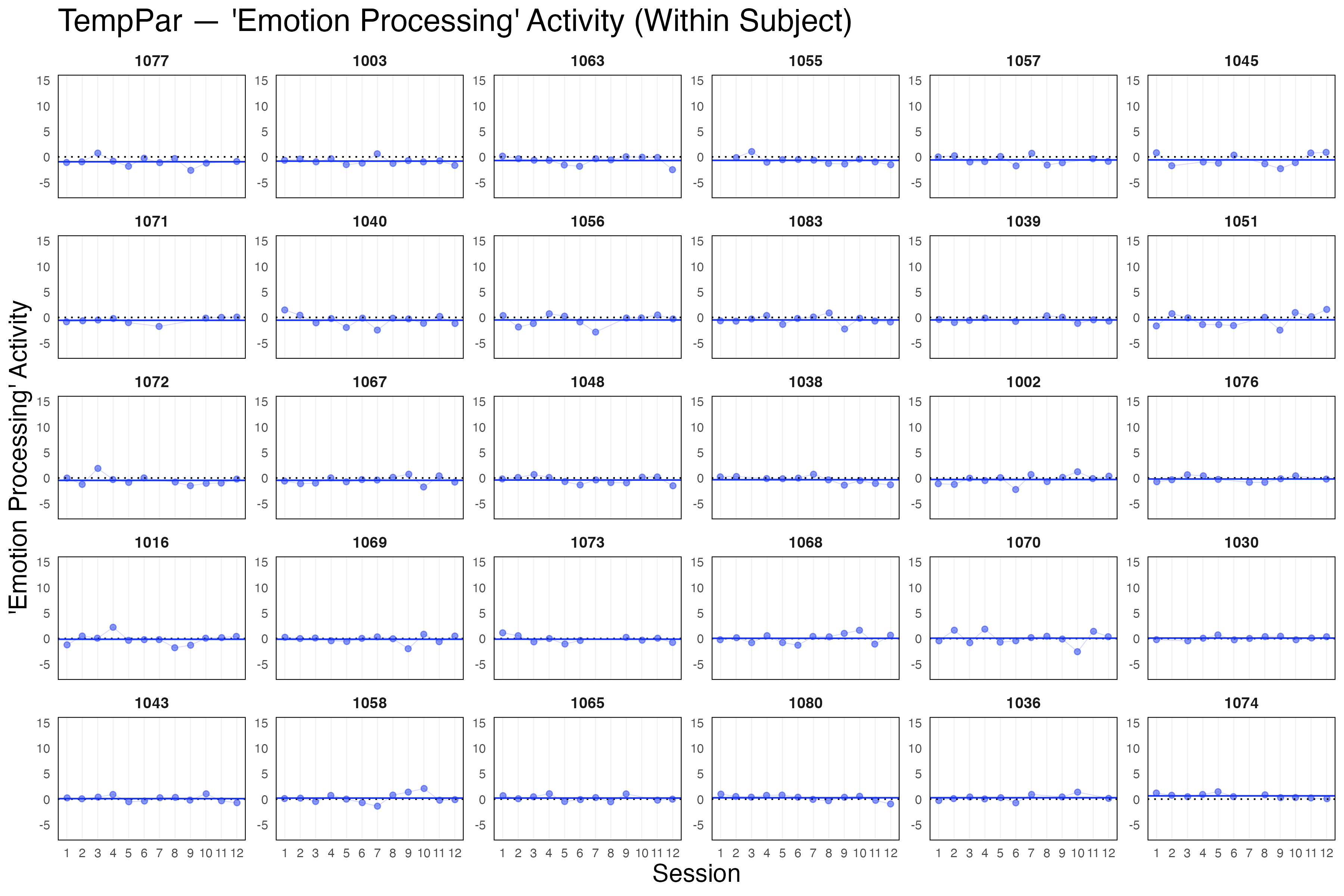Amygdala. By reviewing the between-subject plots, we can see that the within-subject variability in ‘emotion processing’ activity in the amygdala (the transparent points) is as large or larger than the between-subject variability.