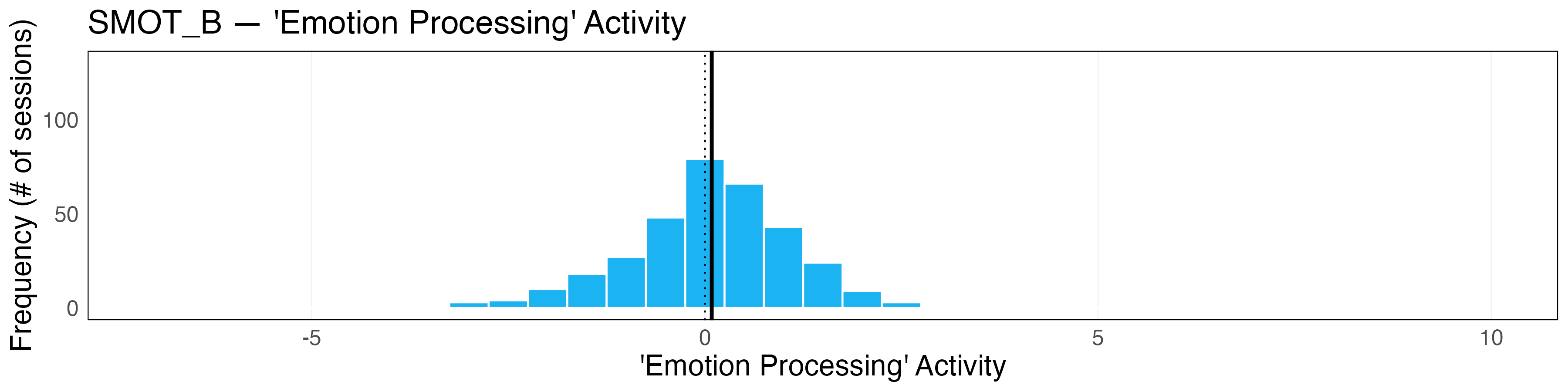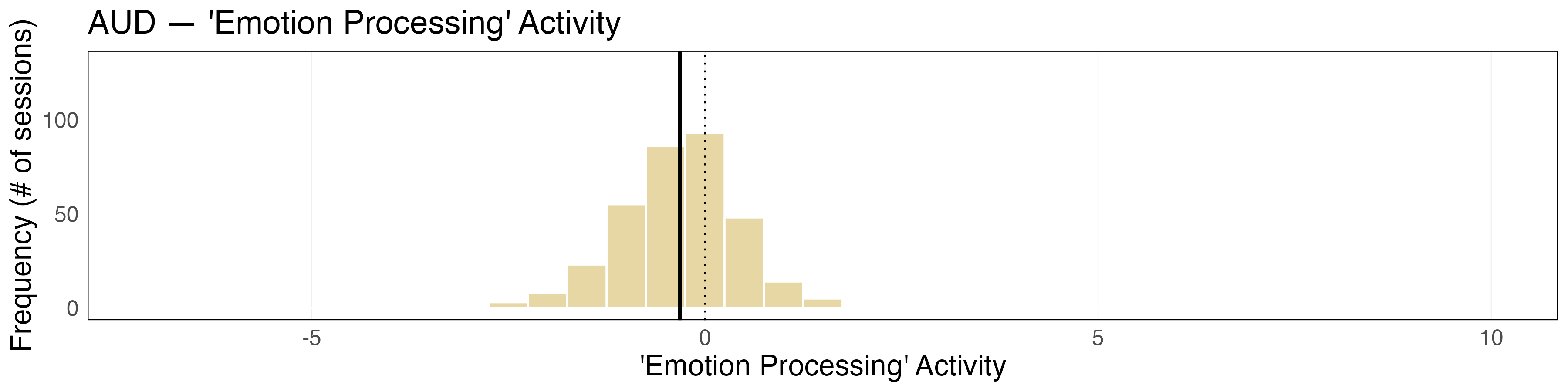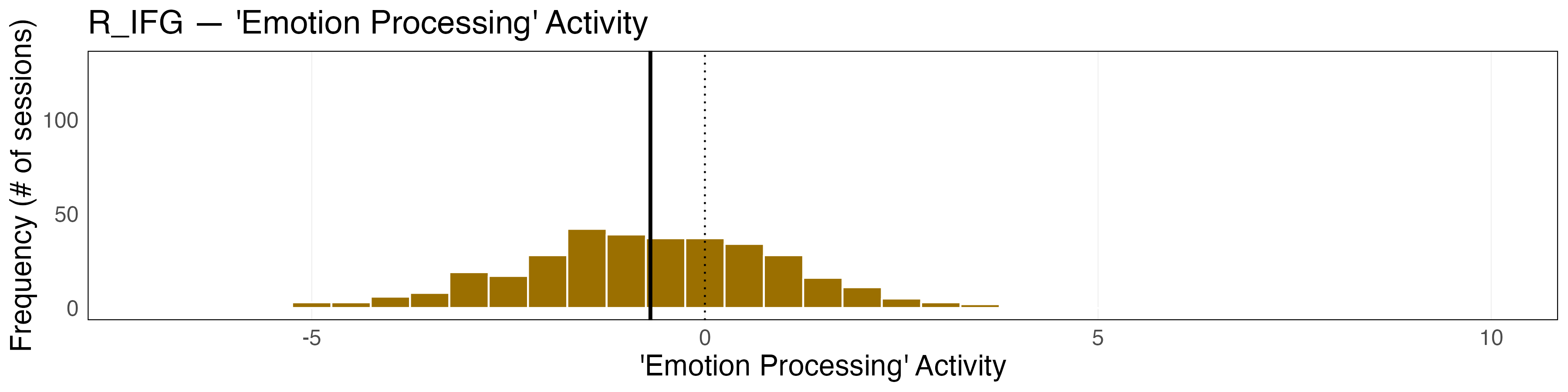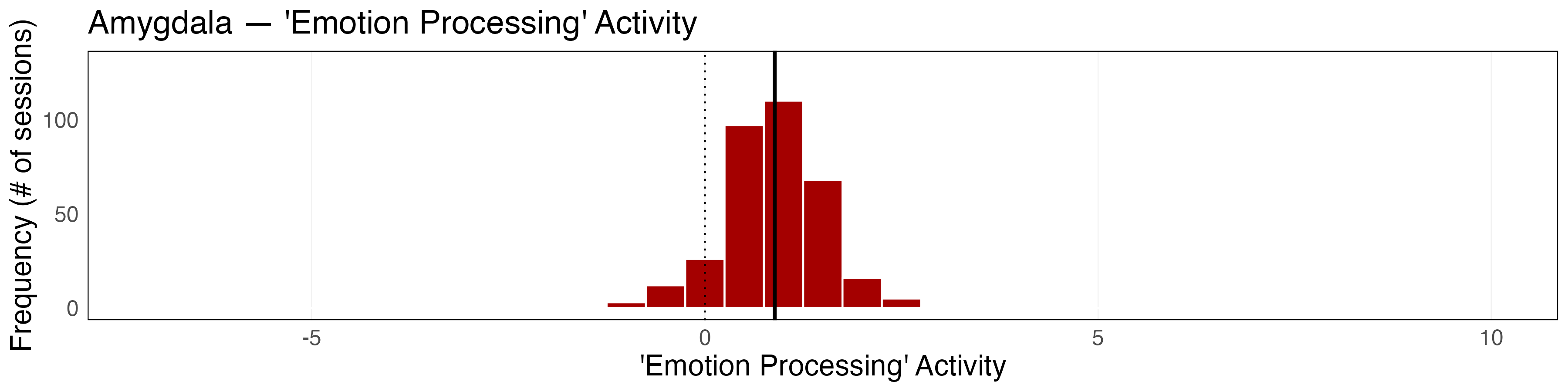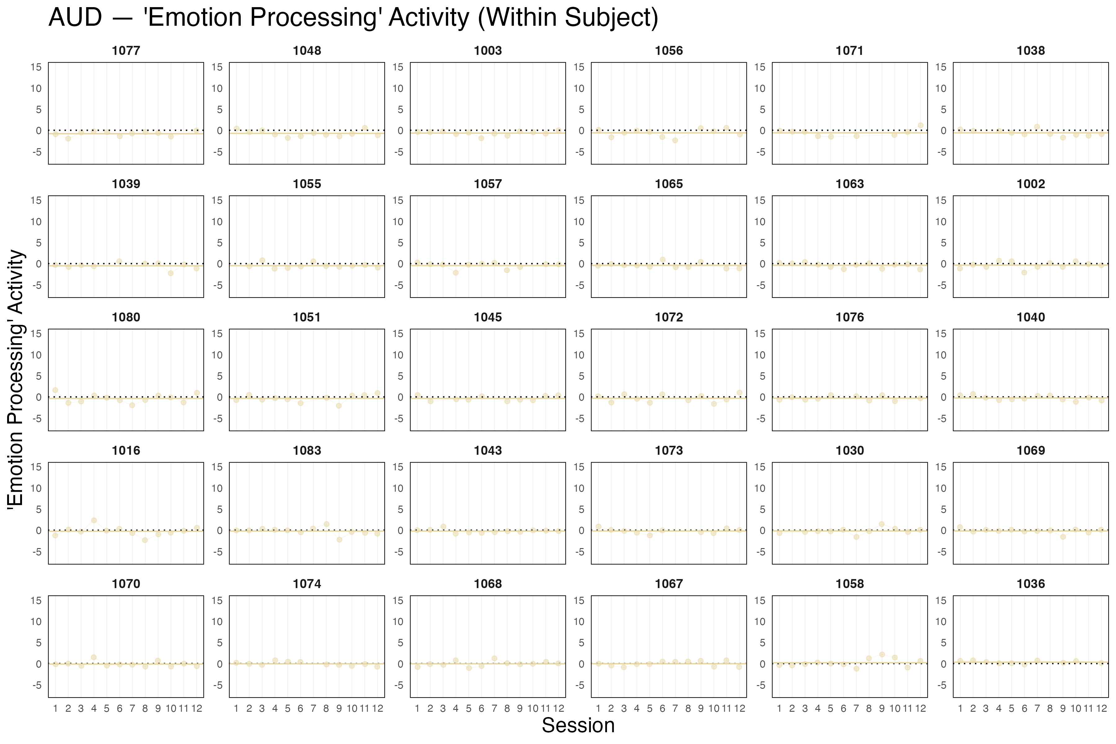 Amygdala. By reviewing the between-subject plots, we can see that the within-subject variability in ‘emotion processing’ activity in the amygdala (the transparent points) is as large or larger than the between-subject variability.