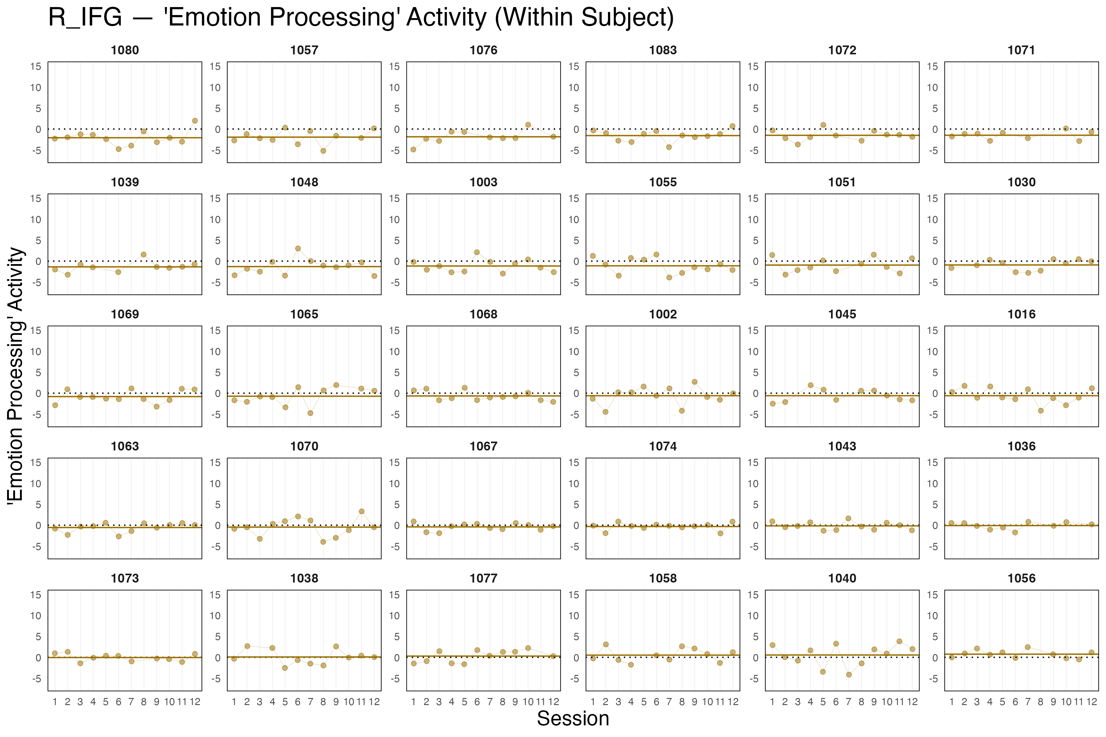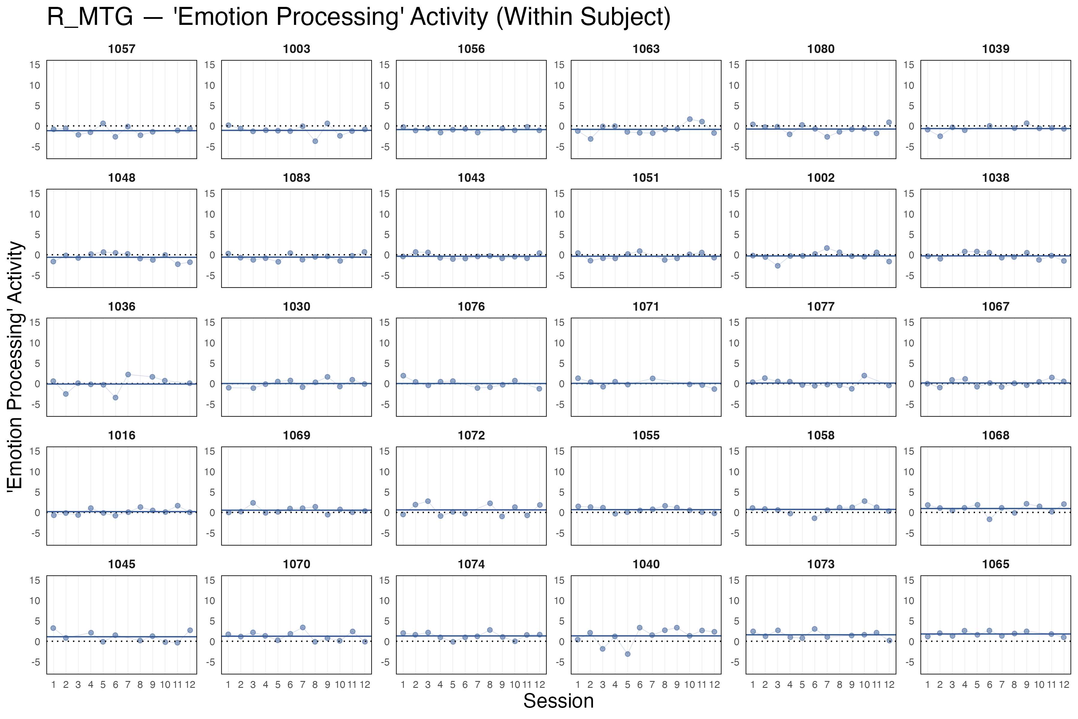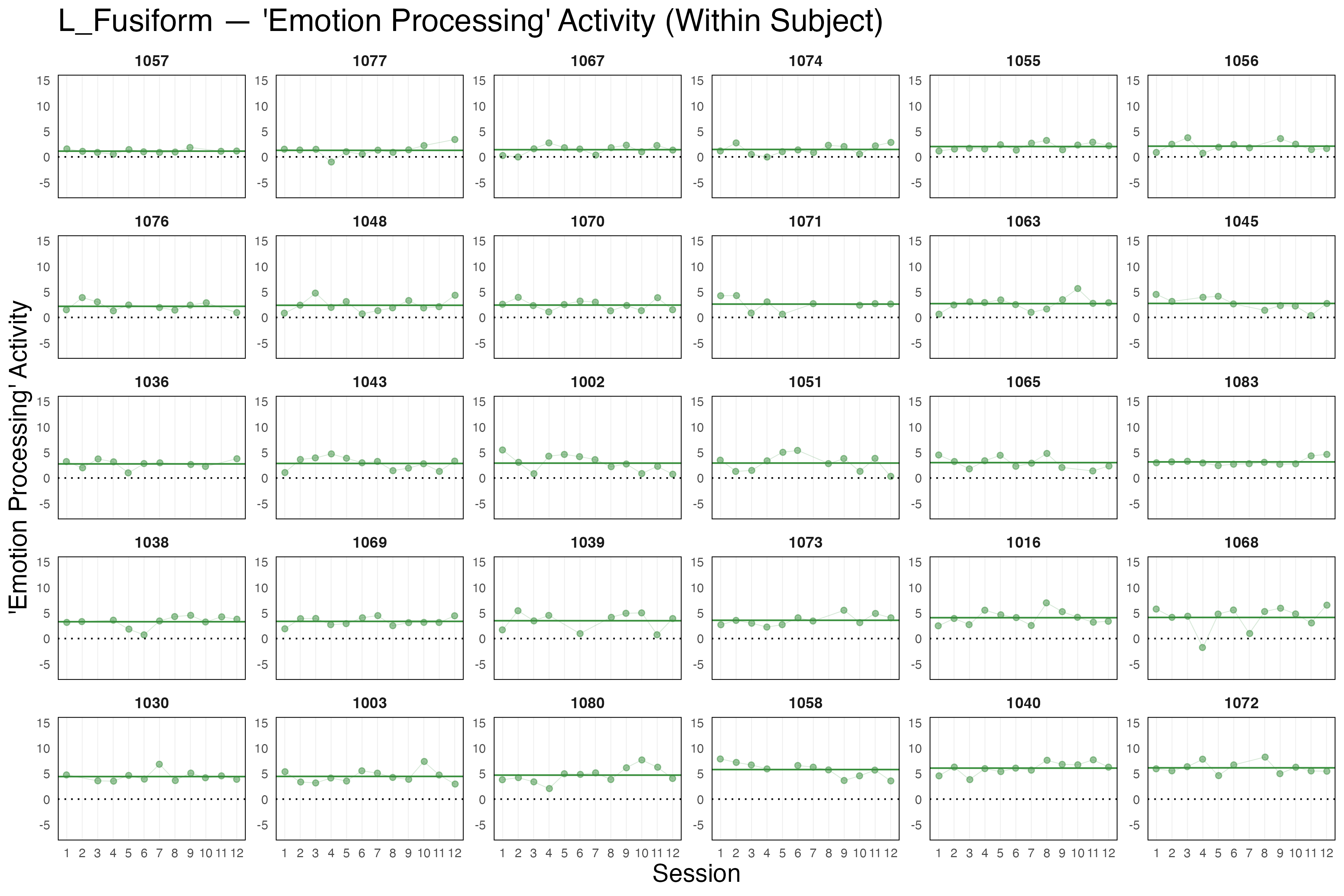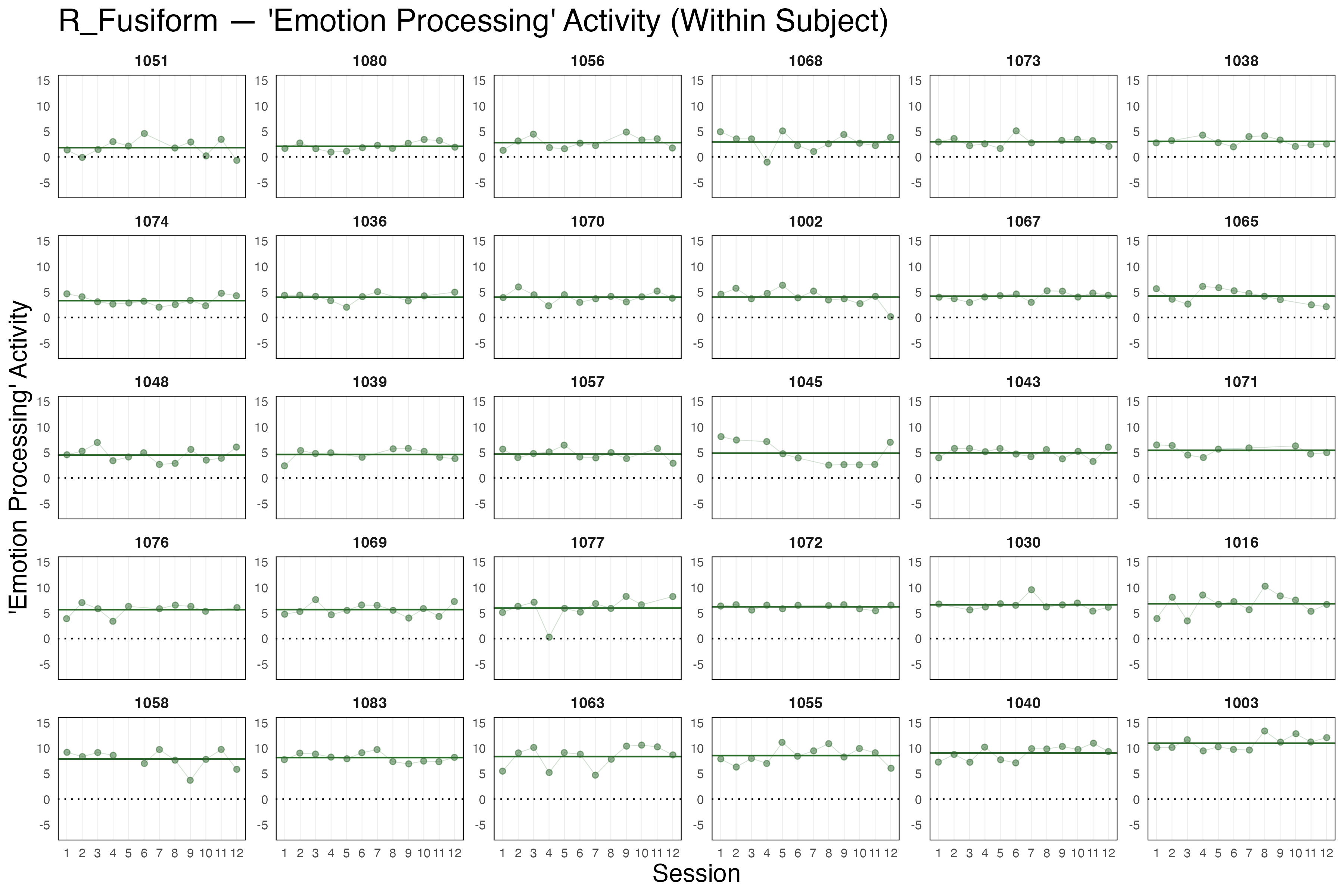 Right Fusiform. The between-subject plot for the right fusiform illustrates the high degree of between-subject variability of in ‘emotion processing’ activity observed. While subjects on average show increases in right fusifom during ‘emotion processing’, the extent to which subjects show this effect varies notably. Interestingly, while there is a notable between-subject variability, there is also notable within-person variability, suggesting that not all the variability in activity within this region is driven by between-subject differences — there is also notable within-person variability across the sessions.