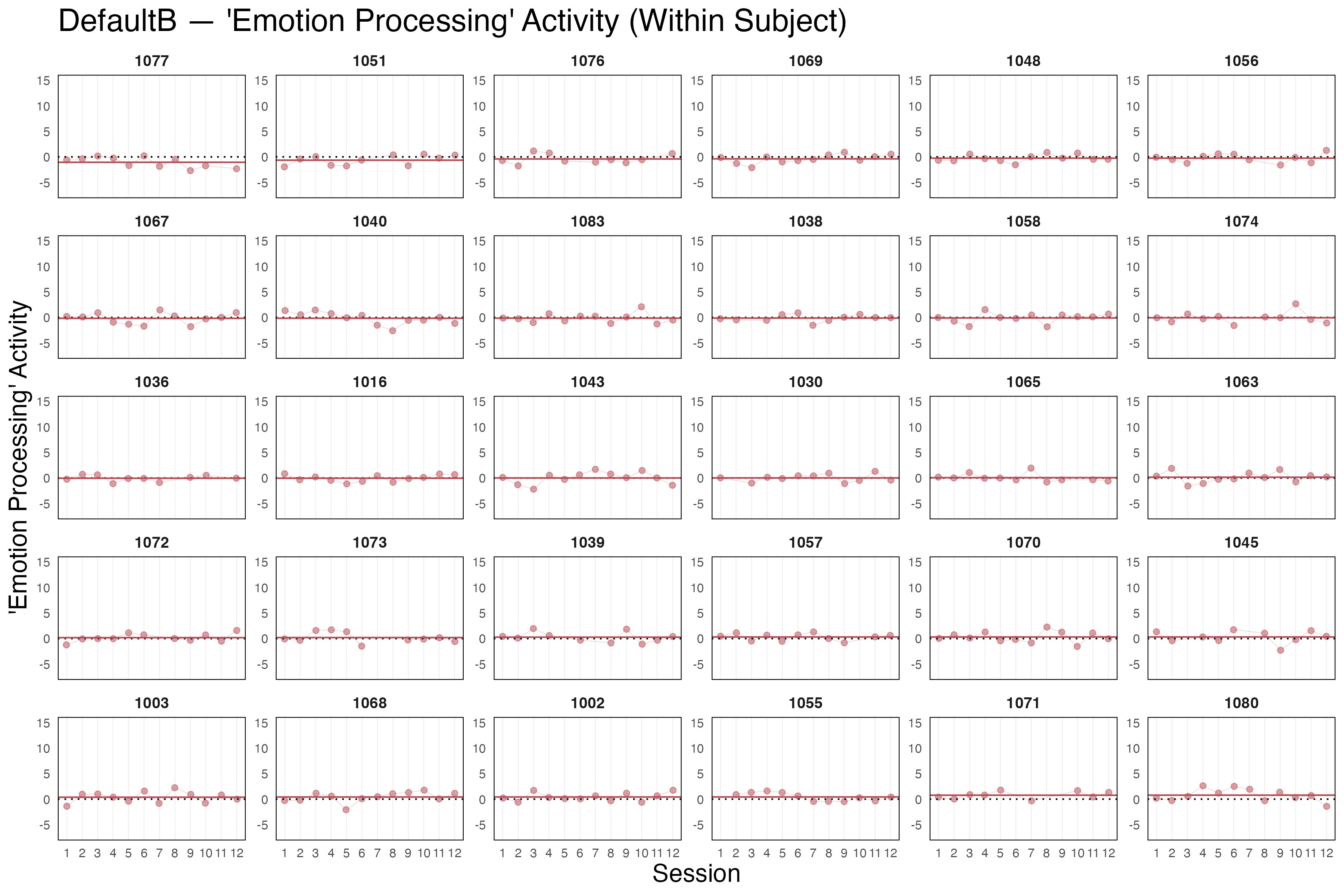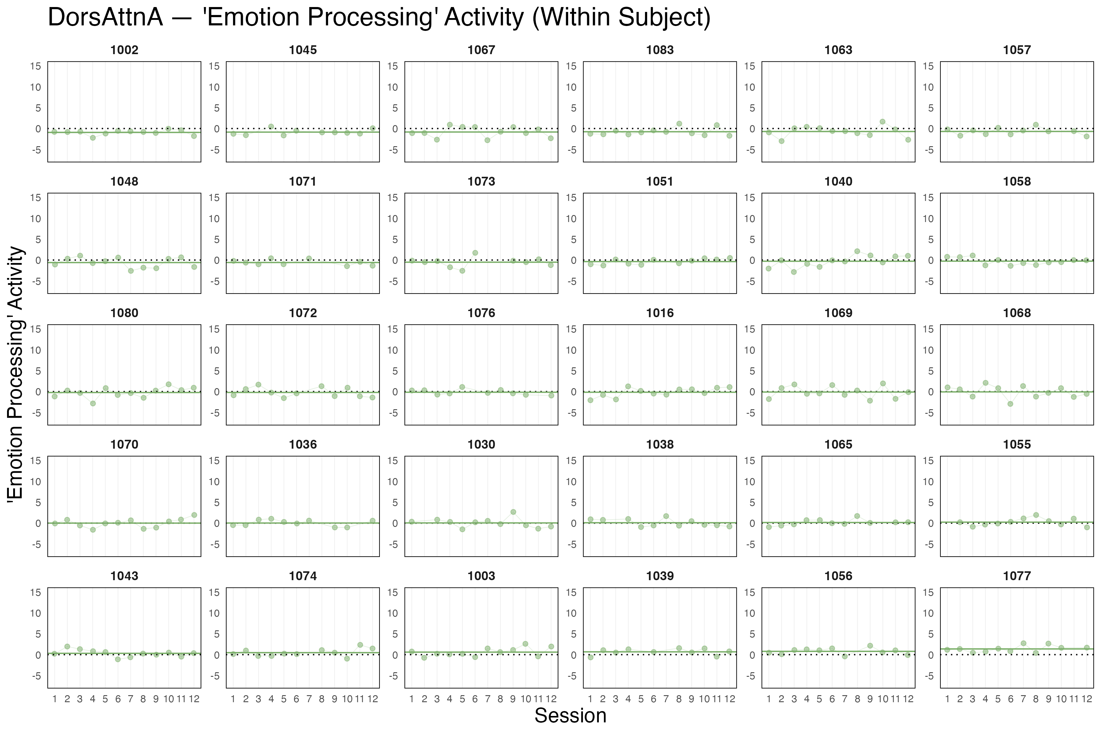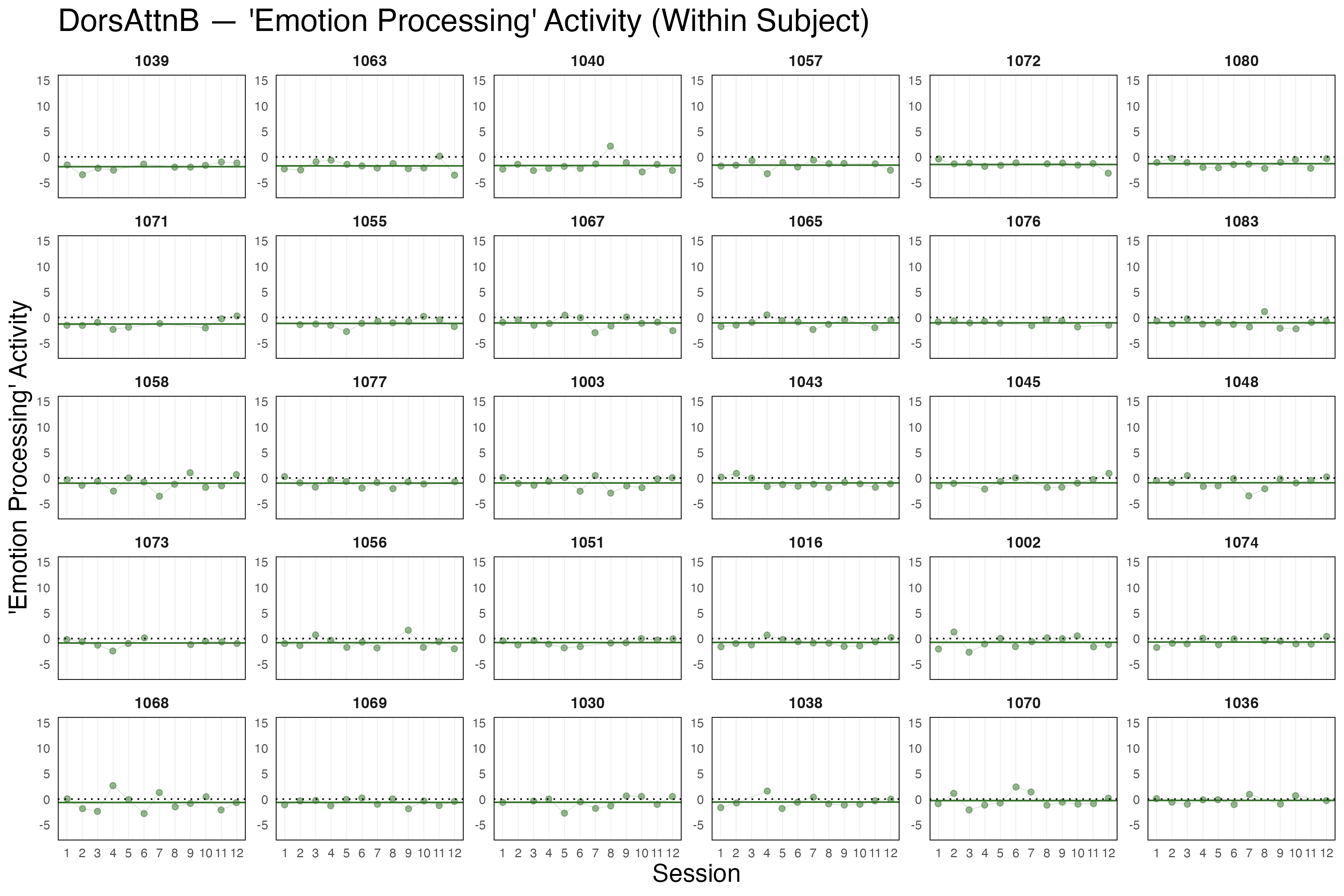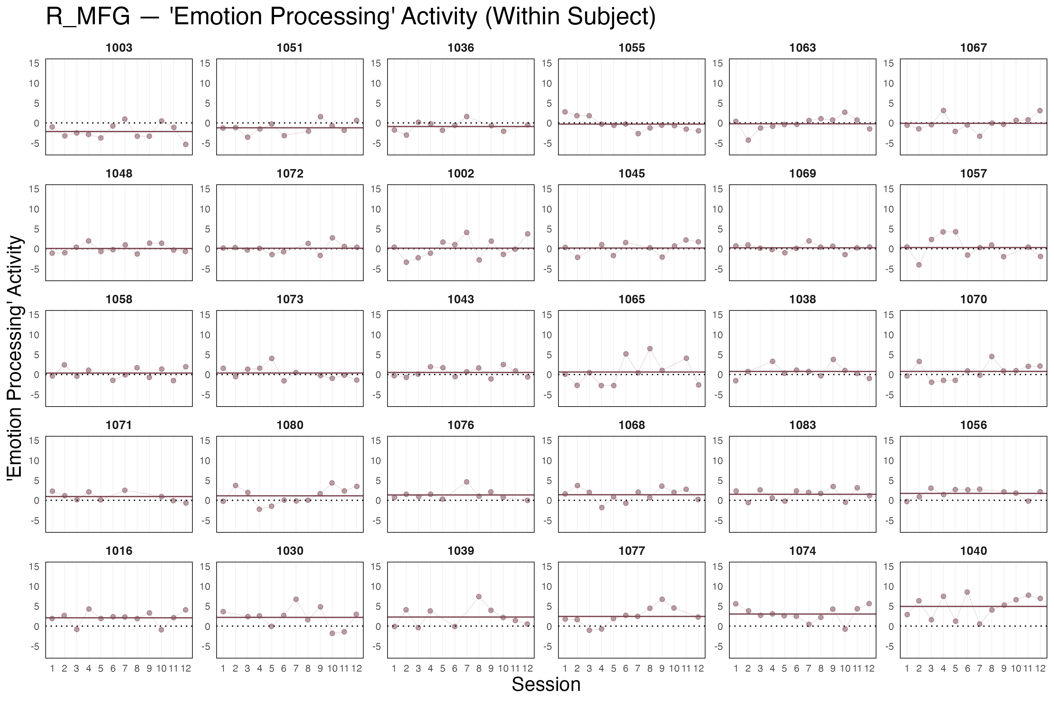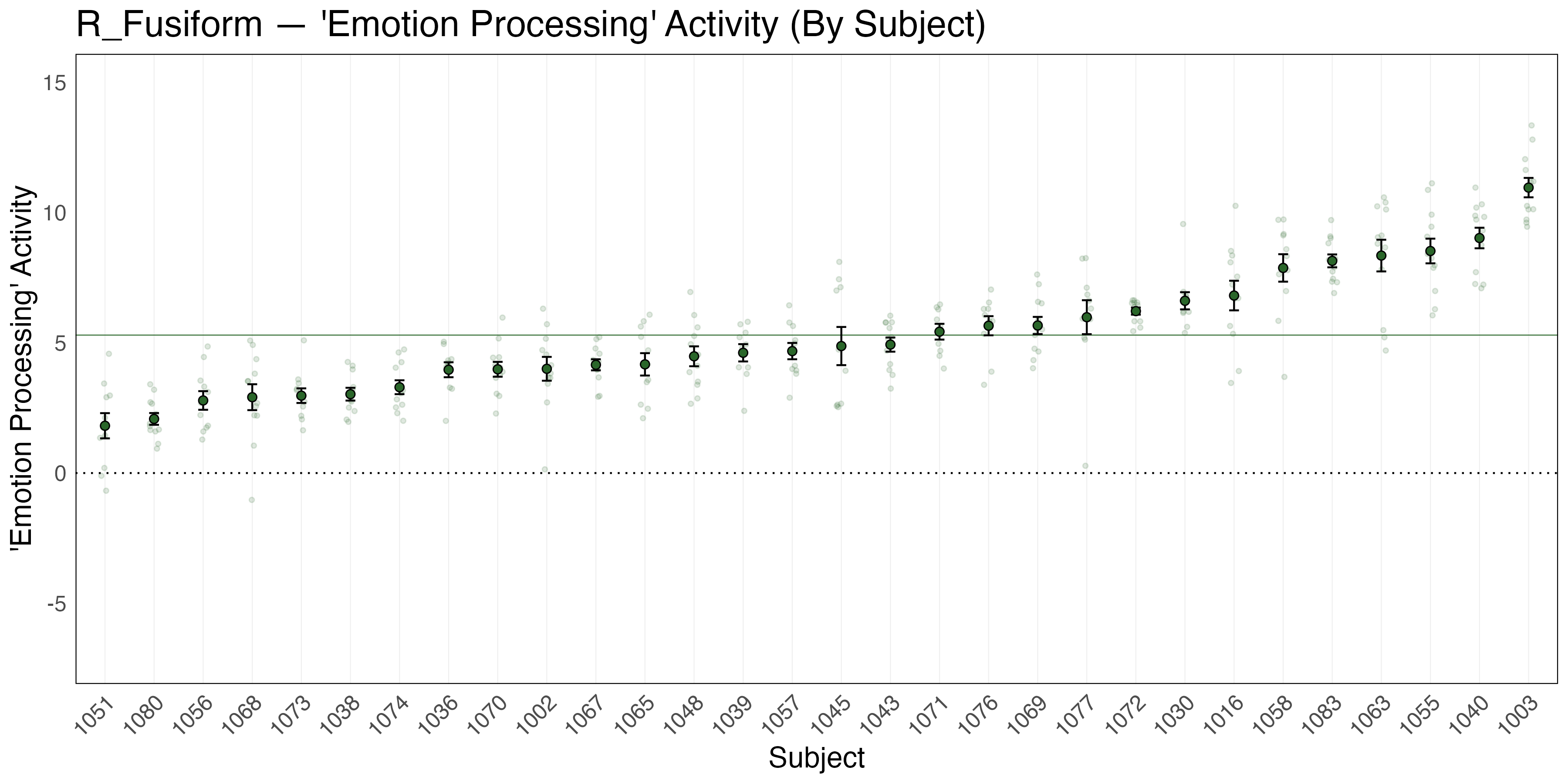 Right Fusiform. The between-subject plot for the right fusiform illustrates the high degree of between-subject variability of in ‘emotion processing’ activity observed. While subjects on average show increases in right fusifom during ‘emotion processing’, the extent to which subjects show this effect varies notably. Interestingly, while there is a notable between-subject variability, there is also notable within-person variability, suggesting that not all the variability in activity within this region is driven by between-subject differences — there is also notable within-person variability across the sessions.