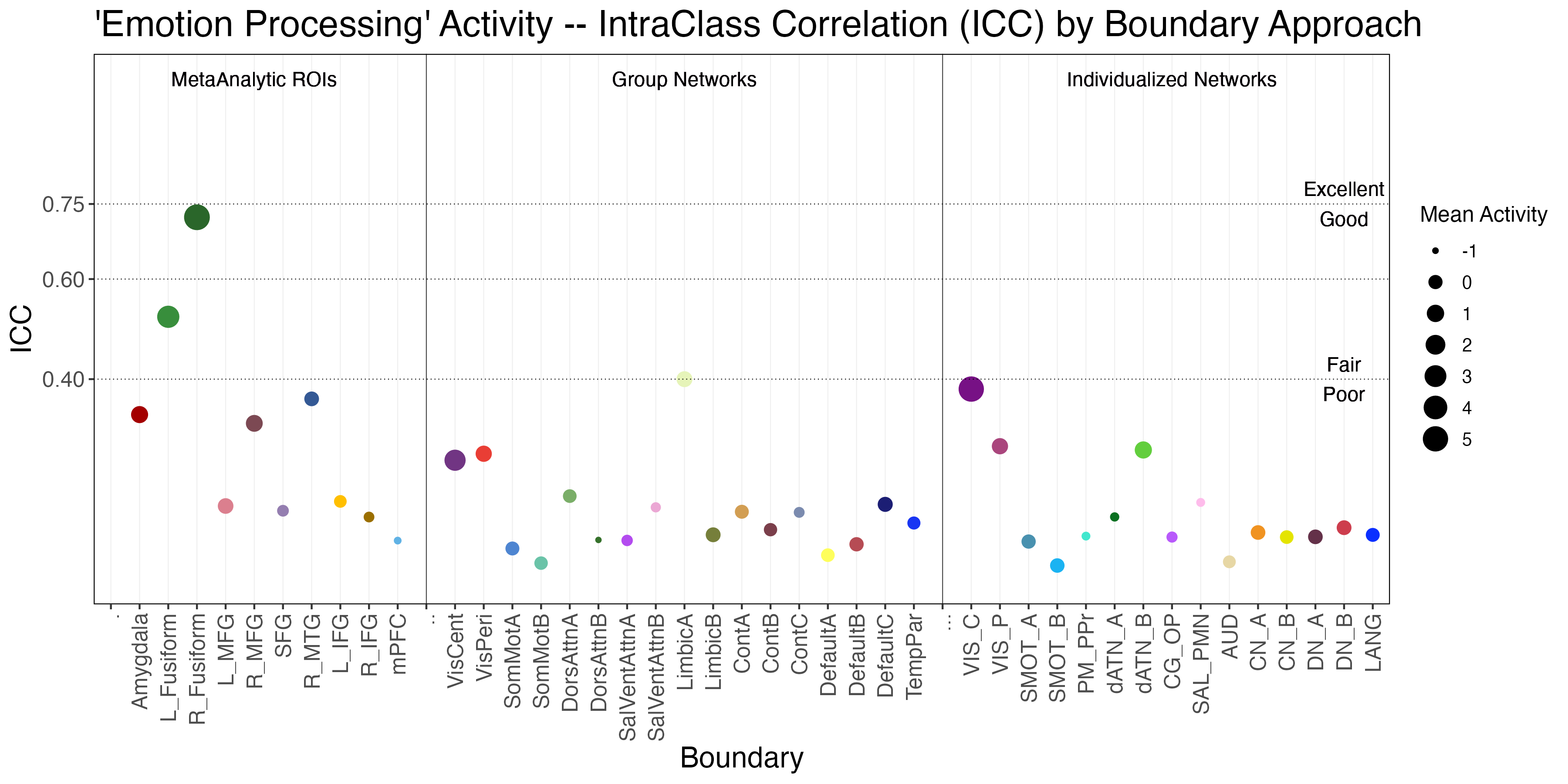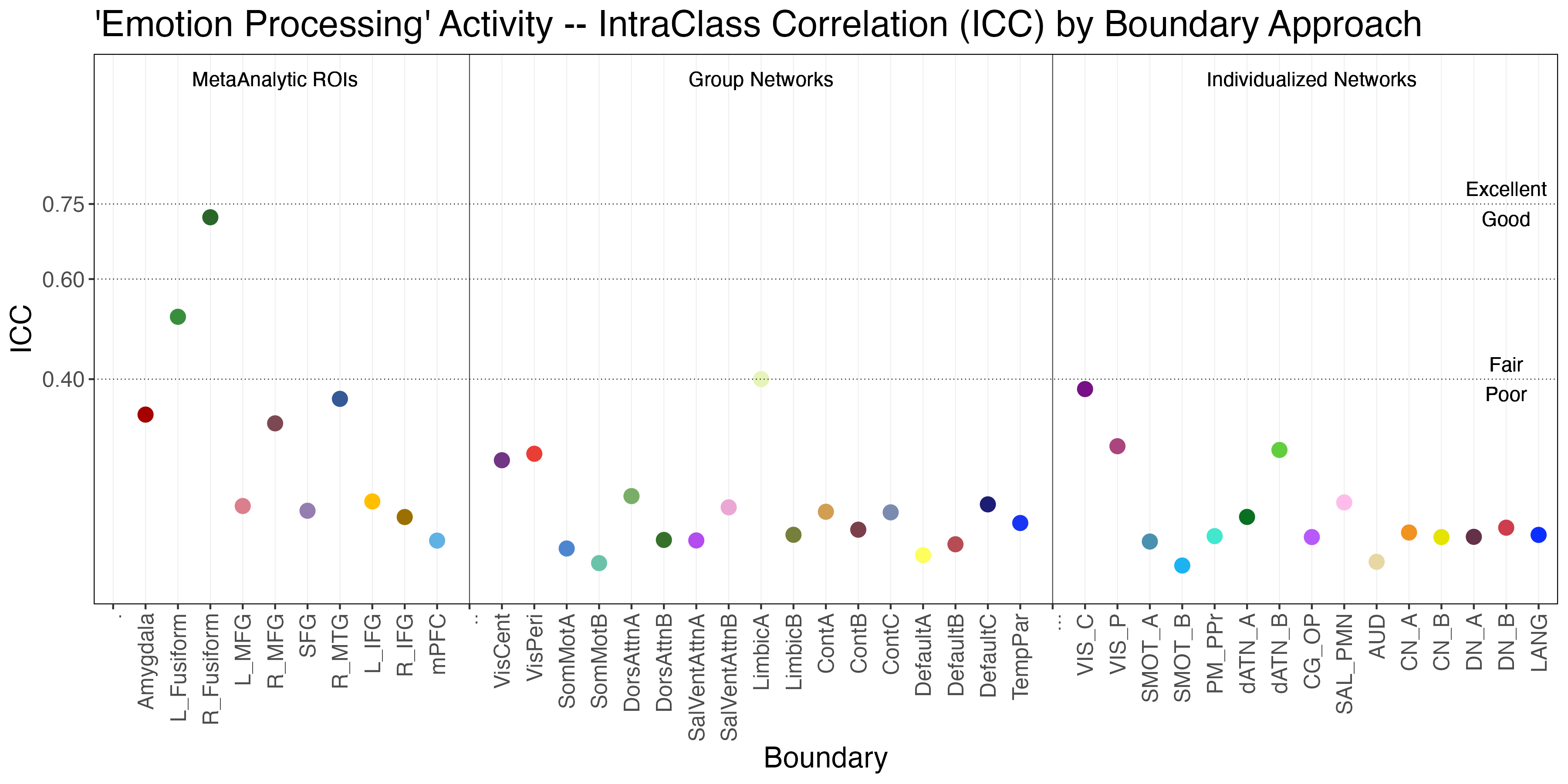 The following plot displays the test-retest reliability of emotion processing activity within the the amygdala, a set of meta-analytically defined regions of interest, group average networks, as well as individualized networks. Here test-retest reliability is estimated using intra class correlations (ICCs) and reflects the temporal stability of activity across participants in the sample (Chen et al., 2021, Koo and Li, 2016; Shrout and Fleiss, 1979). ICCs are the ratio of between-subject variability relative to the total amount of variance in ‘emotion processing’ activity observed within a given boundary (Total Variance: Between-subject variance + Error). ICCs range from 0 to 1, with 1 indicating perfect reliability, such that at timepoint 1, the subject who exhibited the most ‘emotion processing’ activity also exhibited the most ‘emotion processing’ activity at timepoint 2, and so forth (ICC range: Poor (<0.4); Fair (0.4-0.6); Good (0.6-0.75); Excellent (>0.75)(Koo and Li, 2016)). For the purposes of this analysis we will pay particular attention to the boundaries that exhibited significant activity for the contrast of Faces > Shapes as demonstrated in Project 2: the amygdala, the right fusiform, the left fusiform, visual-central network and dorsal attention network B. While we have included the group networks here for reference, they will not be included beyond this reliability analysis.