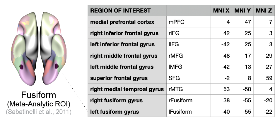 The meta-analytic regions of interest (ROIs) were defined based on anatomically constrained 5mm spheres centered on meta-analytically identified peak activations (Sabatinelli et al., 2011). The meta-analytic ROIs included are the medial prefrontal cortex, middle frontal gyrus, inferior frontal gyrus, posterior cingulate, the parietal lobule, medial temporal gyrus, and the fusiform gyrus. See above for the peak coordinates used to define the ROIs.